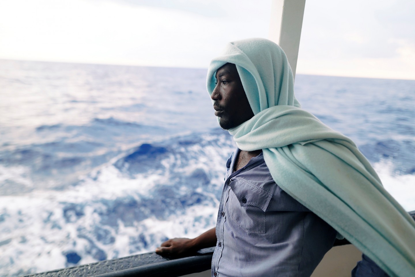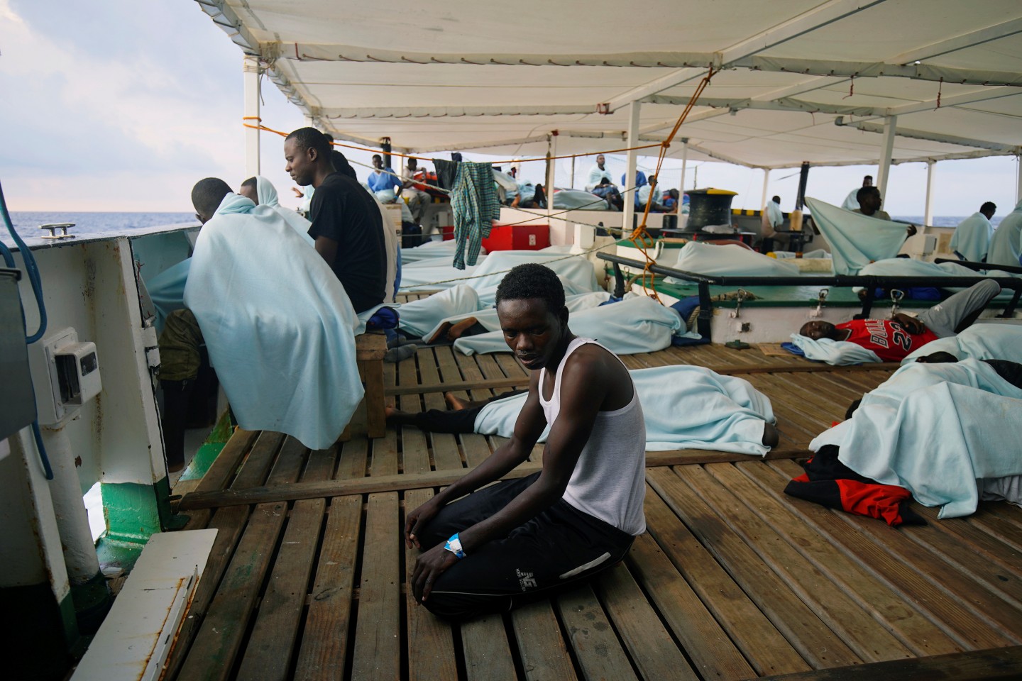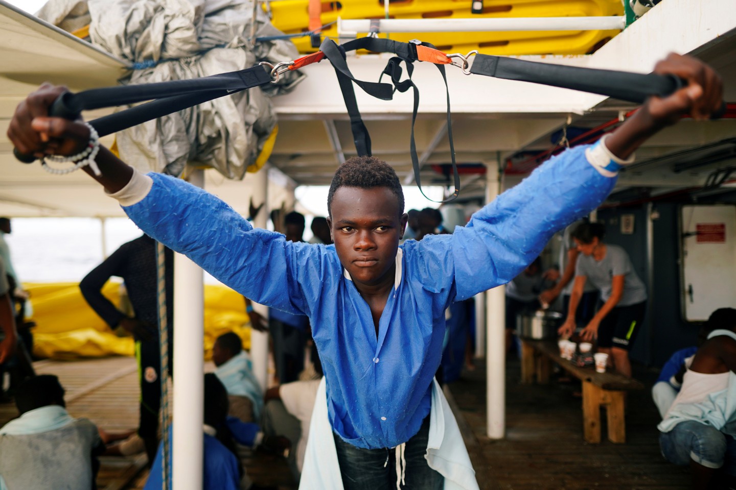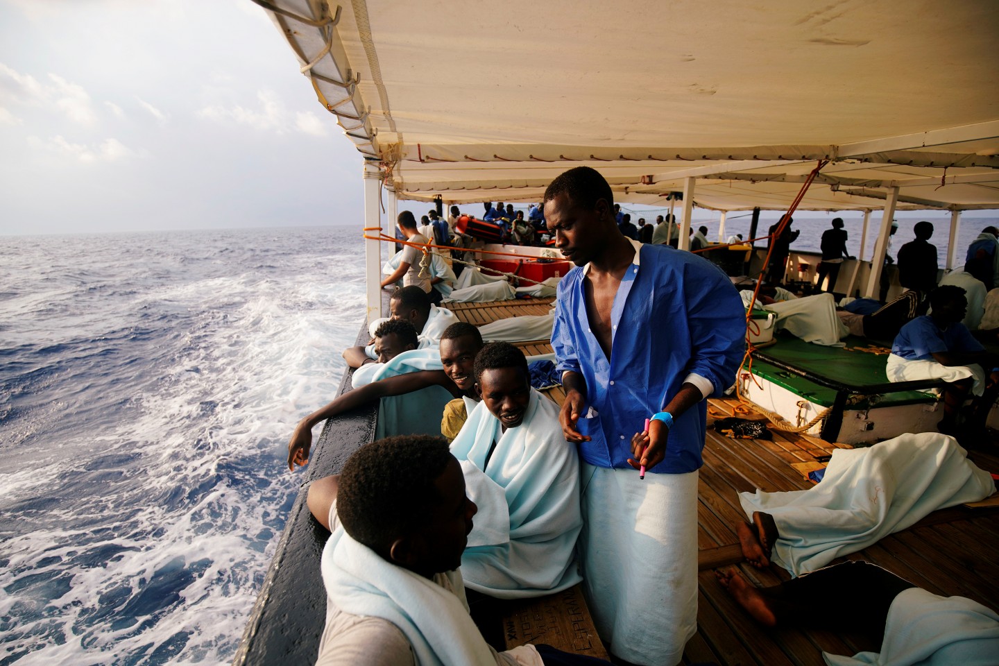 Kārtējā Vidusjūrā izglābtā migrantu grupa iemūžināta fotogrāfijās pirms nonākšanas Eiropā, šajā gadījumā - Spānijas pilsētas Malagas ostā.