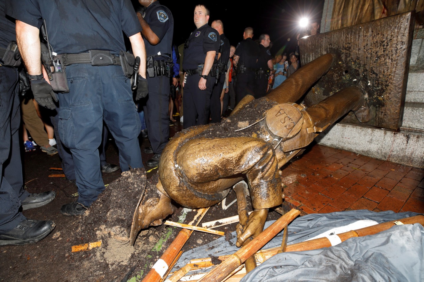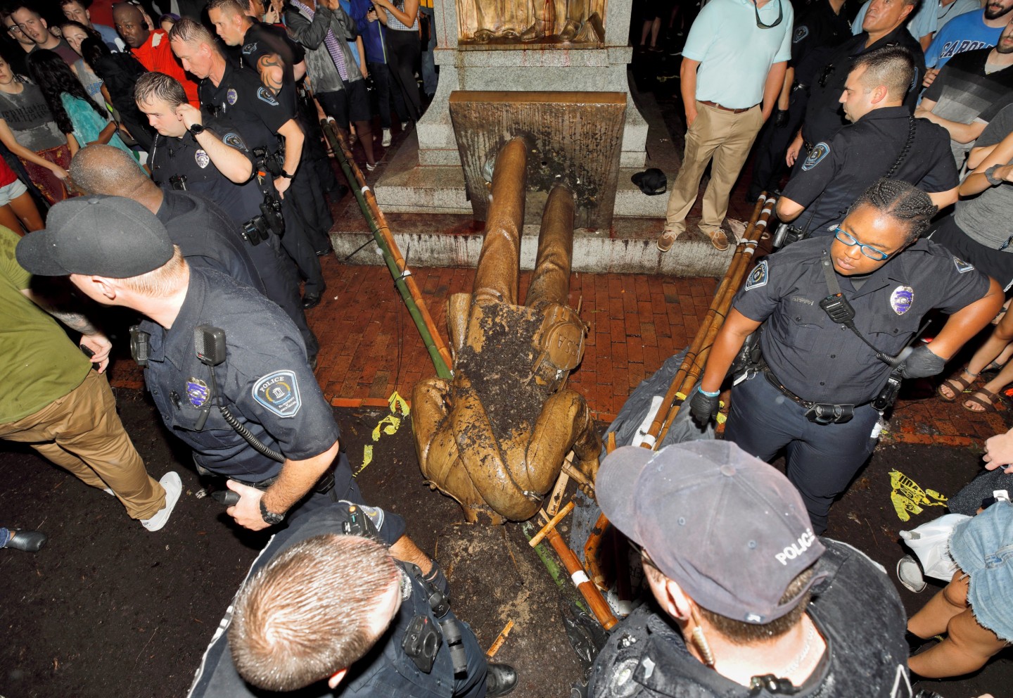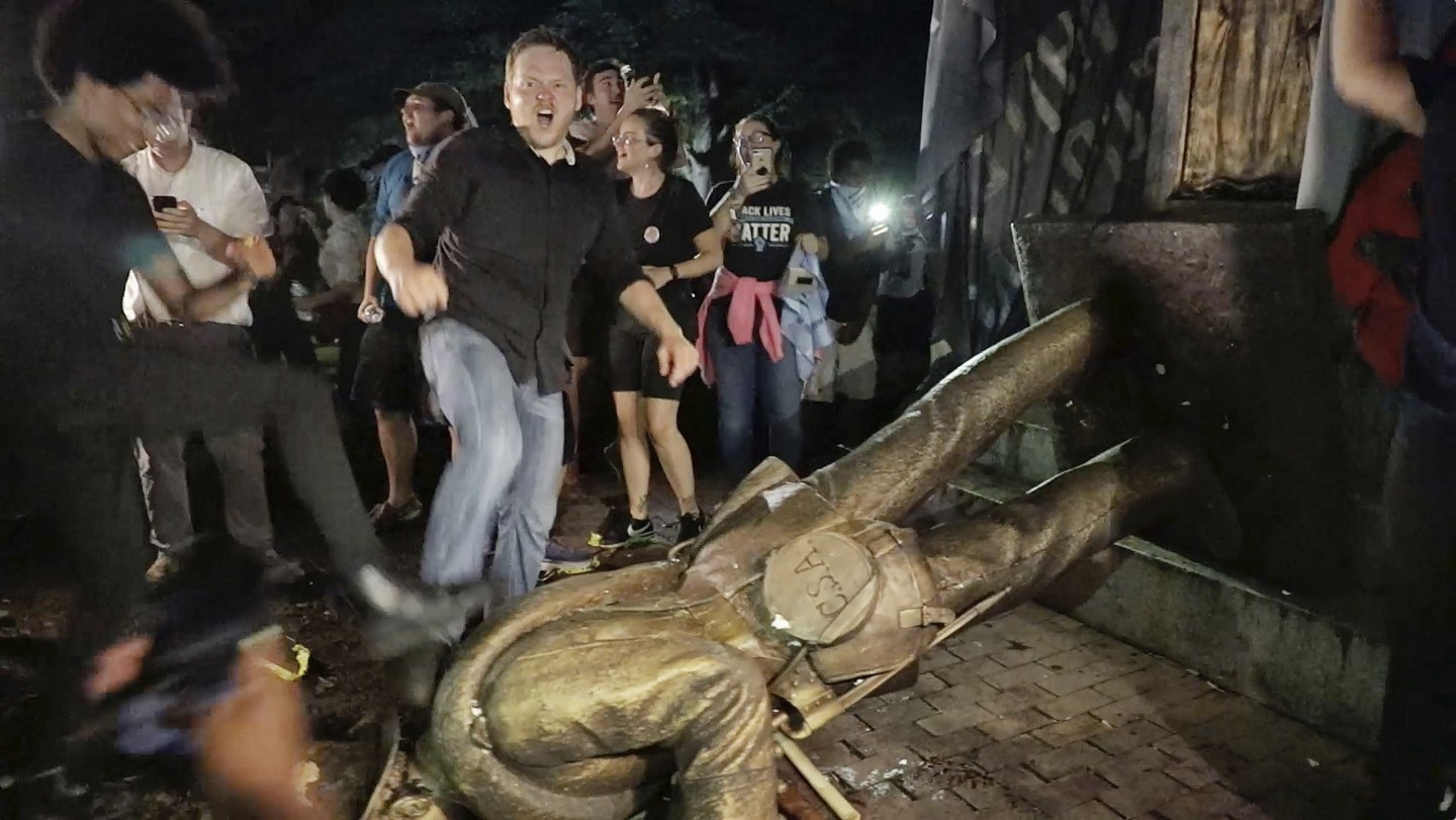Ziemeļkarolīnas universitātes kampusā protesta laikā gāzta gadsimtu vecā konfederātu karavīra ''Klusā Sema'' statuja.