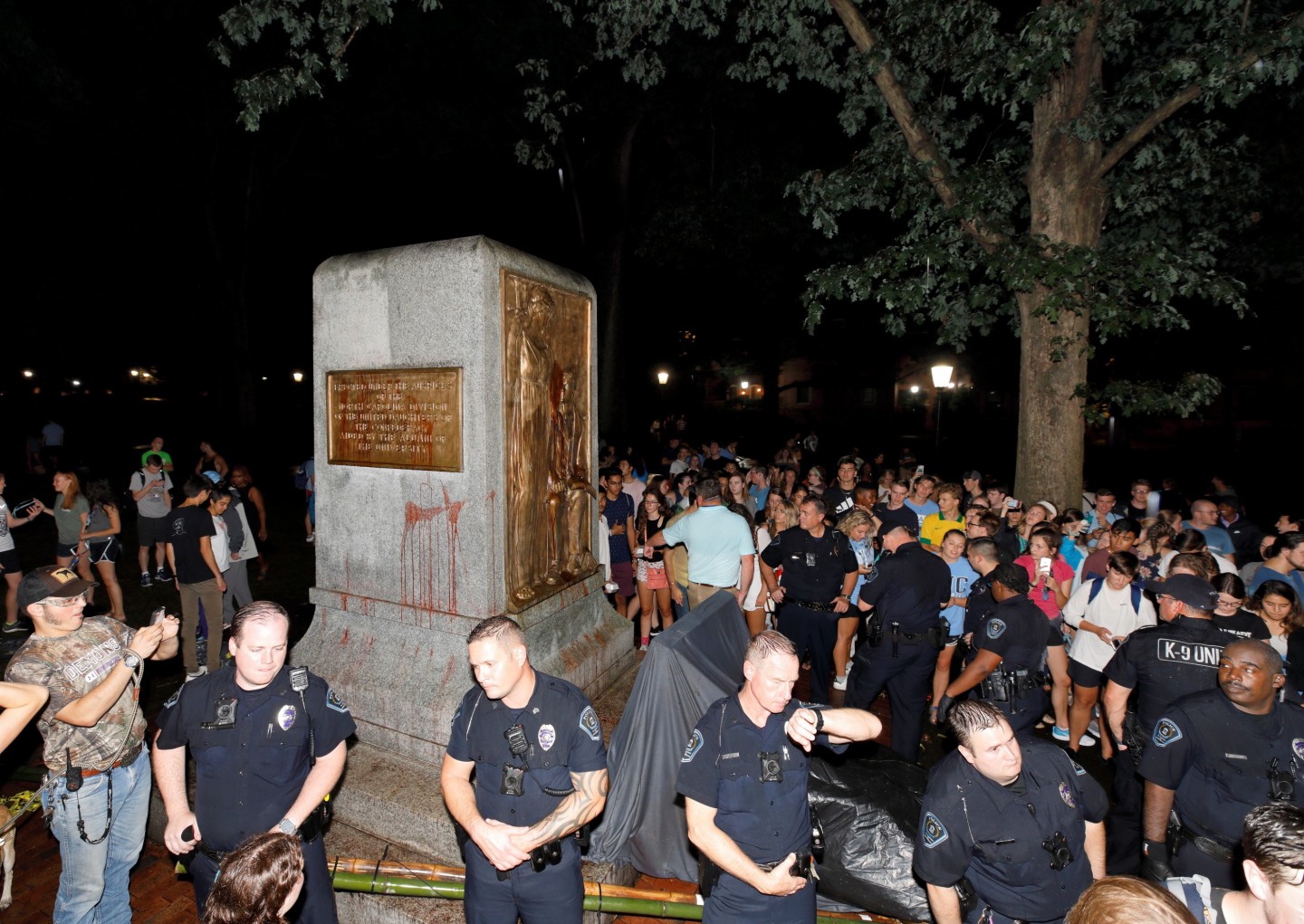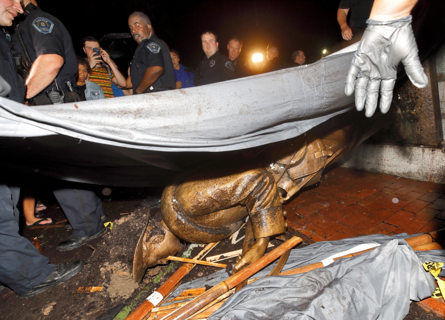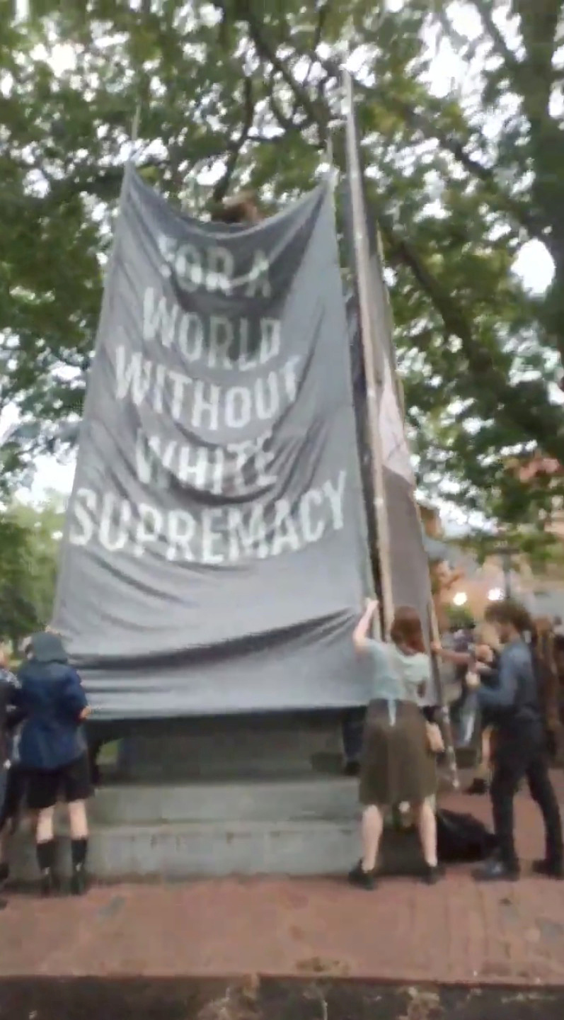 Ziemeļkarolīnas universitātes kampusā protesta laikā gāzta gadsimtu vecā konfederātu karavīra ''Klusā Sema'' statuja.