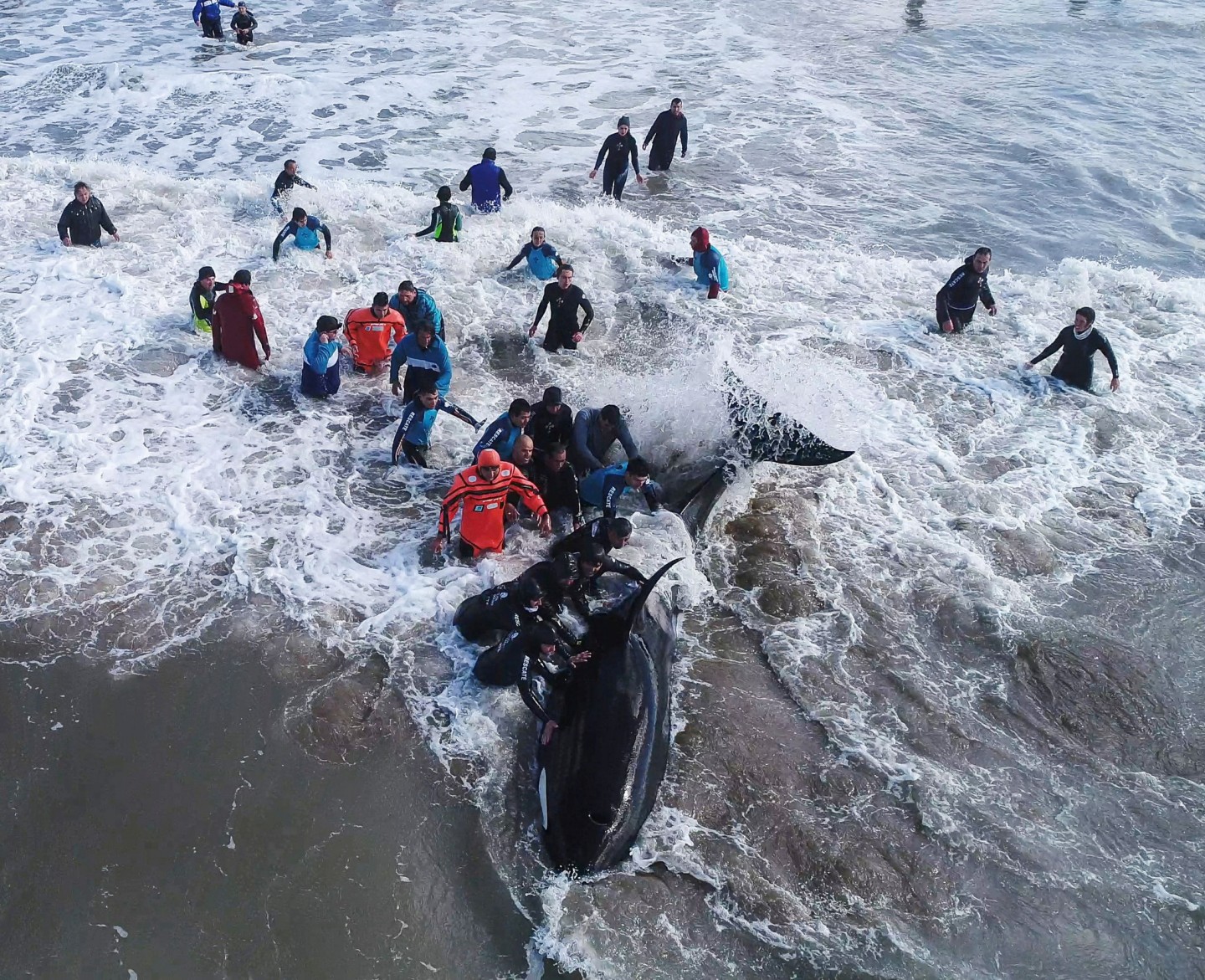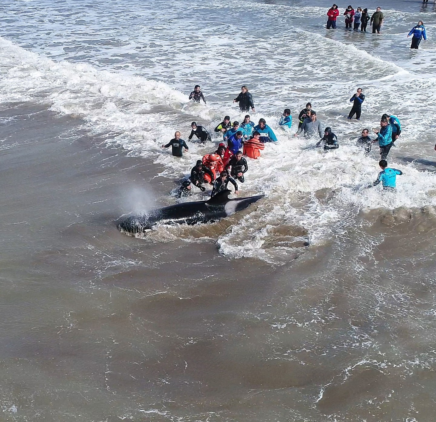 Glabēji Mar del Plata pludmalē Argentīnā izglābuši un atpakaļ jūrā atgriezuši izskalotu zobenvali.
