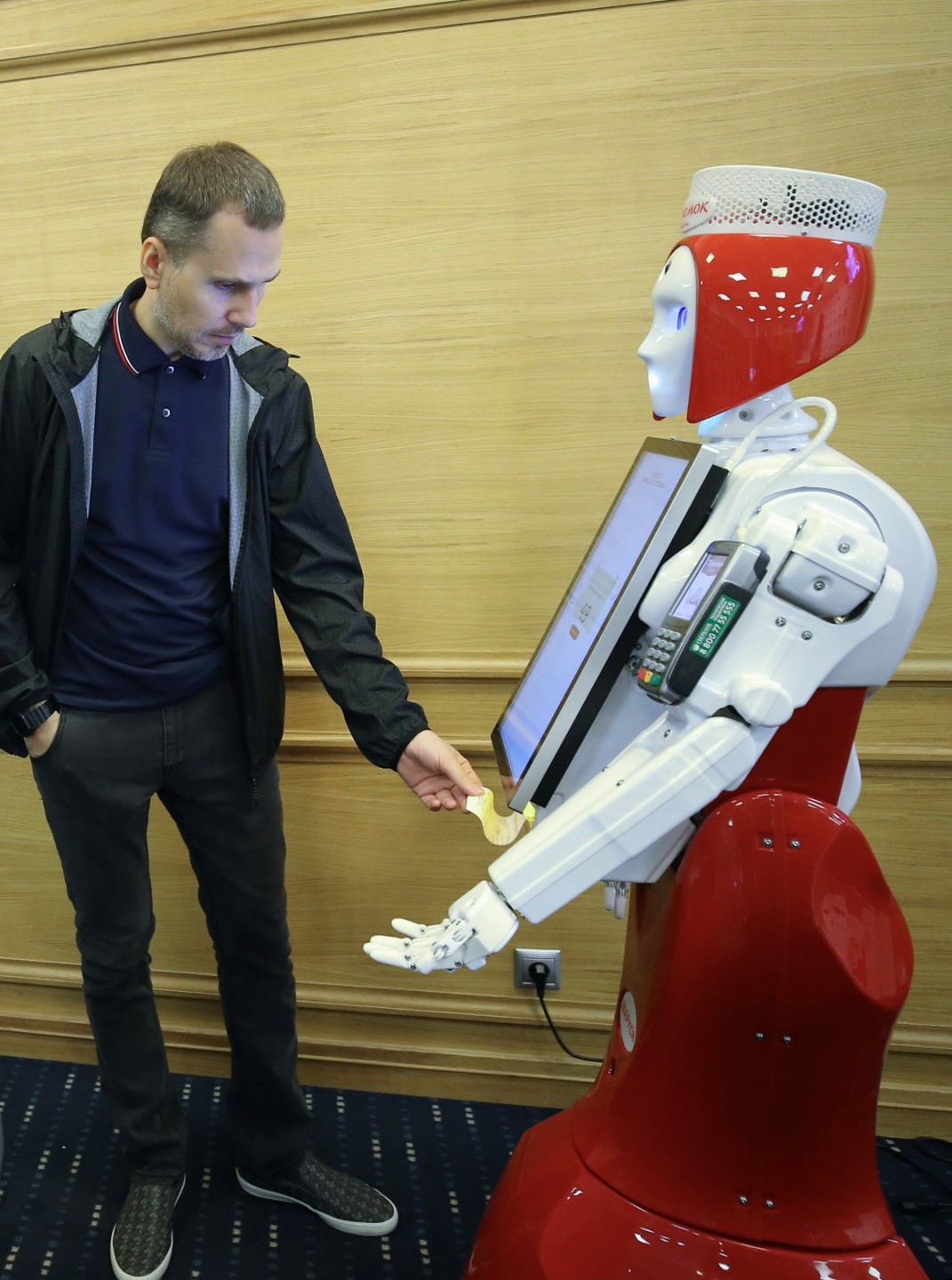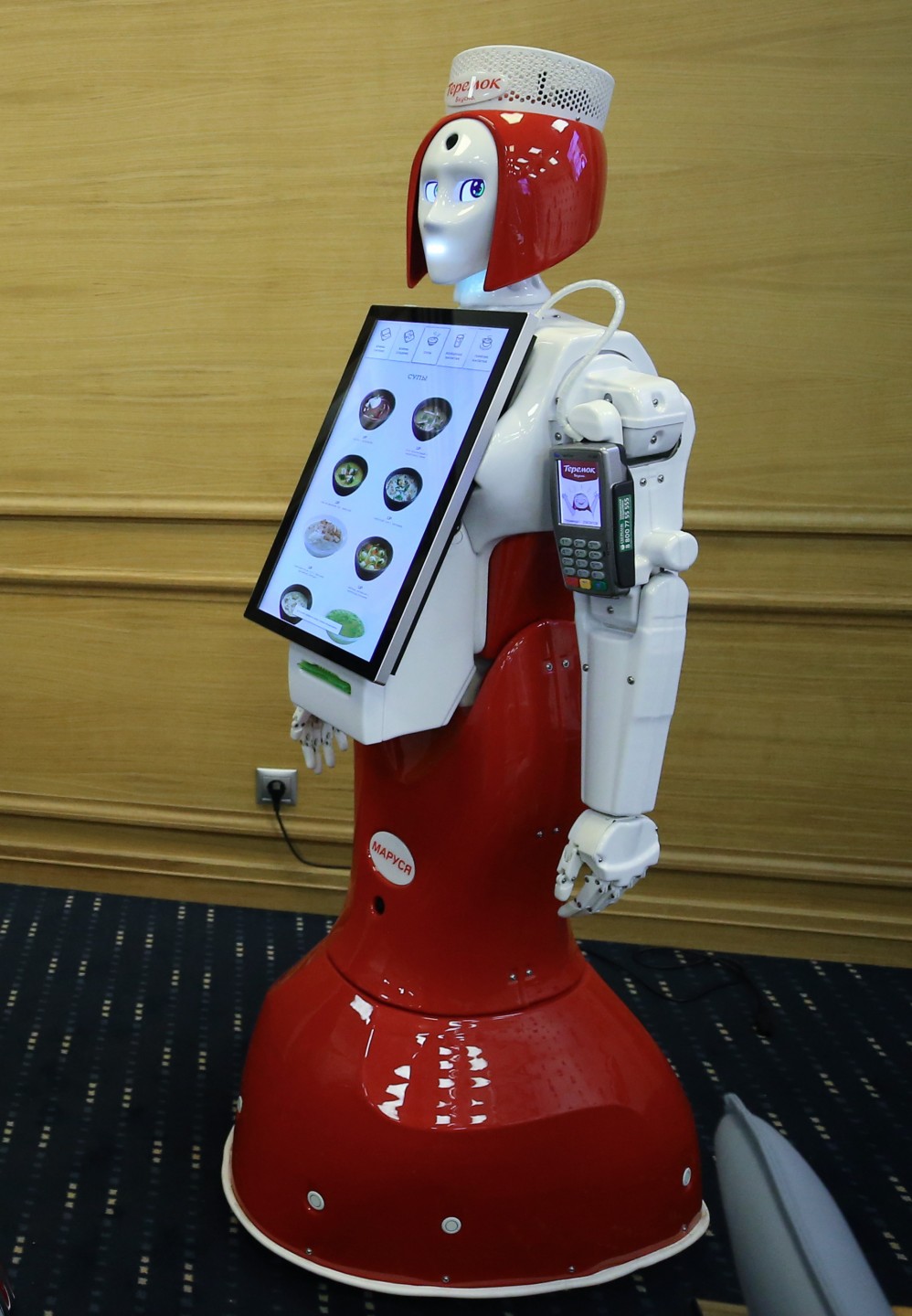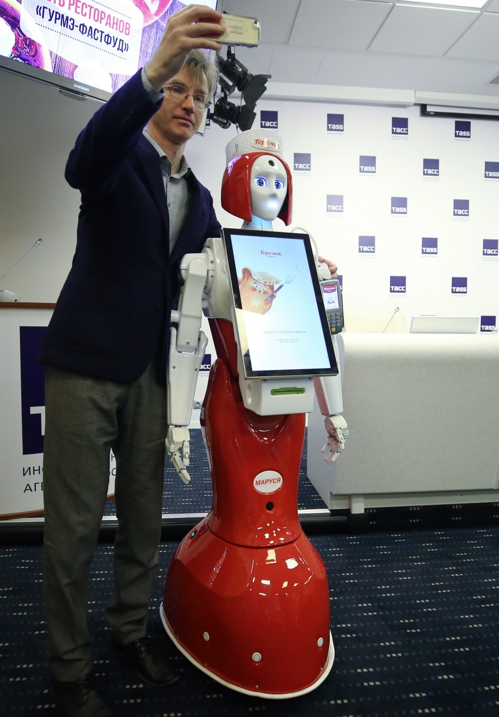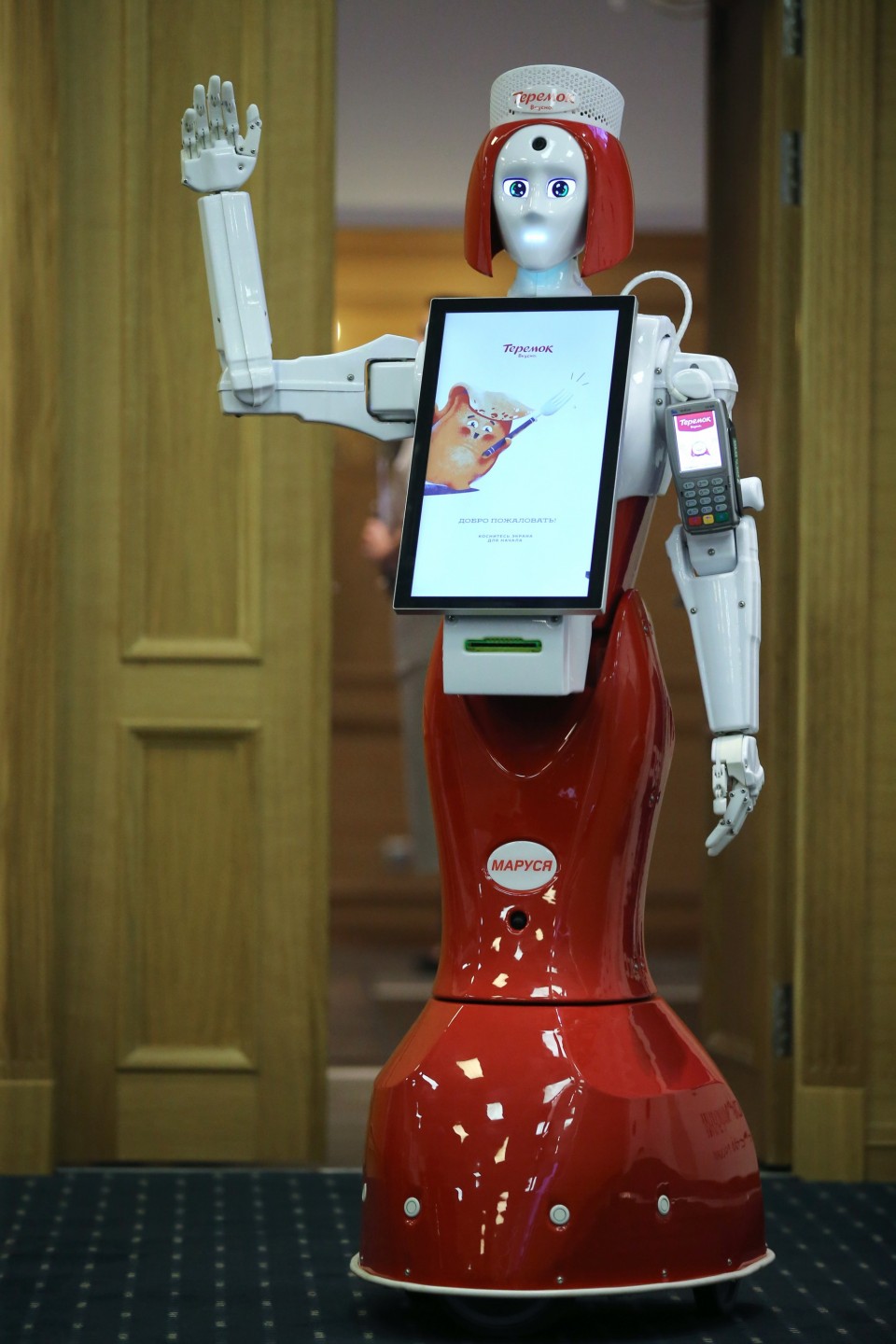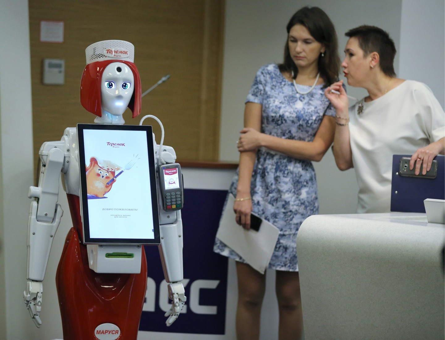 Sanktpēterburgā, Krievijā, ātro ēdināšanas ķēdes “Teremok” ēstuvē klientu pasūtījumus un bankas kartes pieņems robots – Marusja.
