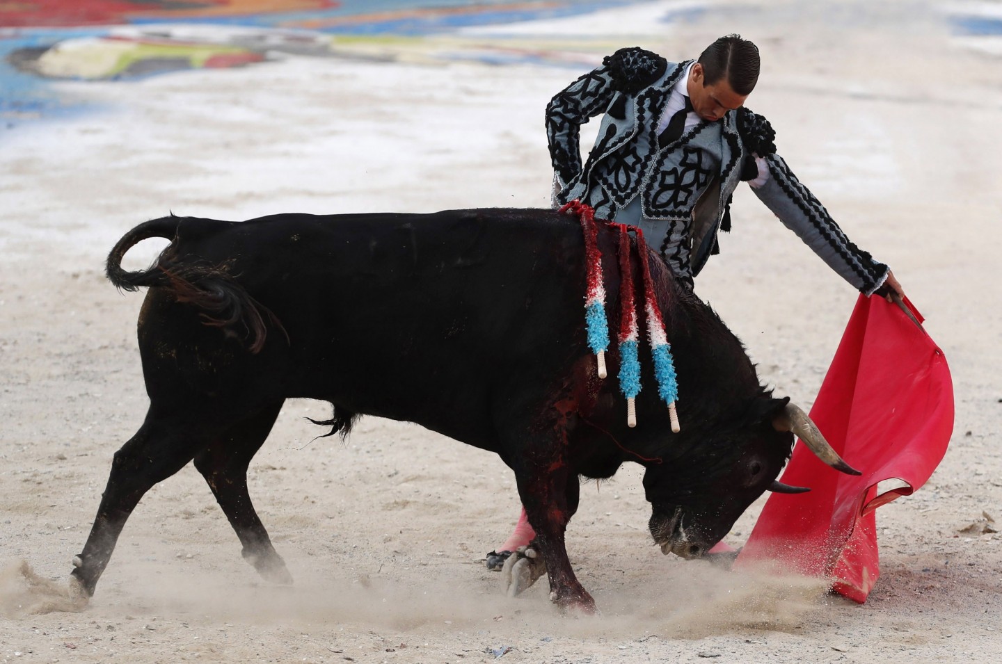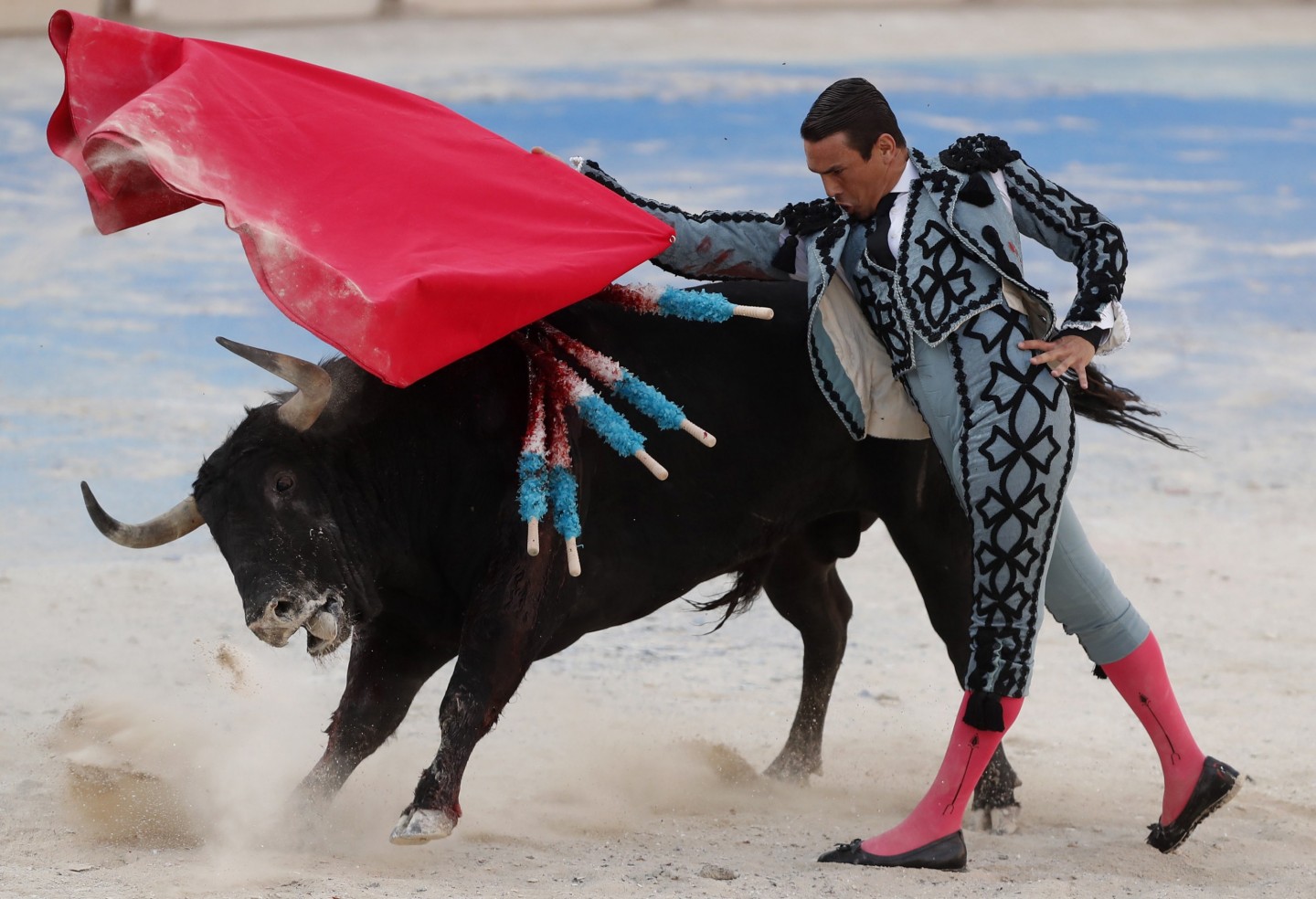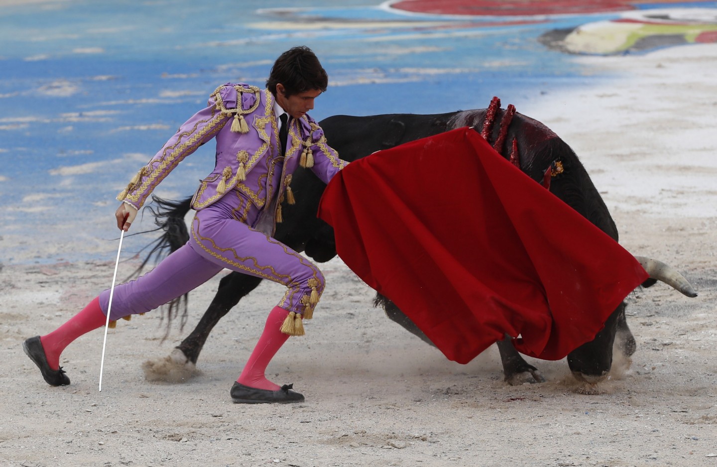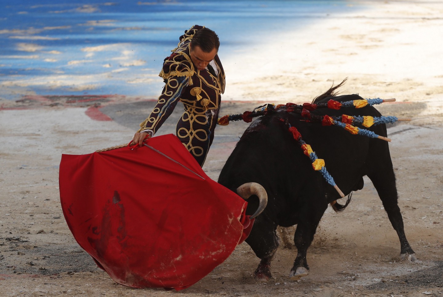 Toreadors Spānijā demonstrē savas prasmes cīņas laukā