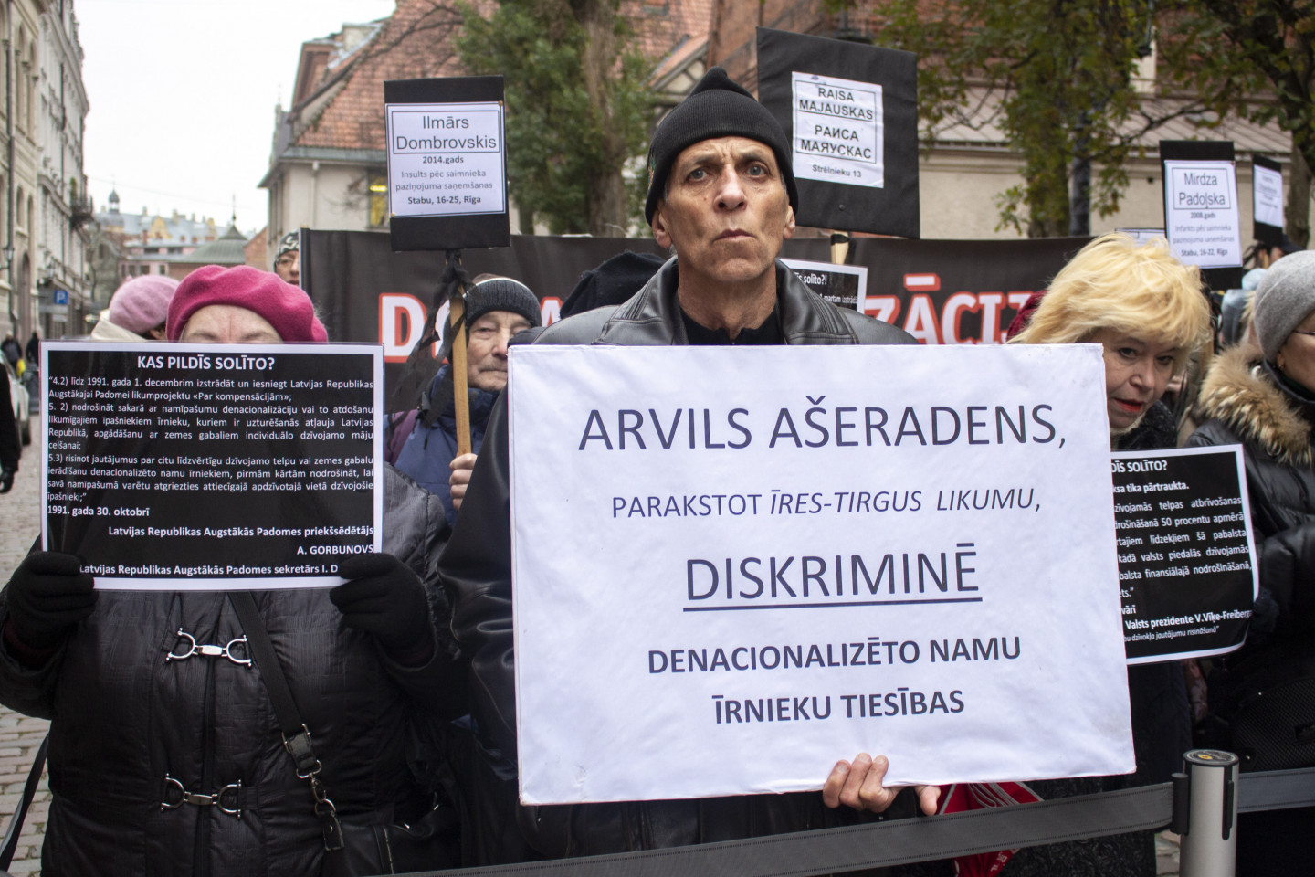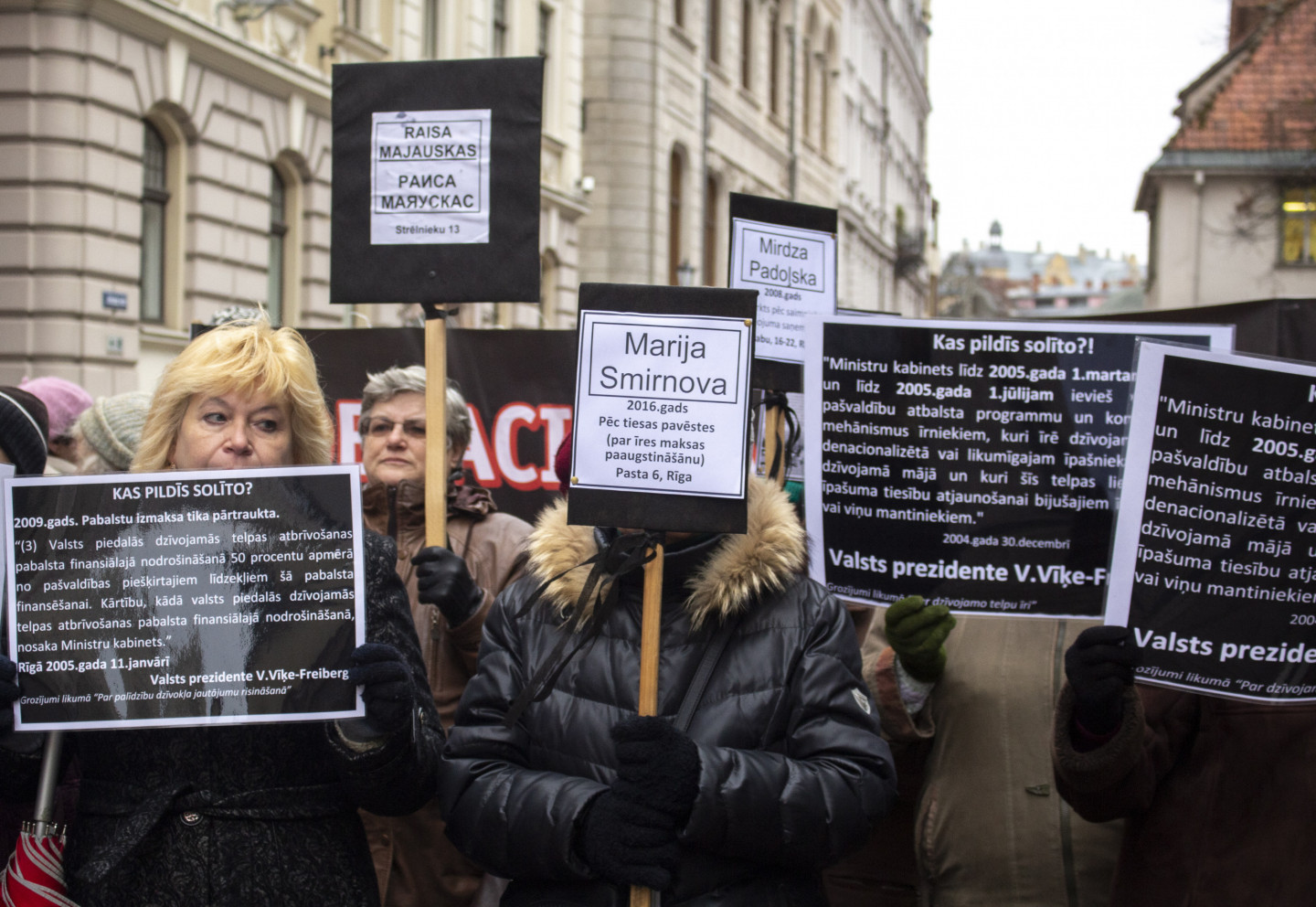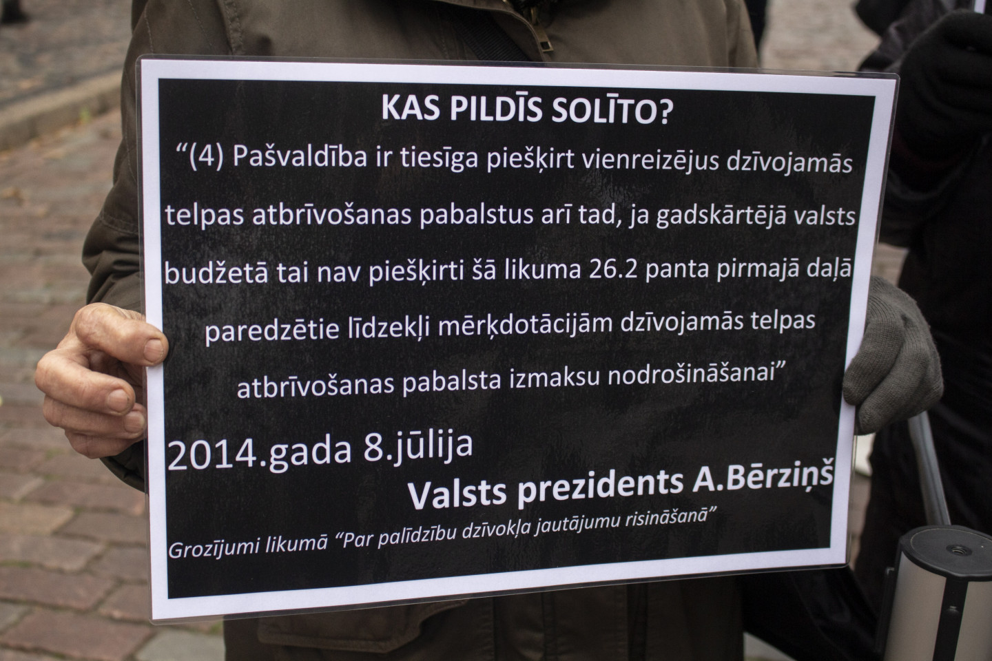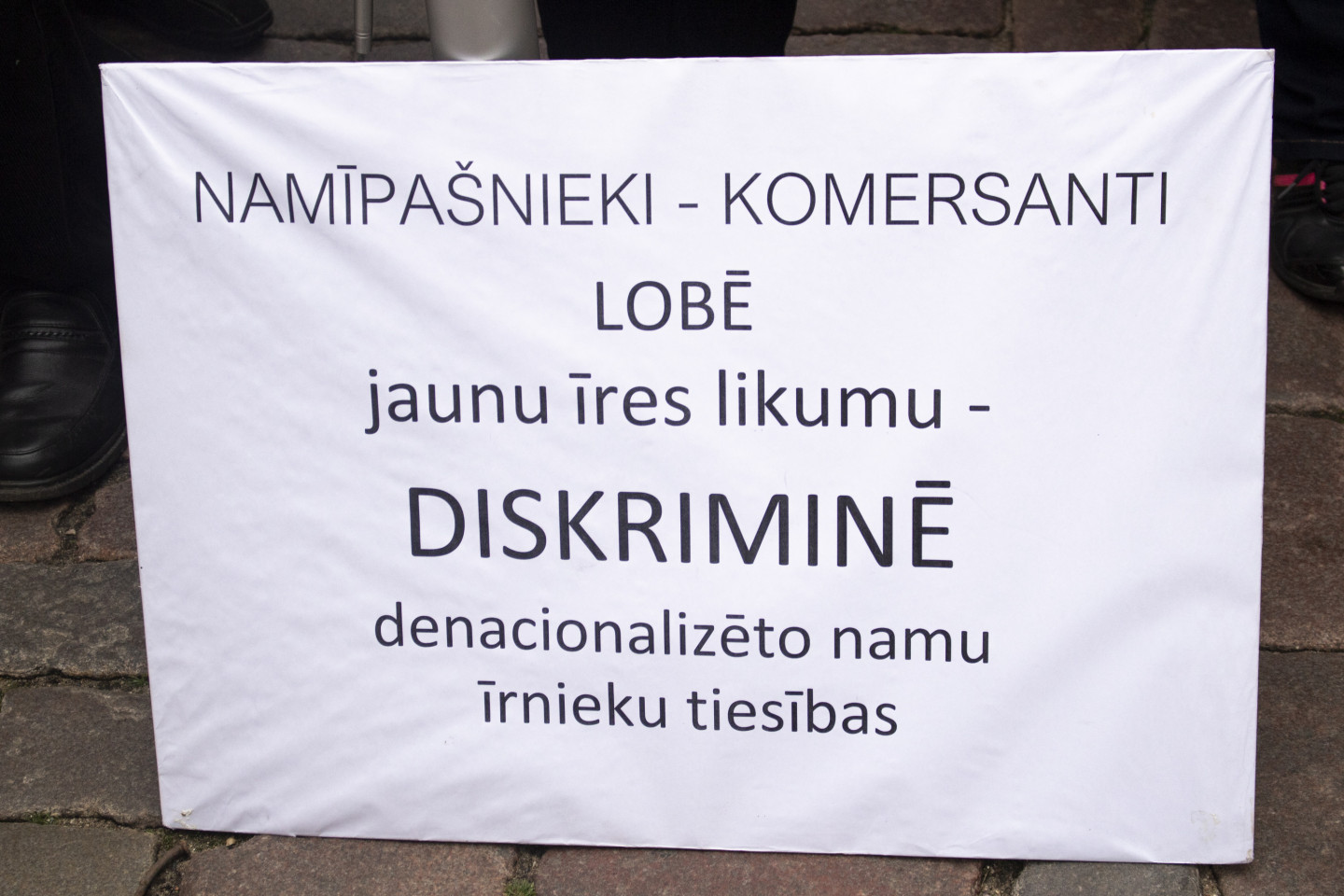 Latvijas Denacionalizēto un municipālo māju īrnieku un dzīvokļu īpašnieku asociācija šodien pie Saeimas ēkas rīkoja piketu. Piedalījās aptuveni aptuveni 30 cilvēki.