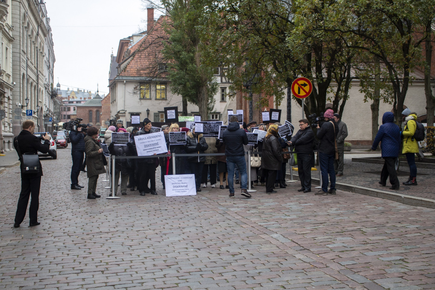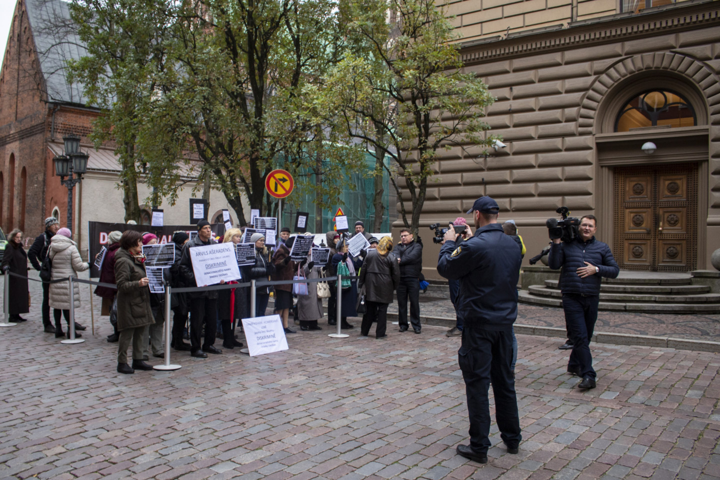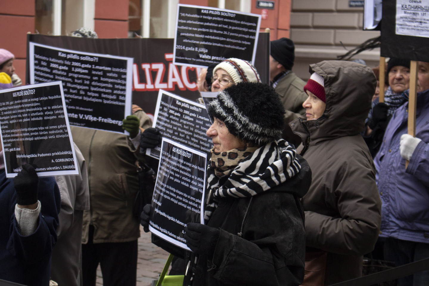 Latvijas Denacionalizēto un municipālo māju īrnieku un dzīvokļu īpašnieku asociācija šodien pie Saeimas ēkas rīkoja piketu. Piedalījās aptuveni aptuveni 30 cilvēki.