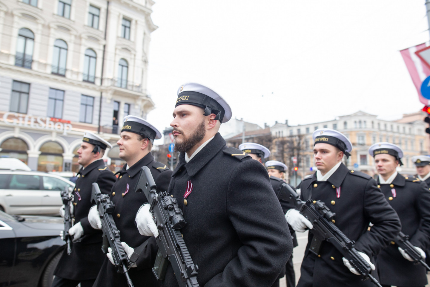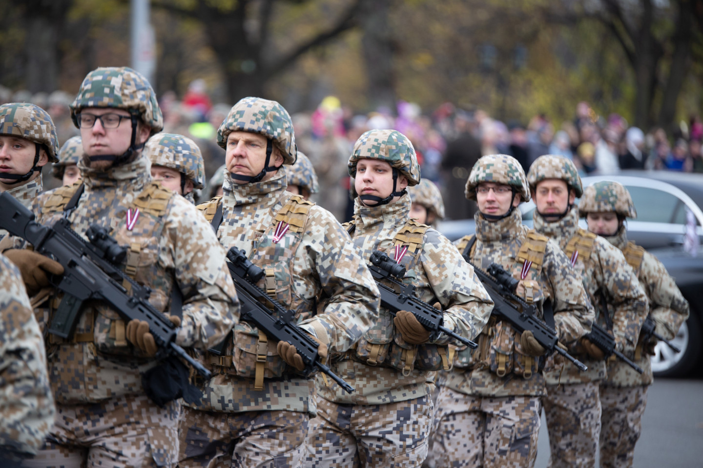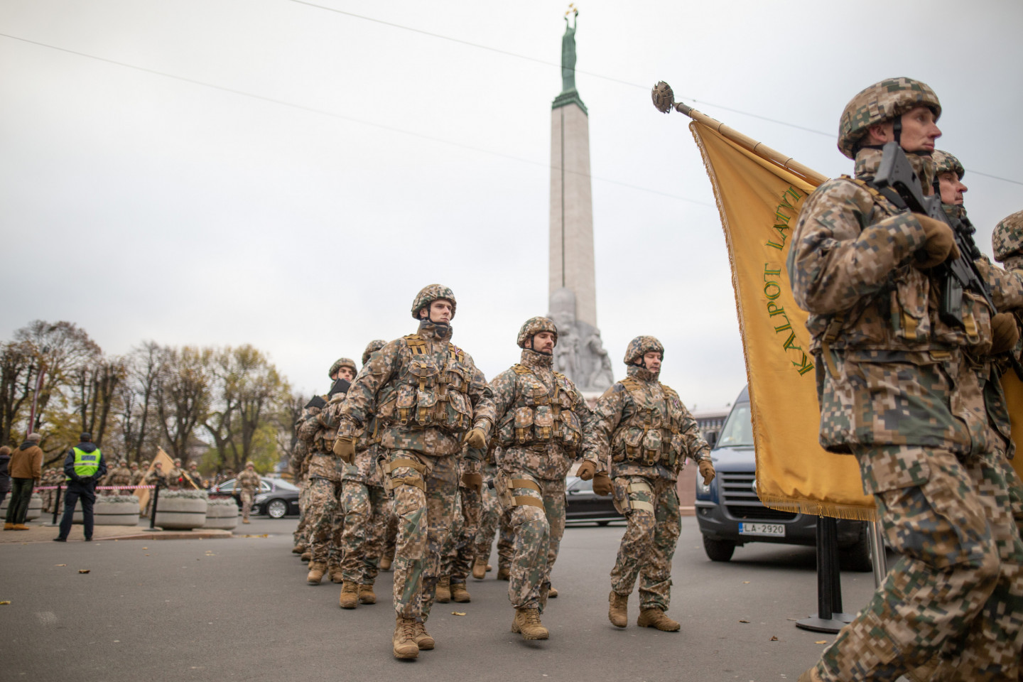 Brīvības pieminekļa laukumā notikusi militārā parāde, kurā piedalās Nacionālo bruņoto spēku un Iekšlietu ministrijas pakļautības iestāžu - Valsts robežsardzes, Valsts policijas un Valsts ugunsdzēsības un glābšanas dienesta - vienības.