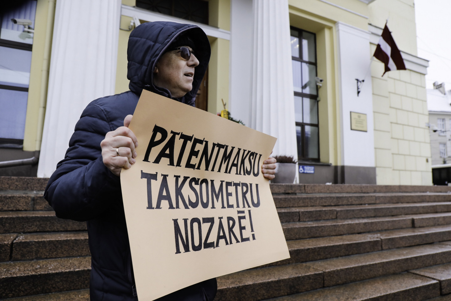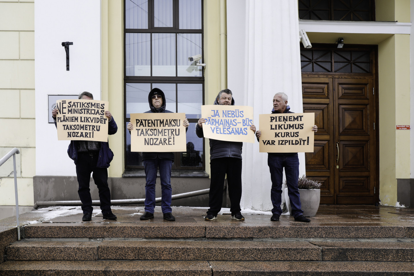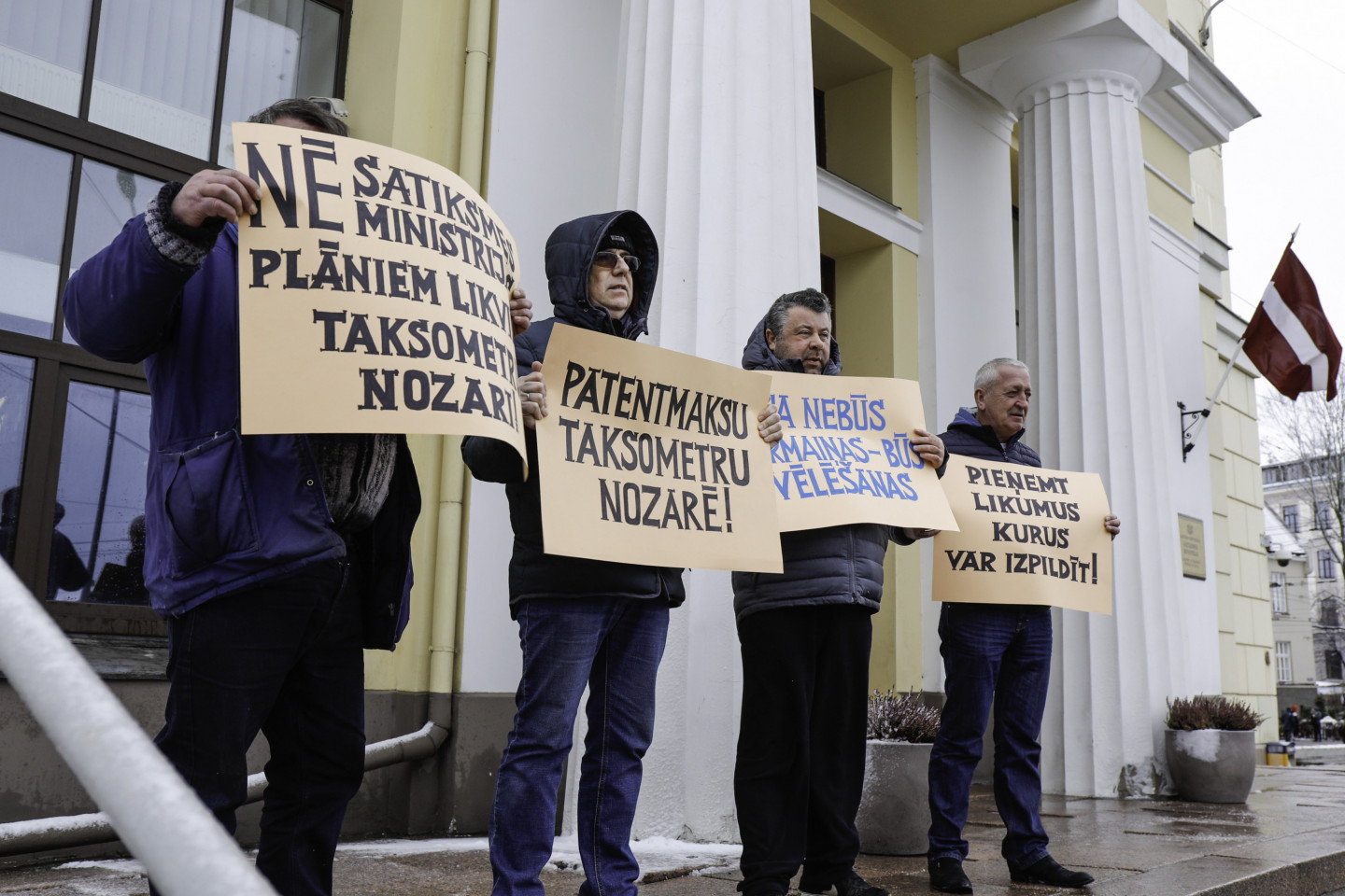Šodien pie Satiksmes ministrijas (SM) apmēram 20 taksometru vadītāji piketā aicina ieviest patentmaksu, kas garantētu taksometru vadītāju sociālo apdrošināšanu, novēroja aģentūra LETA. Daļa taksometru vadītāju ar plakātiem stāv tieši pie ministrijas ieejas. Uz plakātiem rakstīts "Patentmaksu taksometru nozarē!", "Ja nebūs izmaiņas, būs - vēlēšanas!", "Pieņemt likumus, kurus var izpildīt!", "Neesam vergi!!!", "Sociālās garantijas taksometru vadītājiem!", "Jūtaties droši?". Viens no viņiem rokā tur bēru vainagu, pie kura pievienots taksometra gaismas plafons. Vēlāk vainags tika novietots pie SM durvīm un tur atstāts. Piketa laikā no Gogoļa ielas nogriezās un gar ministrijas ēku pabrauca garām apmēram 40 taksometri, bet pēc tam daļai policijas darbinieki liedza nogriezties. Savukārt daļas taksometru, kas brauca garām pa Gogoļa ielu, vadītāji izmantoja skaņas signālus, paužot savu atbalstu piketam.
