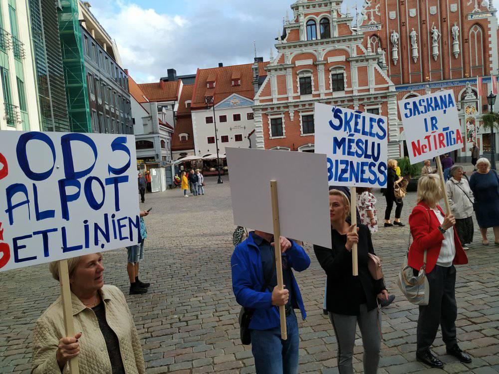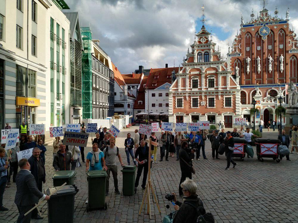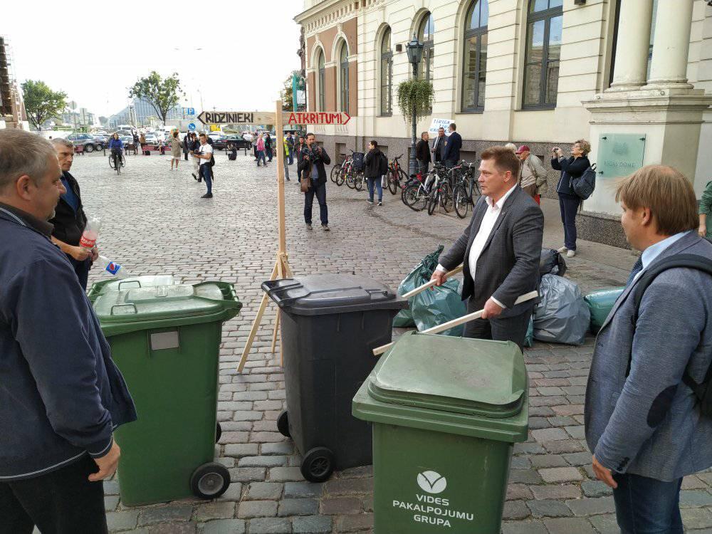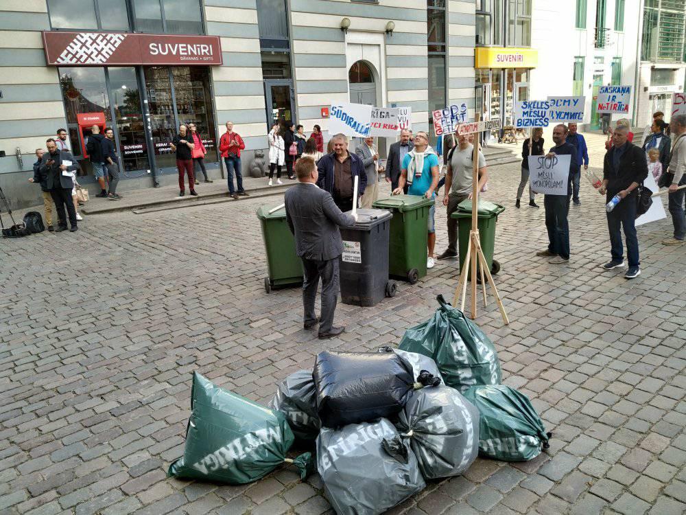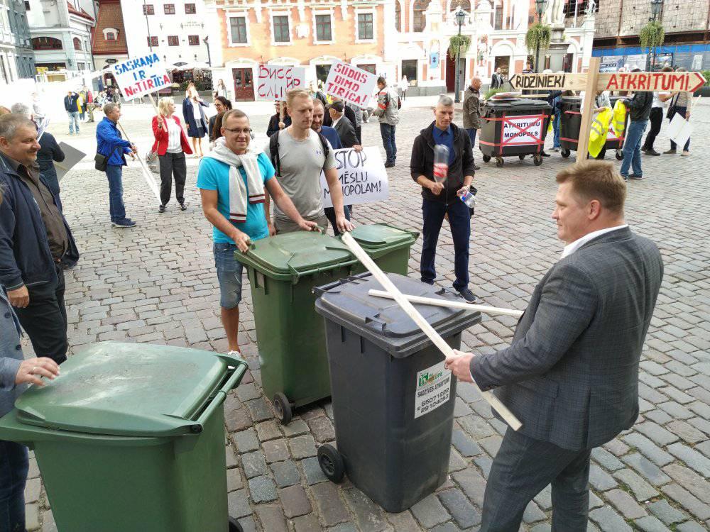Šovakar piketā pret atkritumu apsaimniekošanas politiku pie Rātsnama pulcējušies aptuveni 100 cilvēki, novēroja aģentūra LETA. Klātesošo vidū bija dažāda gadu gājuma cilvēki, taču galvenokārt tur bija sastopami Jaunās konservatīvās partijas biedri, kā arī citi opozicionāri. Uz iedzīvotāju līdzi paņemtajiem plakātiem bija tādi uzraksti kā "Monopols smird", "Gods kalpot Getliņiem", "Tīrīga tīra kabatas", "Torņakalns pret monopolu" un citi. Sanākušie nepārtraukti skandināja tādus saukļus kā "Dome nelabi smird", "Konkurenci", "Rīga nelabi ož" un citus. Aktīvisti arī aicināja āra iznākt Rīgas mēru Oļegu Burovu (GKR), taču politiķis līdz šim Rātslaukumā nav iznācis. Paralēli aktīvisti bija atnesuši kaudzi ar miskastes maisiem, kā arī atveduši atkritumu konteinerus, pa kuru vākiem tika dauzīts ar dažādiem priekšmetiem, tādējādi radot rīboņu.