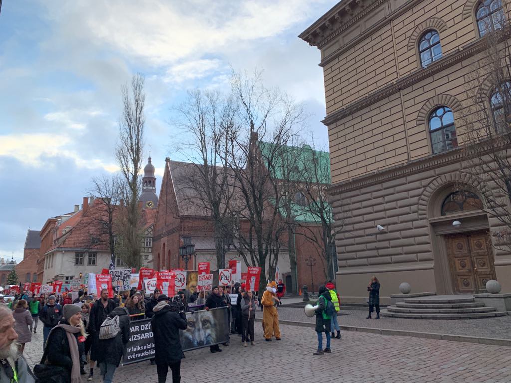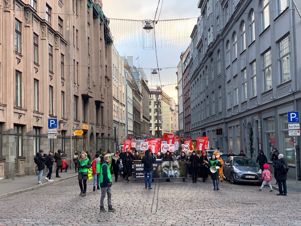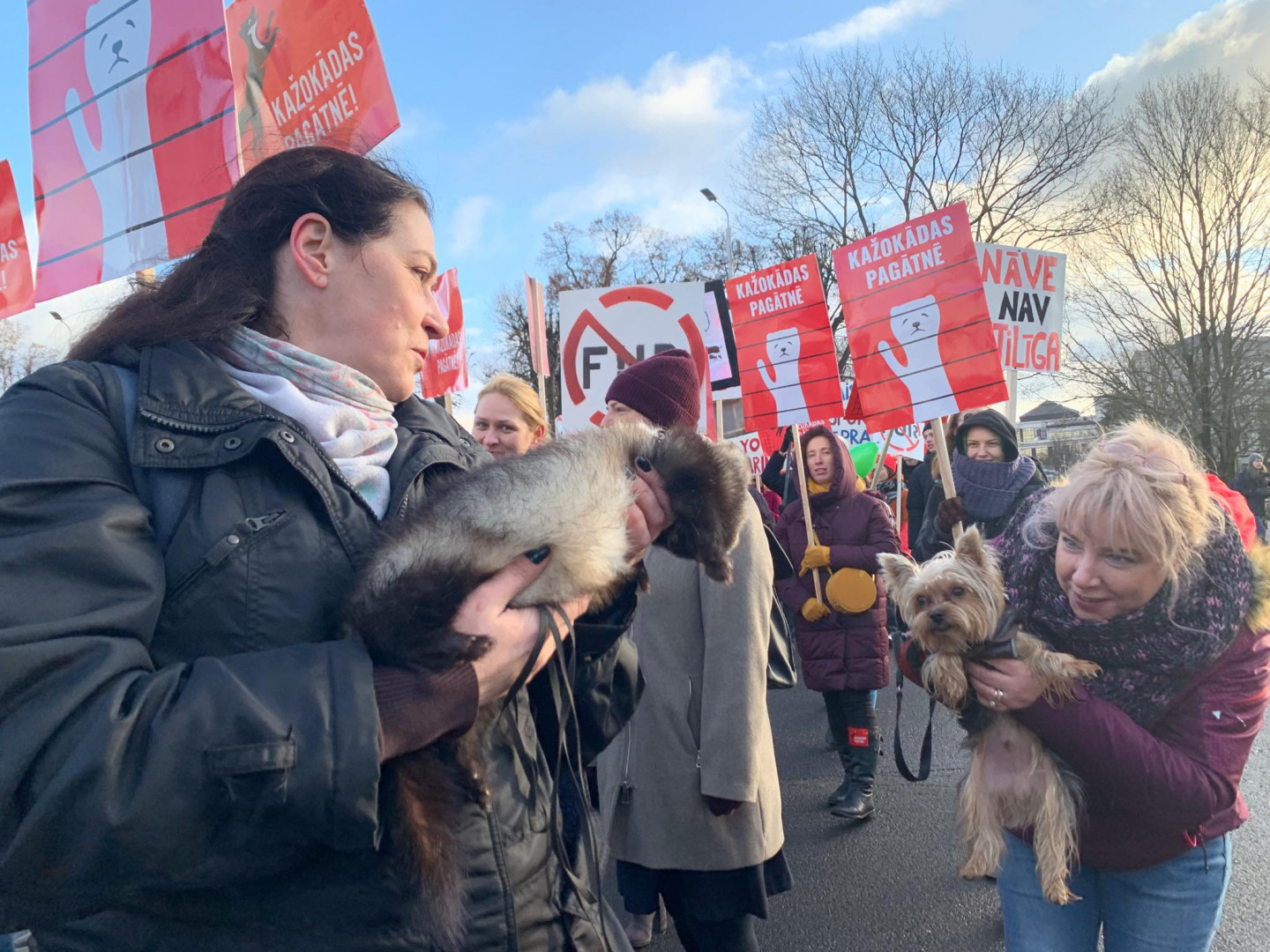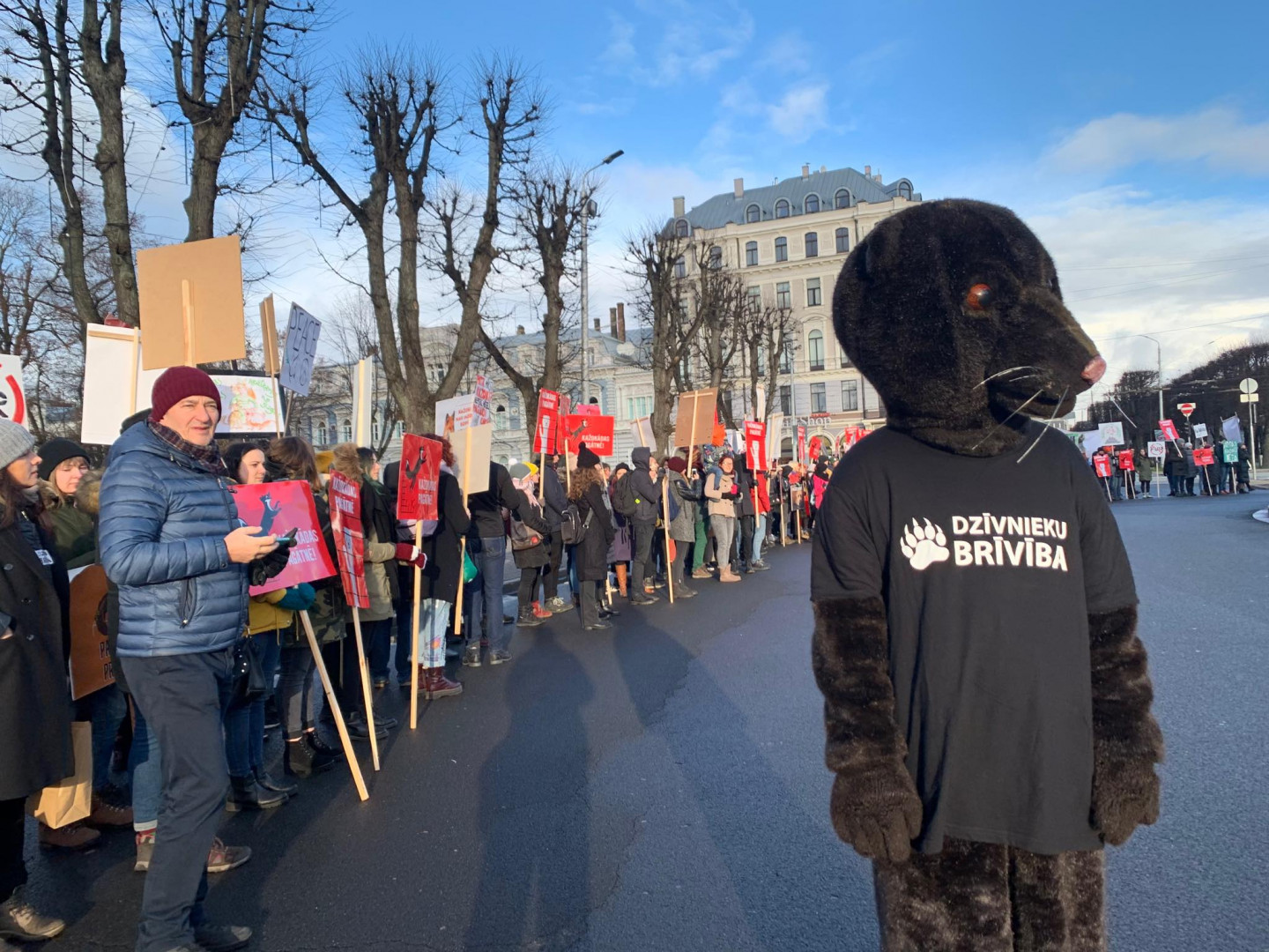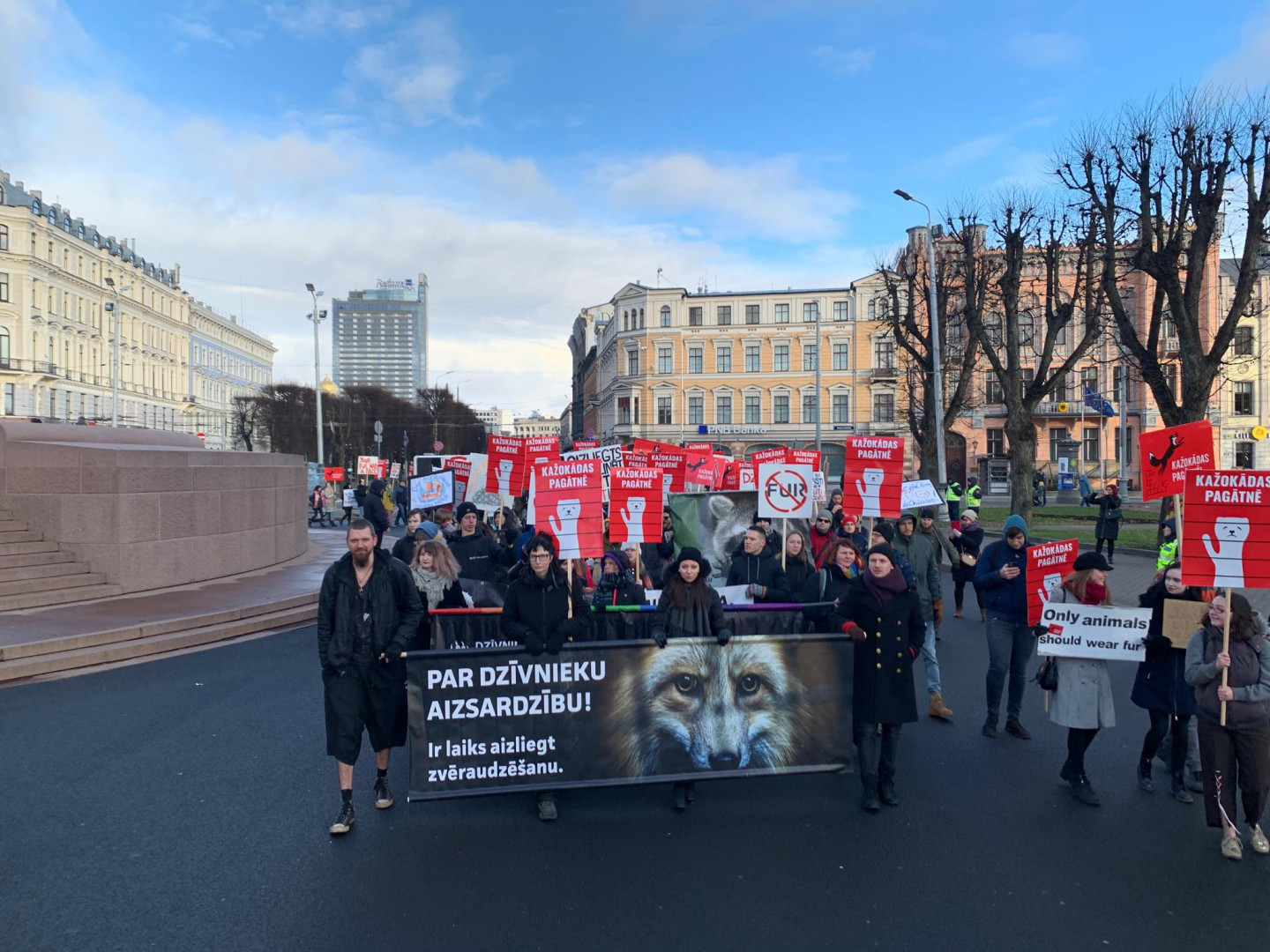 Šodien Rīgā notika dzīvnieku tiesību aktīvistu gājiens, kurā rīkotāji aicina Saeimu aizliegt kažokzvēru audzēšanu Latvijā. Kā aģentūru LETA informēja biedrība "Dzīvnieku brīvība", gājiena nosaukums un galvenais sauklis bija "Kažokādas pagātnē!". "Ir pienācis laiks pilnībā aizliegt zvēraudzētavas un zvēru audzēšanu komerciāliem nolūkiem. Kažokādām vajadzētu palikt pagātnē. Aizstāvēsim tos, kuri paši sevi aizstāvēt nespēj," gājiena sākumā paziņojis dzīvnieku tiesību aktīvists Morics Menģelsons. "Šodien gājiens noslēdzas, taču cīņa par dzīvniekiem nebeidzas. Kopīgiem spēkiem mēs padarīsim Latviju par valsti, kas atstāj kažokādas pagātnē," piebalsojusi biedrības "Dzīvnieku brīvība" vadītāja Katrīna Krīgere. Gājienu par dzīvniekiem rīkoja biedrība "Dzīvnieku brīvība" sadarbībā ar citām dzīvnieku un vides aizstāvības organizācijām. Starptautiskās dienas pret kažokādām ietvaros līdzīgas akcijas notiek arī citviet pasaulē. Pēc "Dzīvnieku brīvības" aplēsēm, Latvijā ir ap 20 zvēraudzēšanas fermas, kurās audzē vairāk nekā pusmiljonu lapsu, ūdeļu un šinšillu.