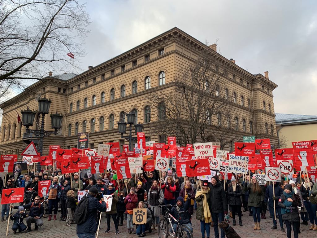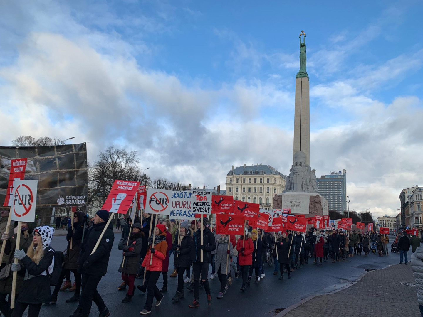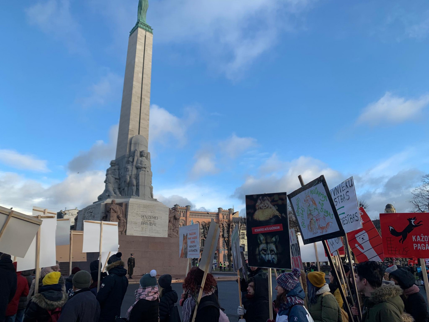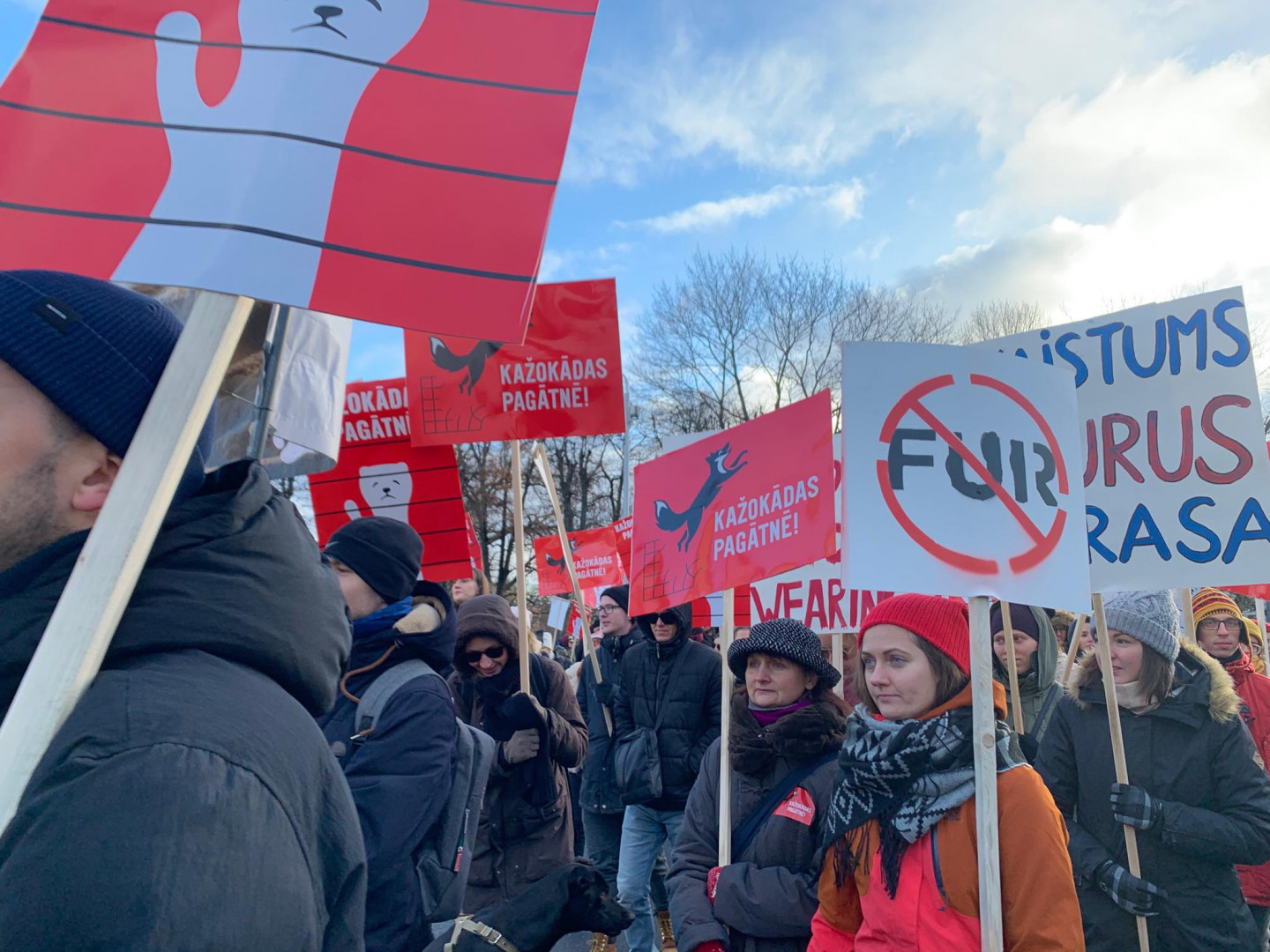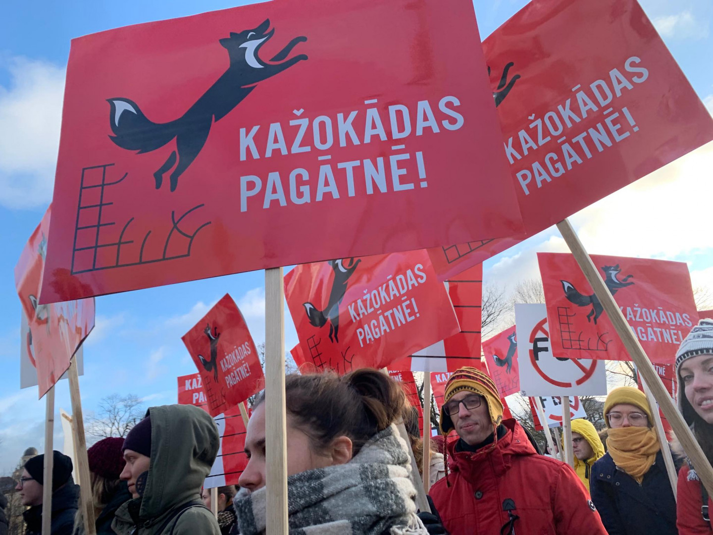 Šodien Rīgā notika dzīvnieku tiesību aktīvistu gājiens, kurā rīkotāji aicina Saeimu aizliegt kažokzvēru audzēšanu Latvijā. Kā aģentūru LETA informēja biedrība "Dzīvnieku brīvība", gājiena nosaukums un galvenais sauklis bija "Kažokādas pagātnē!". "Ir pienācis laiks pilnībā aizliegt zvēraudzētavas un zvēru audzēšanu komerciāliem nolūkiem. Kažokādām vajadzētu palikt pagātnē. Aizstāvēsim tos, kuri paši sevi aizstāvēt nespēj," gājiena sākumā paziņojis dzīvnieku tiesību aktīvists Morics Menģelsons. "Šodien gājiens noslēdzas, taču cīņa par dzīvniekiem nebeidzas. Kopīgiem spēkiem mēs padarīsim Latviju par valsti, kas atstāj kažokādas pagātnē," piebalsojusi biedrības "Dzīvnieku brīvība" vadītāja Katrīna Krīgere. Gājienu par dzīvniekiem rīkoja biedrība "Dzīvnieku brīvība" sadarbībā ar citām dzīvnieku un vides aizstāvības organizācijām. Starptautiskās dienas pret kažokādām ietvaros līdzīgas akcijas notiek arī citviet pasaulē. Pēc "Dzīvnieku brīvības" aplēsēm, Latvijā ir ap 20 zvēraudzēšanas fermas, kurās audzē vairāk nekā pusmiljonu lapsu, ūdeļu un šinšillu.
