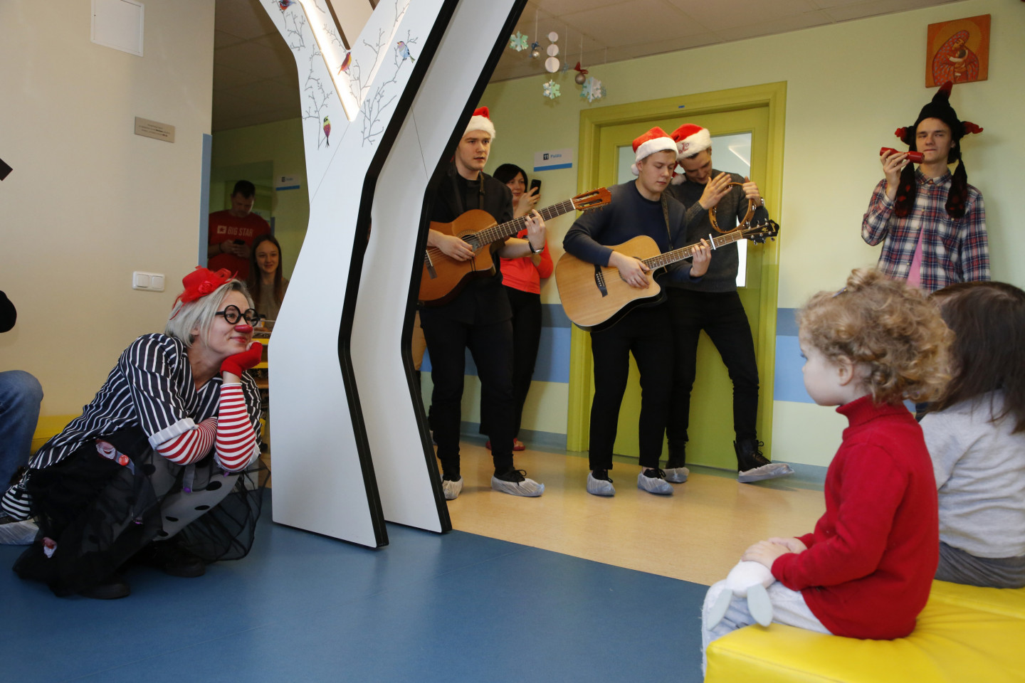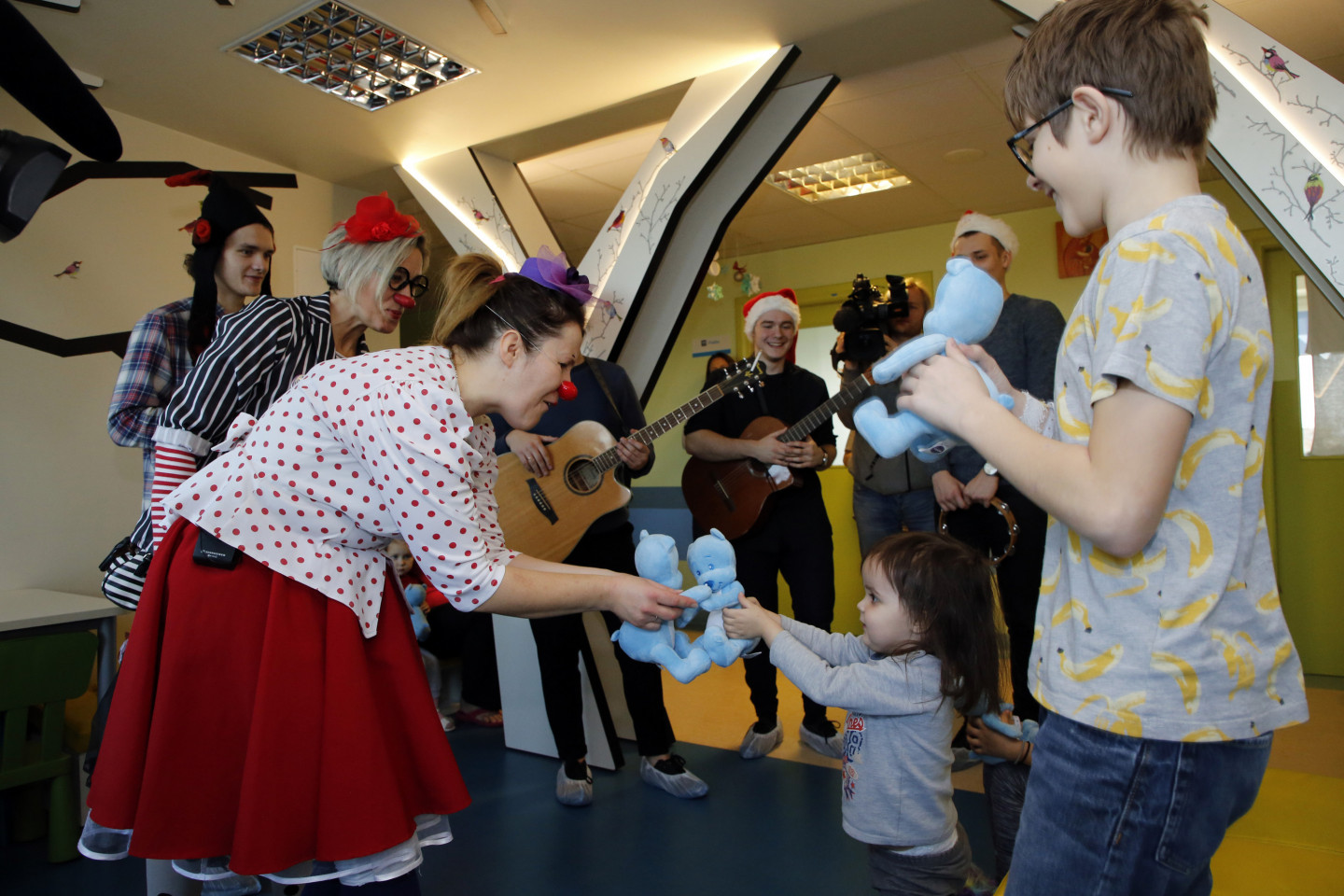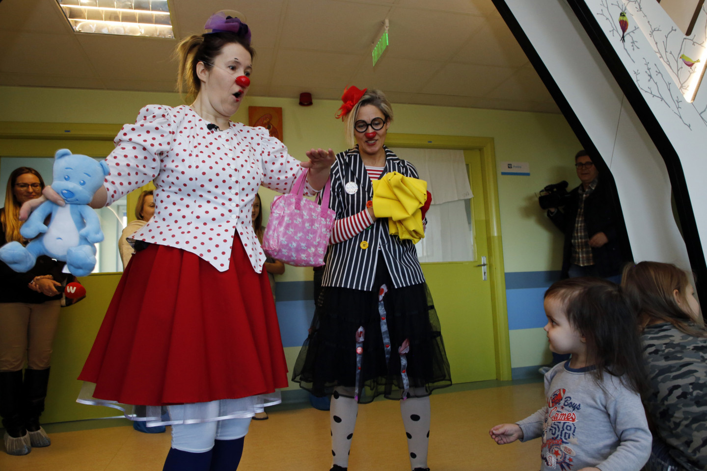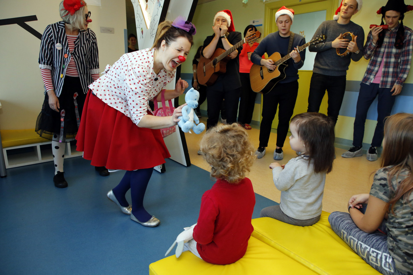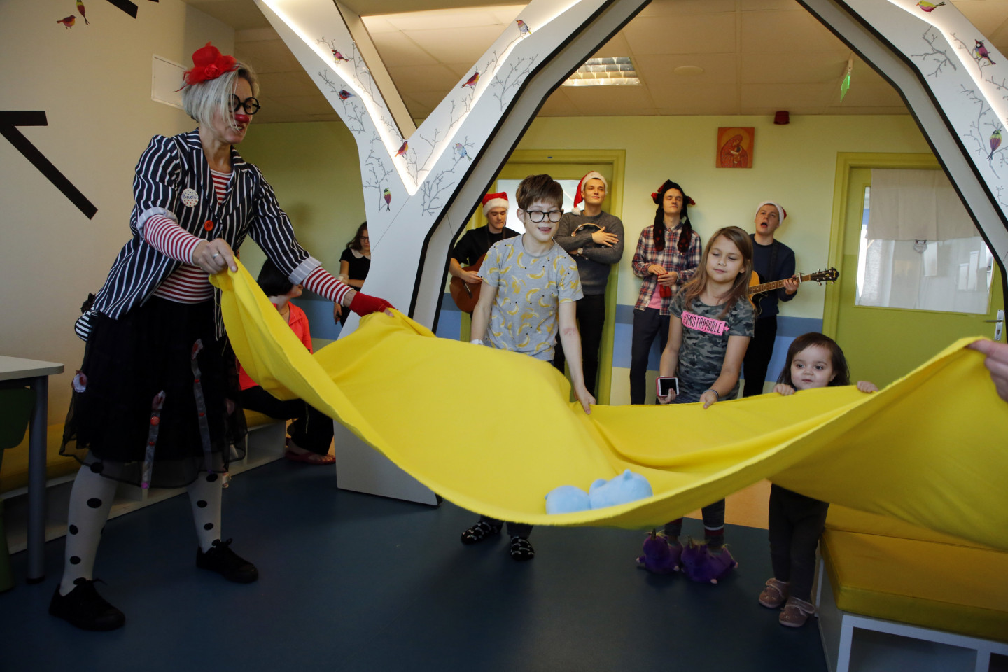 Bērnu klīniskās universitātes slimnīcā viesojušies Dr. Klauni un mazajiem pacientiem uzdziedājusi grupa "Sudden Lights".