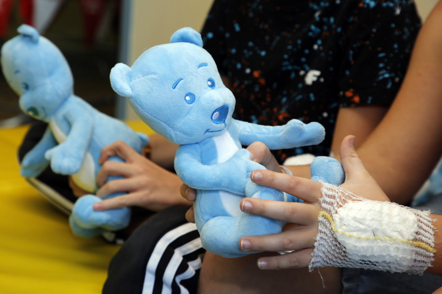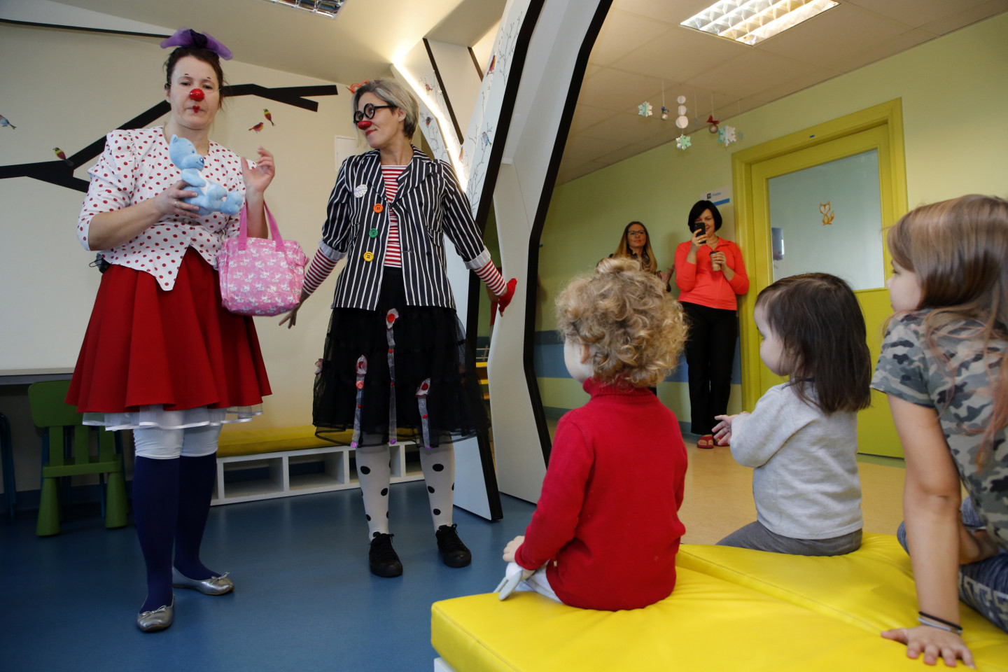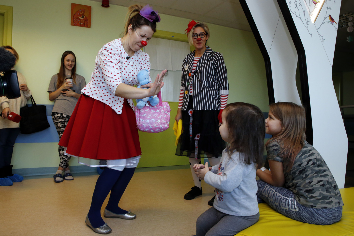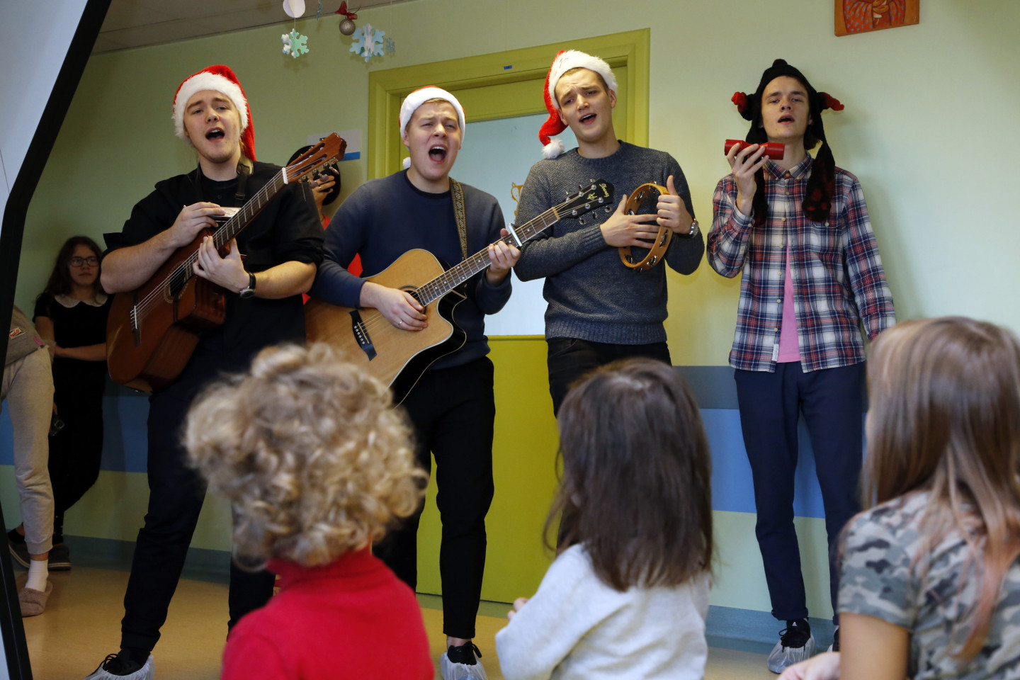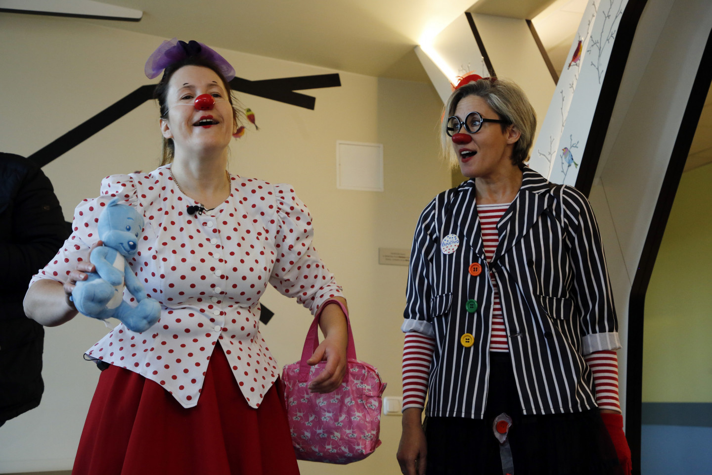 Bērnu klīniskās universitātes slimnīcā viesojušies Dr. Klauni un mazajiem pacientiem uzdziedājusi grupa "Sudden Lights".