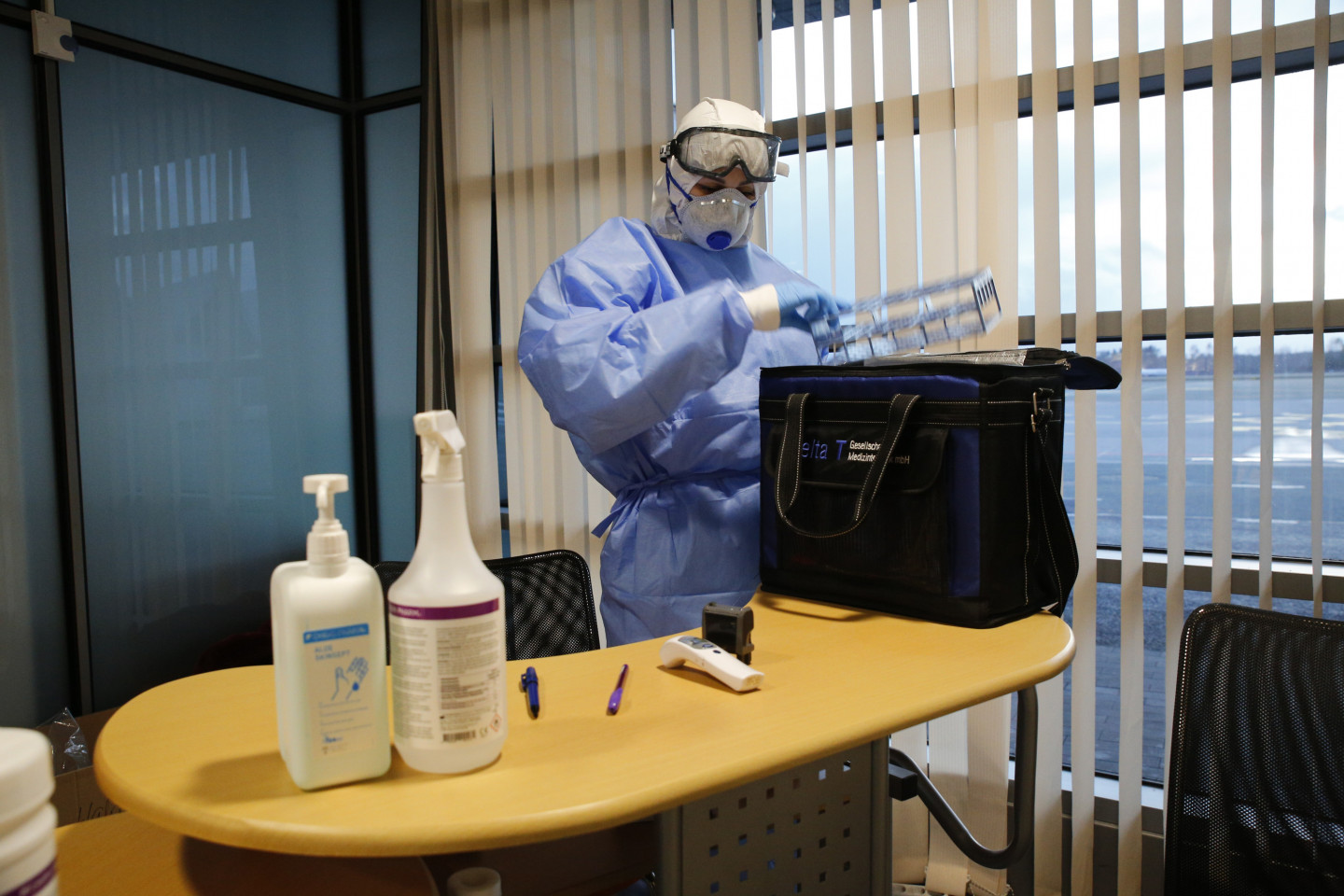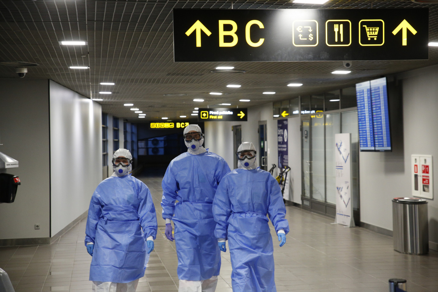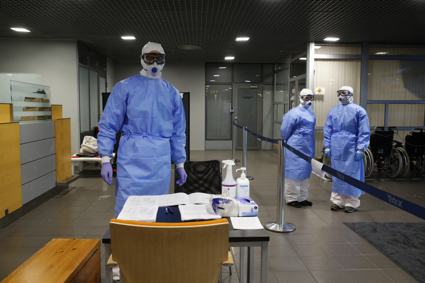 Neatliekamās medicīniskās palīdzības dienesta mediķi starptautiskajā lidostā "Rīga" sagaida avioreisus ar repatriētajiem Latvijas valstspiederīgajiem.