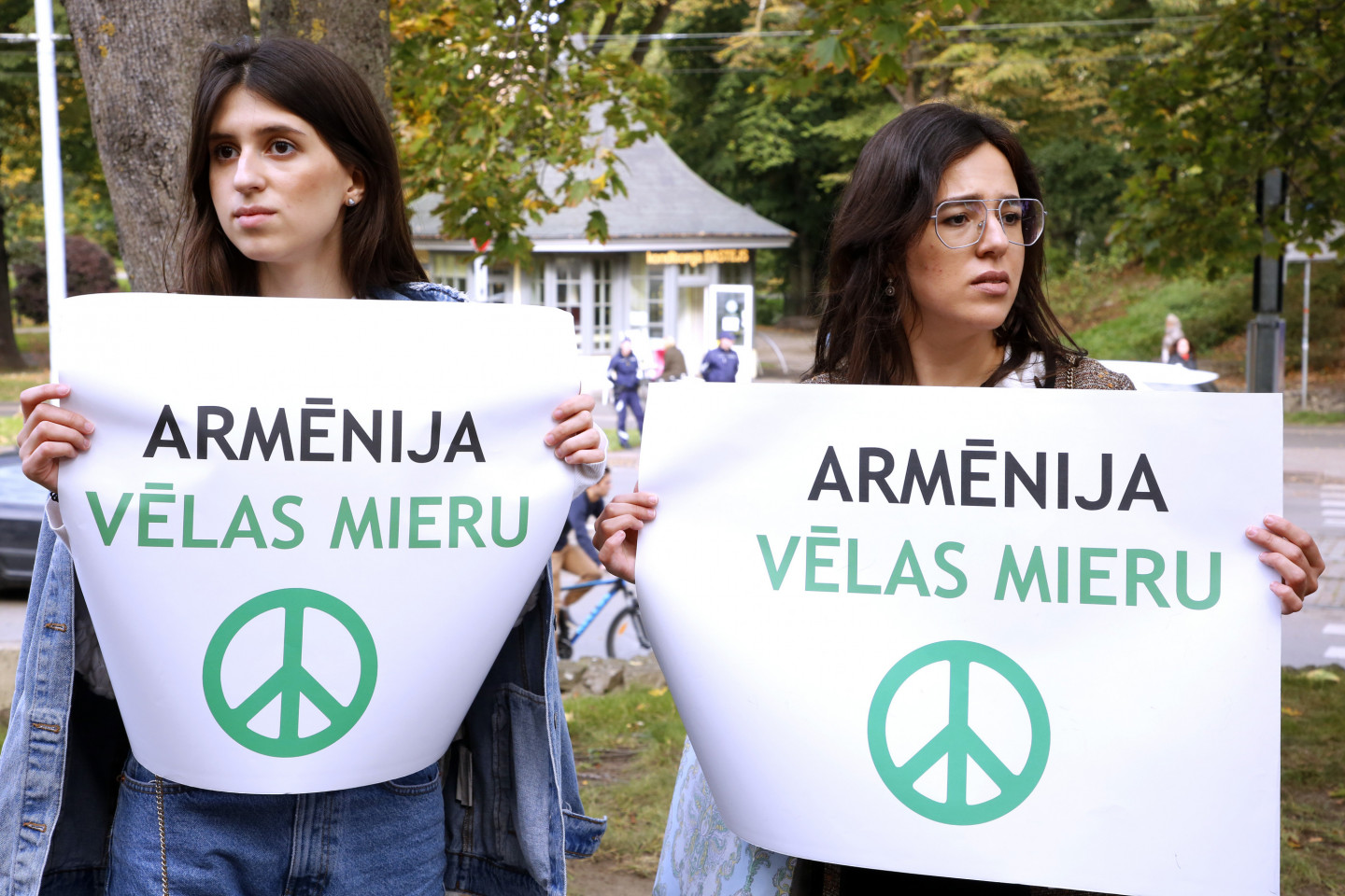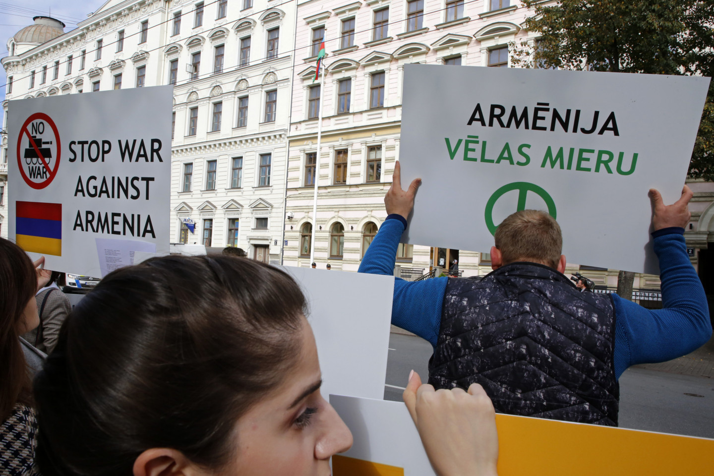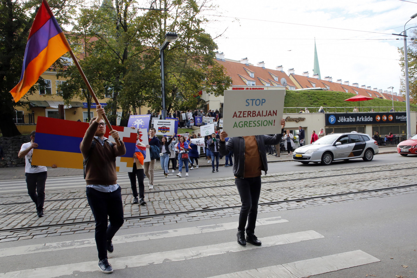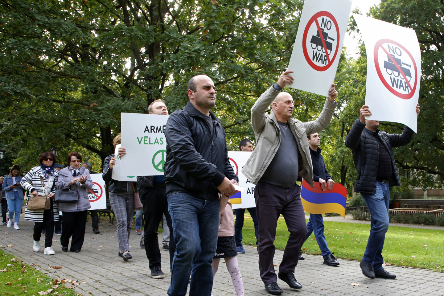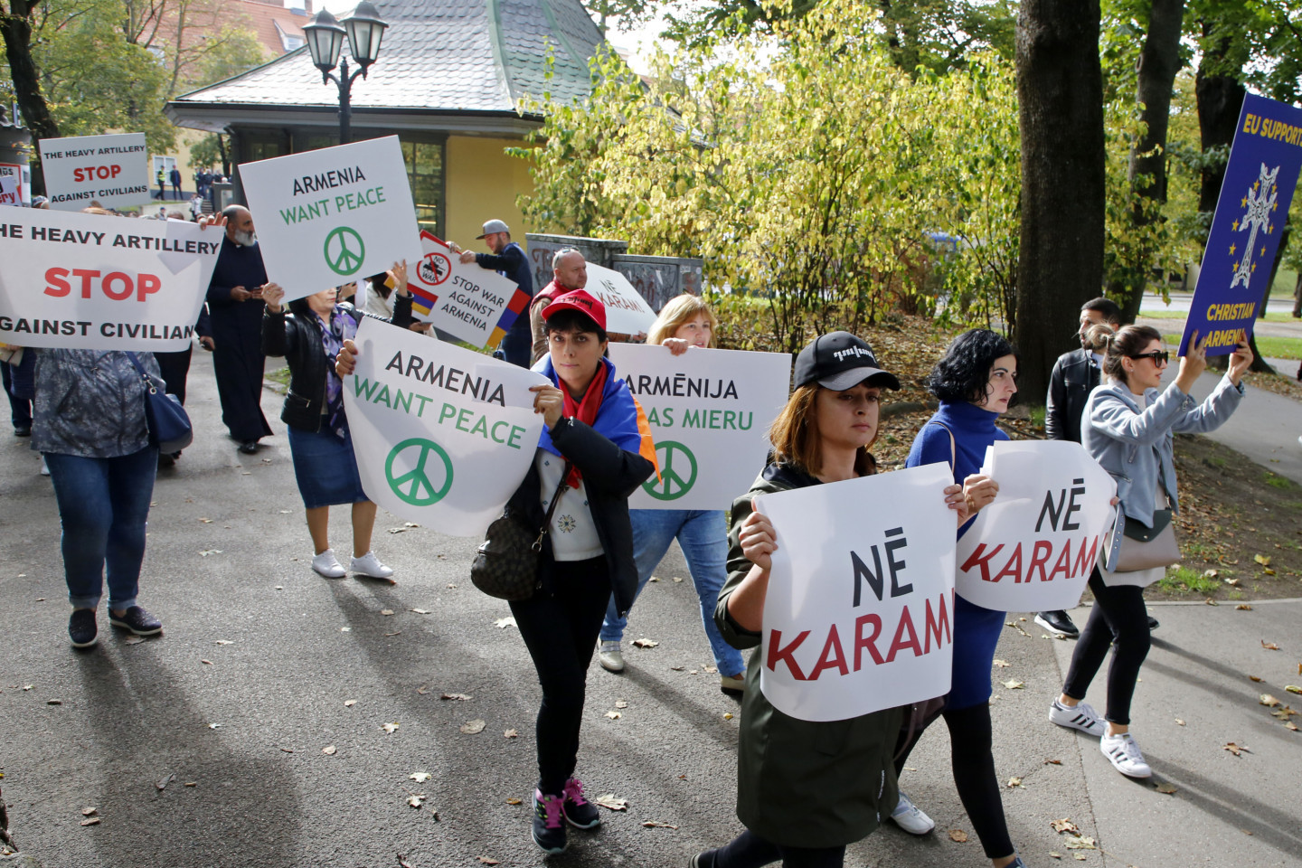 Aicinot nekavējoties pārtraukt karadarbību Kalnu Karabahā, šodien gājienā Rīgas centrā pulcējās aptuveni 100 cilvēku, novēroja aģentūra LETA. Dalībnieki uz pasākumu pulcējās Zigfrīda Annas Meirovica bulvārī 8, iepretim Bastejkalnam, pie pieminekļa "Hačkar". Pēc tam tie devās gājienā uz Azerbaidžānas vēstniecību, kur skandināja, ka Armēnijas tauta nevēlas karu. Vēlāk gājiena dalībnieki devās pie Turcijas vēstniecības, kur aicināja Turciju nepalīdzēt Azerbaidžānai karadarbībā. Cilvēki rokās turēja plakātus, uz kuriem bija uzrakstīti aicinājumi izbeigt karu Kalnu Karabahā. Pasākuma organizētāji vairākkārt mudināja sanākušos protestētājus ievērot mieru un sociālo distancēšanos. Pasākumu rīkoja biedrība "Latvijas armēņu kultūras centrs". Gājiena un sapulces mērķis bija paust noraidošu attieksmi pret vardarbību Kalnu Karabahā un aicināt uz tūlītēju kara darbību pārtraukšanu.