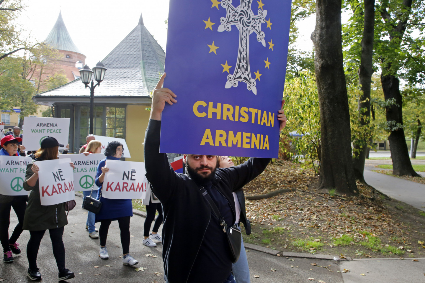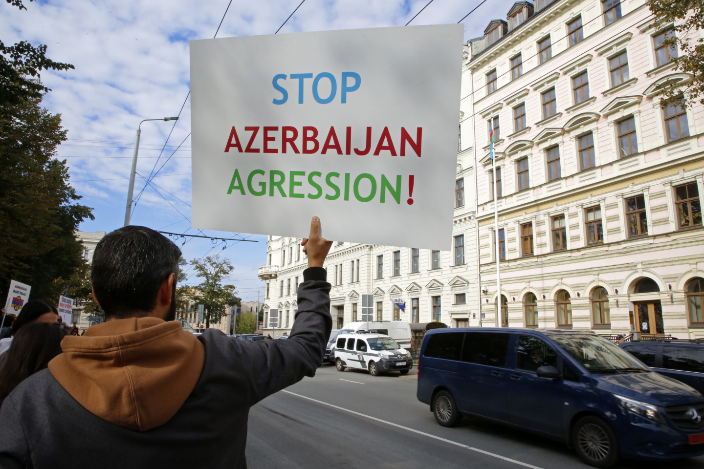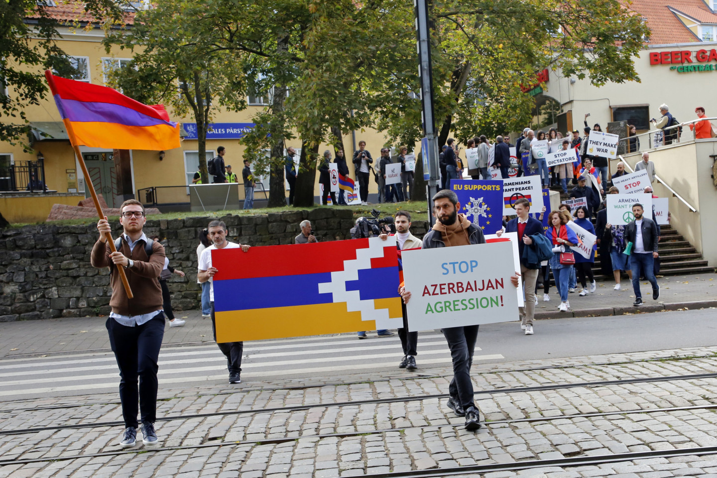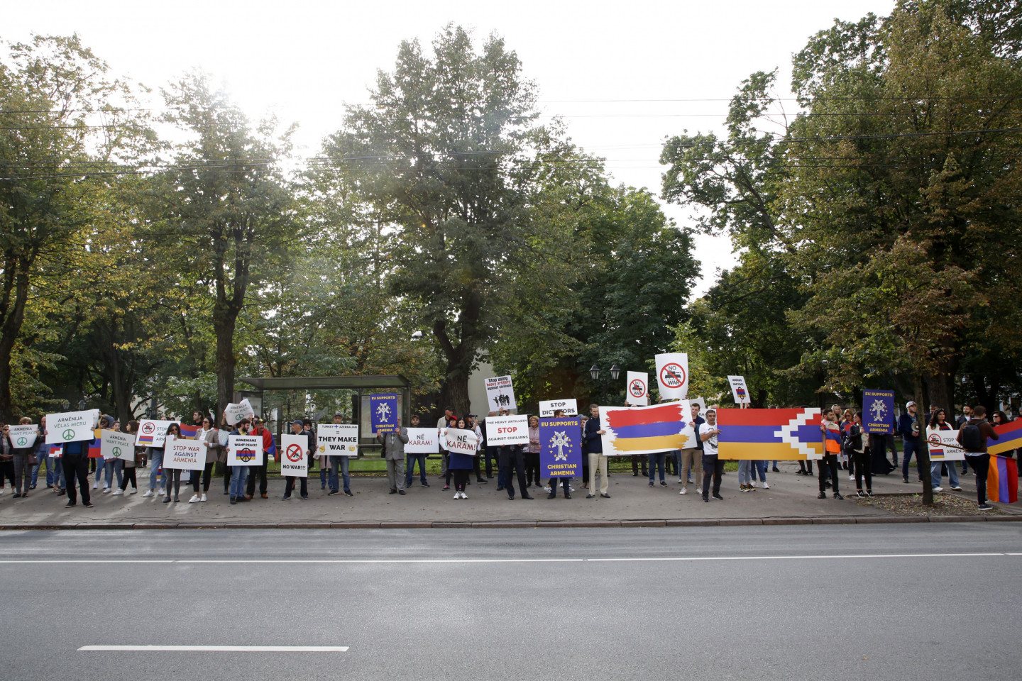 Aicinot nekavējoties pārtraukt karadarbību Kalnu Karabahā, šodien gājienā Rīgas centrā pulcējās aptuveni 100 cilvēku, novēroja aģentūra LETA. Dalībnieki uz pasākumu pulcējās Zigfrīda Annas Meirovica bulvārī 8, iepretim Bastejkalnam, pie pieminekļa "Hačkar". Pēc tam tie devās gājienā uz Azerbaidžānas vēstniecību, kur skandināja, ka Armēnijas tauta nevēlas karu. Vēlāk gājiena dalībnieki devās pie Turcijas vēstniecības, kur aicināja Turciju nepalīdzēt Azerbaidžānai karadarbībā. Cilvēki rokās turēja plakātus, uz kuriem bija uzrakstīti aicinājumi izbeigt karu Kalnu Karabahā. Pasākuma organizētāji vairākkārt mudināja sanākušos protestētājus ievērot mieru un sociālo distancēšanos. Pasākumu rīkoja biedrība "Latvijas armēņu kultūras centrs". Gājiena un sapulces mērķis bija paust noraidošu attieksmi pret vardarbību Kalnu Karabahā un aicināt uz tūlītēju kara darbību pārtraukšanu.