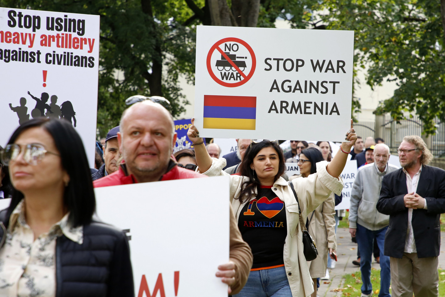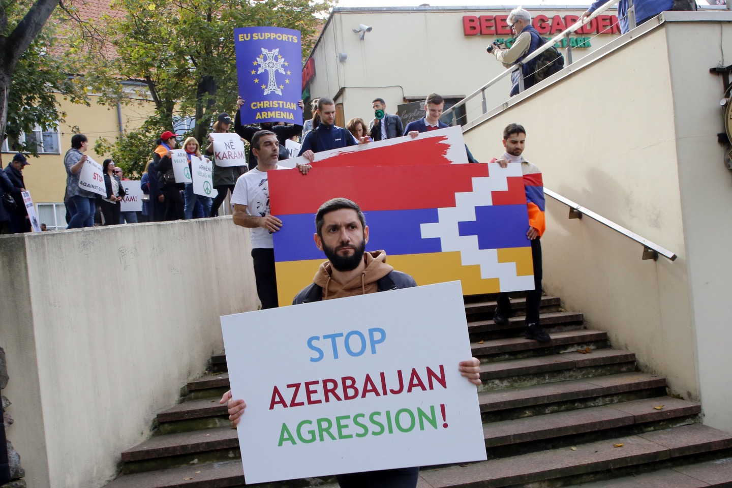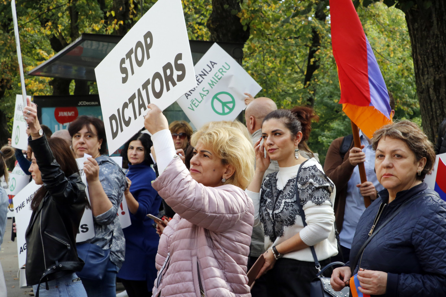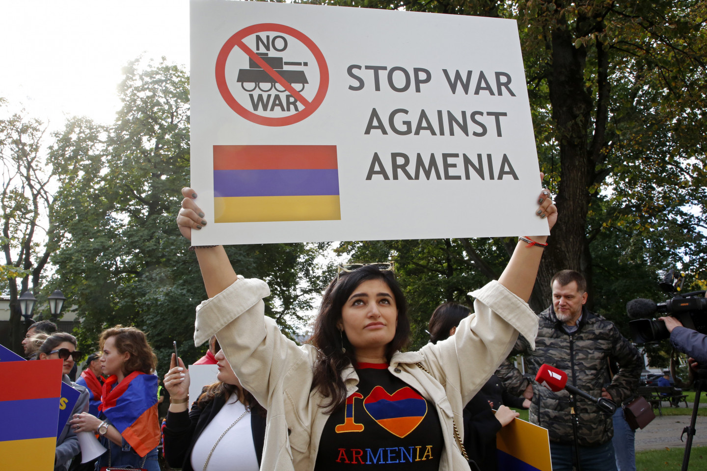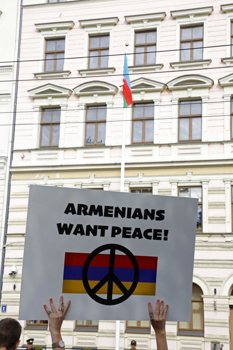 Aicinot nekavējoties pārtraukt karadarbību Kalnu Karabahā, šodien gājienā Rīgas centrā pulcējās aptuveni 100 cilvēku, novēroja aģentūra LETA. Dalībnieki uz pasākumu pulcējās Zigfrīda Annas Meirovica bulvārī 8, iepretim Bastejkalnam, pie pieminekļa "Hačkar". Pēc tam tie devās gājienā uz Azerbaidžānas vēstniecību, kur skandināja, ka Armēnijas tauta nevēlas karu. Vēlāk gājiena dalībnieki devās pie Turcijas vēstniecības, kur aicināja Turciju nepalīdzēt Azerbaidžānai karadarbībā. Cilvēki rokās turēja plakātus, uz kuriem bija uzrakstīti aicinājumi izbeigt karu Kalnu Karabahā. Pasākuma organizētāji vairākkārt mudināja sanākušos protestētājus ievērot mieru un sociālo distancēšanos. Pasākumu rīkoja biedrība "Latvijas armēņu kultūras centrs". Gājiena un sapulces mērķis bija paust noraidošu attieksmi pret vardarbību Kalnu Karabahā un aicināt uz tūlītēju kara darbību pārtraukšanu.