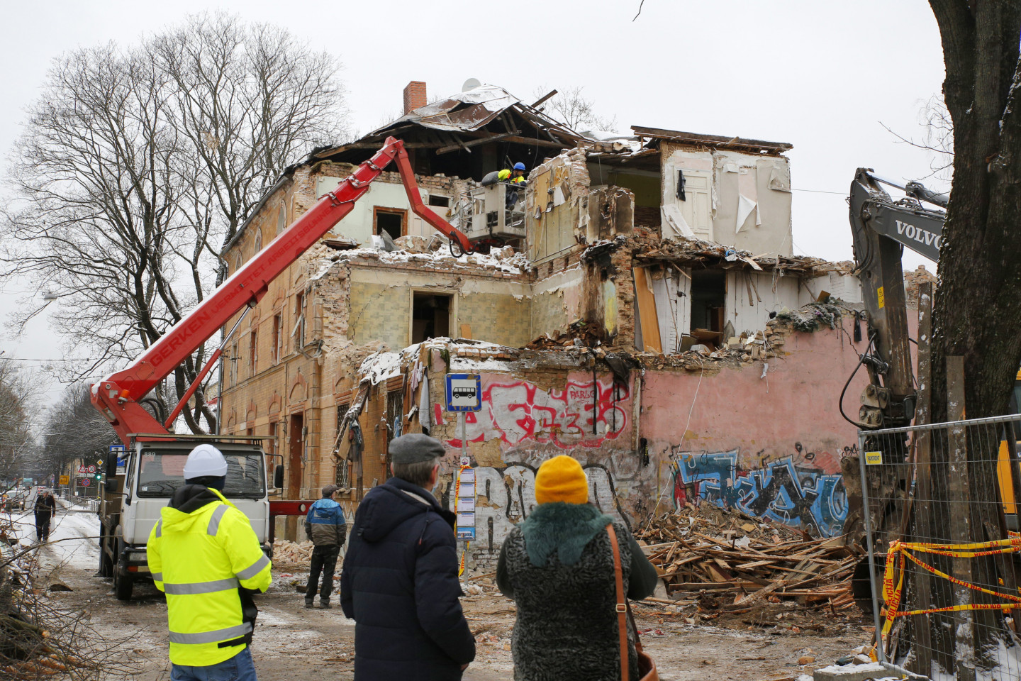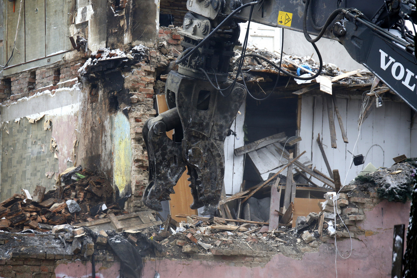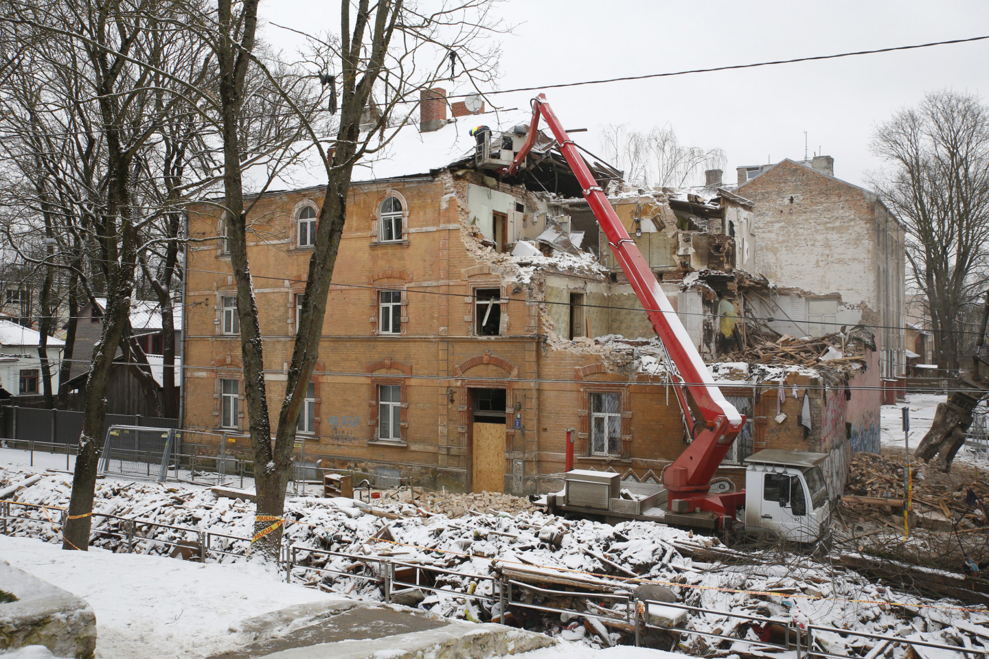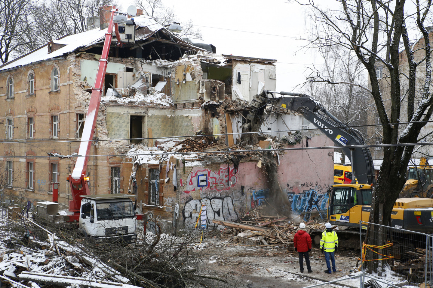 Notiek uzsprāgušās un daļēji sabrukušās daudzdzīvokļu mājas Melnsila ielā 2, Rīgā, bīstamo ēkas daļu demontāža.