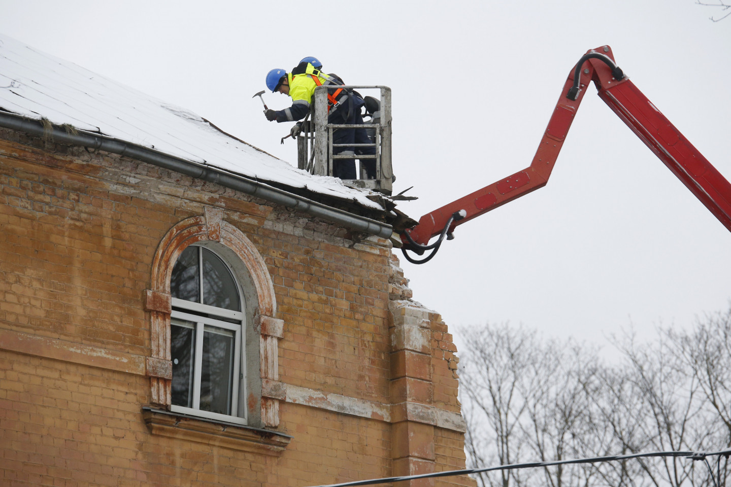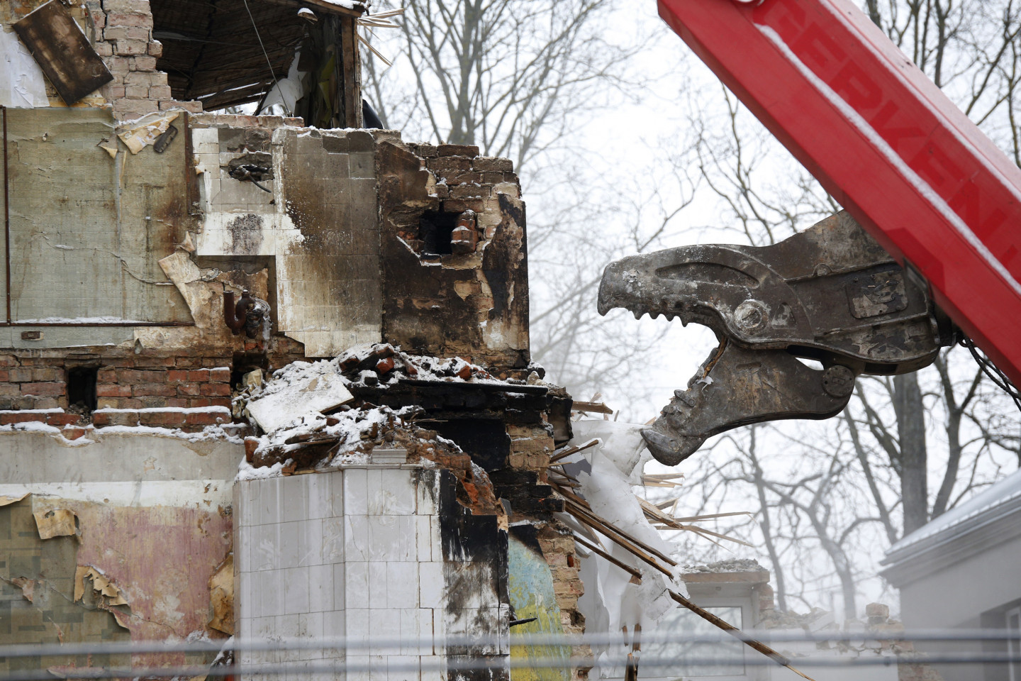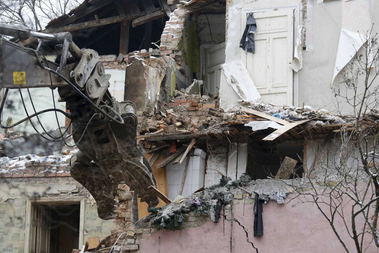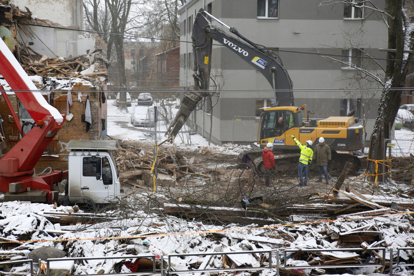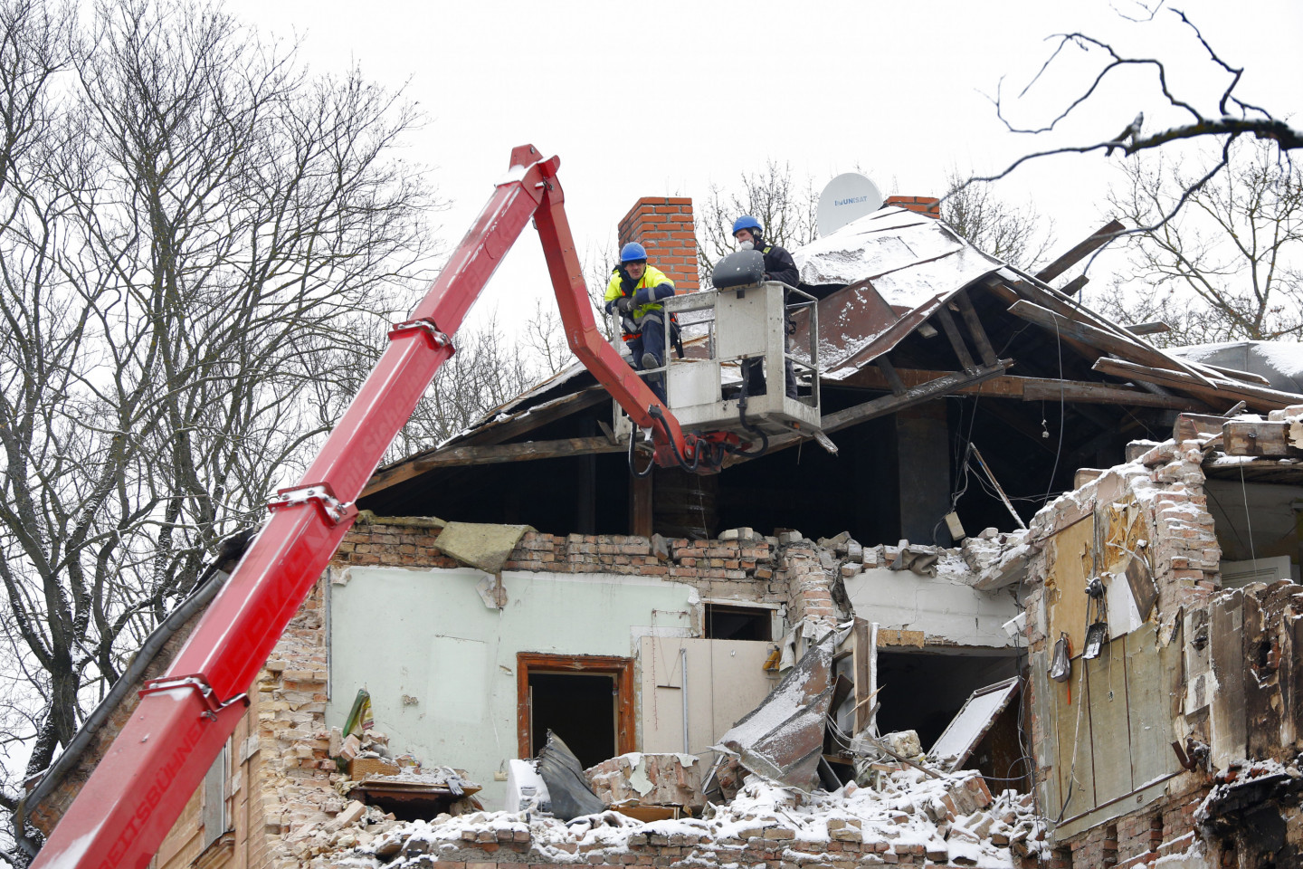 Notiek uzsprāgušās un daļēji sabrukušās daudzdzīvokļu mājas Melnsila ielā 2, Rīgā, bīstamo ēkas daļu demontāža.