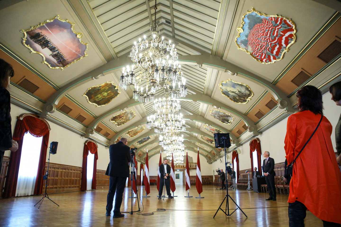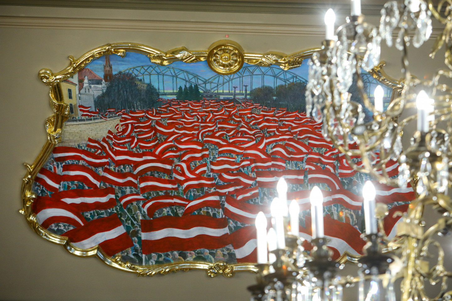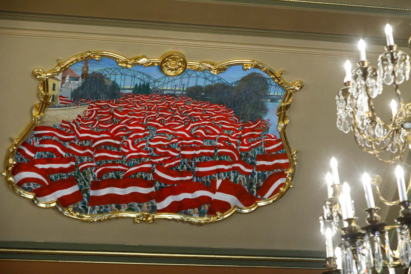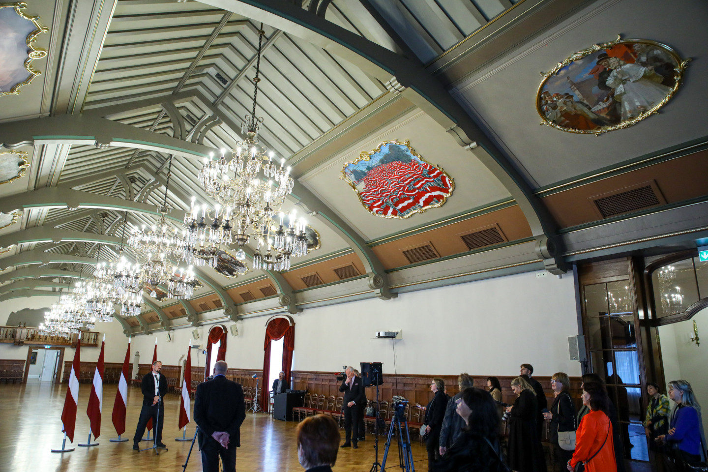Šodien plkst.12 medijiem tika izrādīti Rīgas pils Svētku zāles jaunākie griestu gleznojumi un Valsts prezidentu portretu galerijas papildinājumi. Klātesošos uzrunāja Valsts prezidenta kancelejas vadītājs Andris Teikmanis, Rīgas pils atjaunošanas padomes locekle, Latvijas Nacionālā Mākslas muzeja direktore Māra Lāce, jaunāko griestu gleznojumu autori Andris Eglītis un Aleksejs Naumovs, kā arī bijušā Valsts prezidenta Vējoņa portreta autore Frančeska Kirke. Rīgas pilī par 62 145 eiro tapuši jauni griestu gleznojumi un papildināta prezidentu portretu galerija. Rīgas pils Svētku zāles divus griestu gleznojumu - Naumova "Tautas manifestācijas Daugavmalā" un Eglīša "Latvijas Republikas dibināšana 1918.gada 18.novembrī" izgatavošanas un uzstādīšanas izmaksas ir 51 155 eiro. Lēmumu par gleznojumu nepieciešamību pieņēma Rīgas pils atjaunošanas padomes 2017.gadā. Savukārt māksliniece Kirke ir pabeigusi bijušā Valsts prezidenta Raimonda Vējoņa portretu, kas kopā ar rāmi izmaksāja 10 990 eiro.