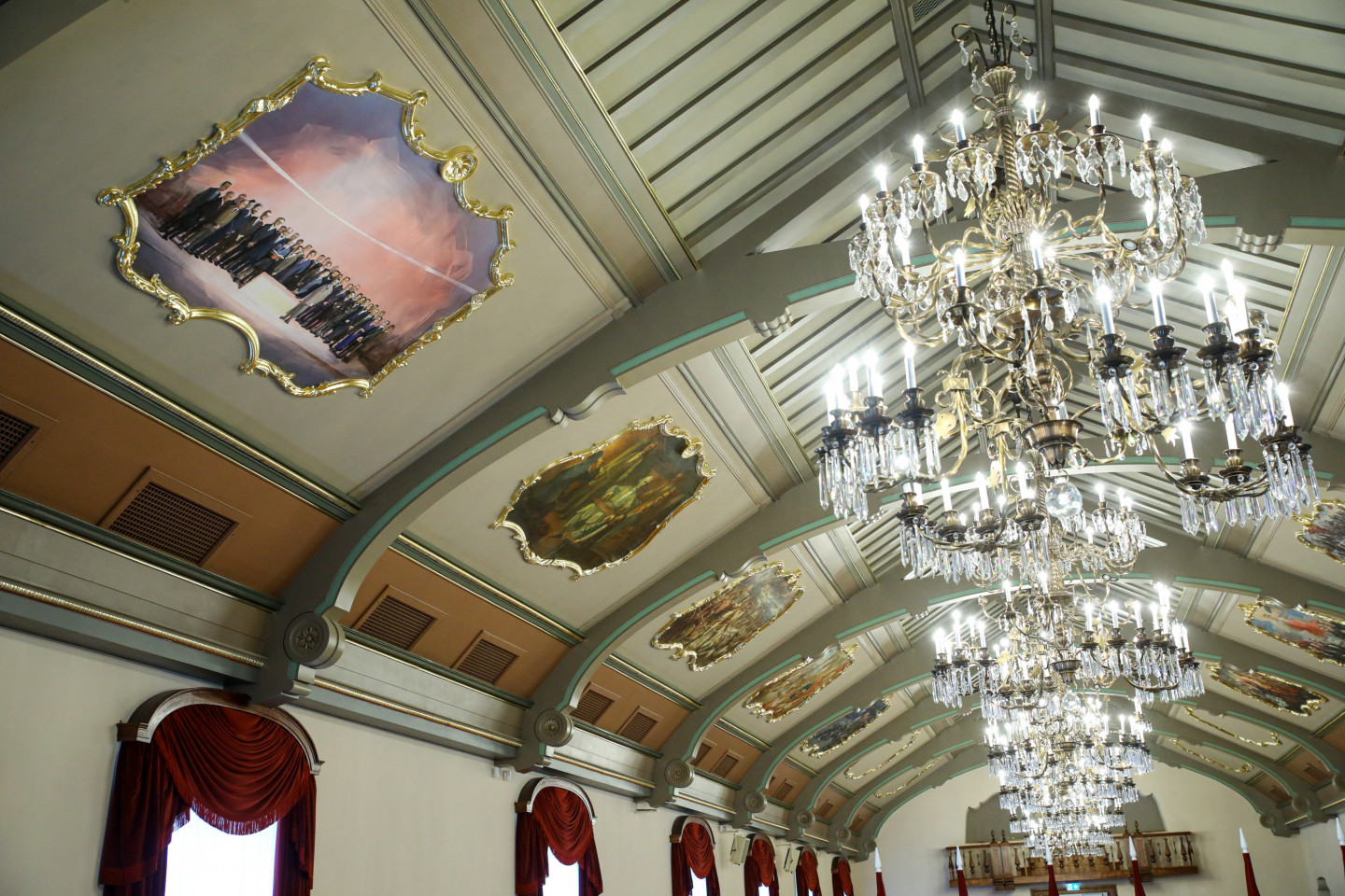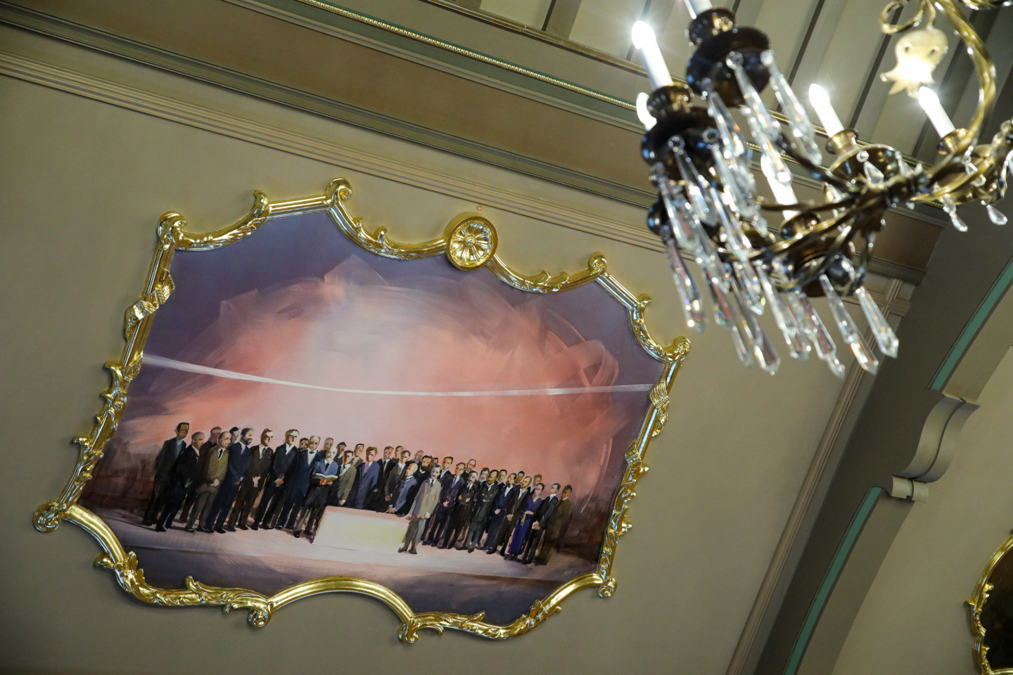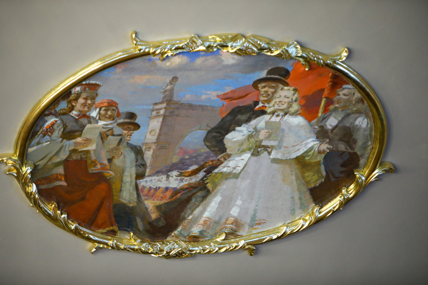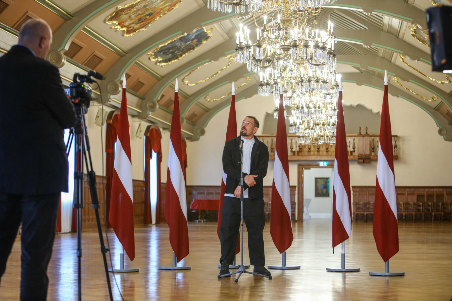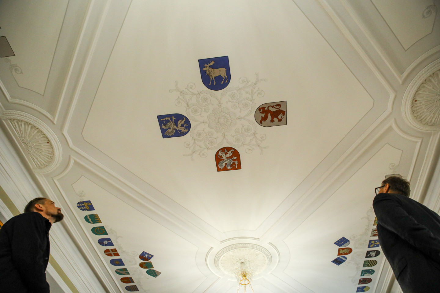 Šodien plkst.12 medijiem tika izrādīti Rīgas pils Svētku zāles jaunākie griestu gleznojumi un Valsts prezidentu portretu galerijas papildinājumi. Klātesošos uzrunāja Valsts prezidenta kancelejas vadītājs Andris Teikmanis, Rīgas pils atjaunošanas padomes locekle, Latvijas Nacionālā Mākslas muzeja direktore Māra Lāce, jaunāko griestu gleznojumu autori Andris Eglītis un Aleksejs Naumovs, kā arī bijušā Valsts prezidenta Vējoņa portreta autore Frančeska Kirke. Rīgas pilī par 62 145 eiro tapuši jauni griestu gleznojumi un papildināta prezidentu portretu galerija. Rīgas pils Svētku zāles divus griestu gleznojumu - Naumova "Tautas manifestācijas Daugavmalā" un Eglīša "Latvijas Republikas dibināšana 1918.gada 18.novembrī" izgatavošanas un uzstādīšanas izmaksas ir 51 155 eiro. Lēmumu par gleznojumu nepieciešamību pieņēma Rīgas pils atjaunošanas padomes 2017.gadā. Savukārt māksliniece Kirke ir pabeigusi bijušā Valsts prezidenta Raimonda Vējoņa portretu, kas kopā ar rāmi izmaksāja 10 990 eiro.