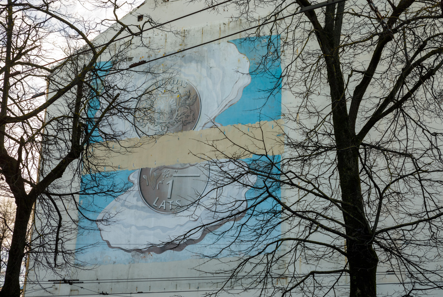 TOP fotokadrs F/64, 16.01.2023. Lata monētas zīmējums uz ēkas Lāčplēša ielā.