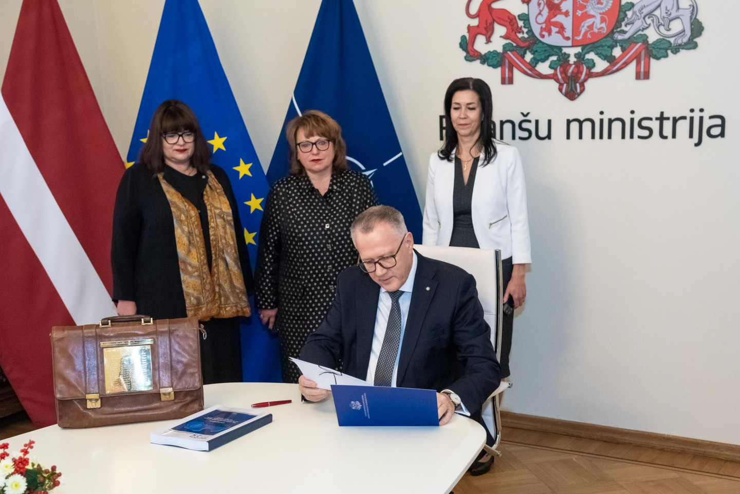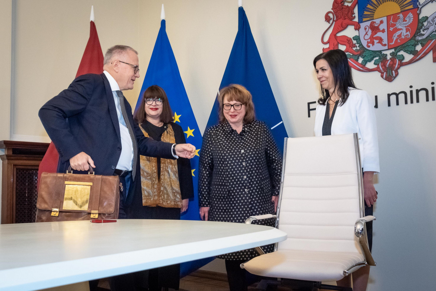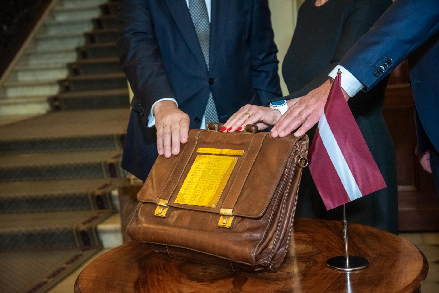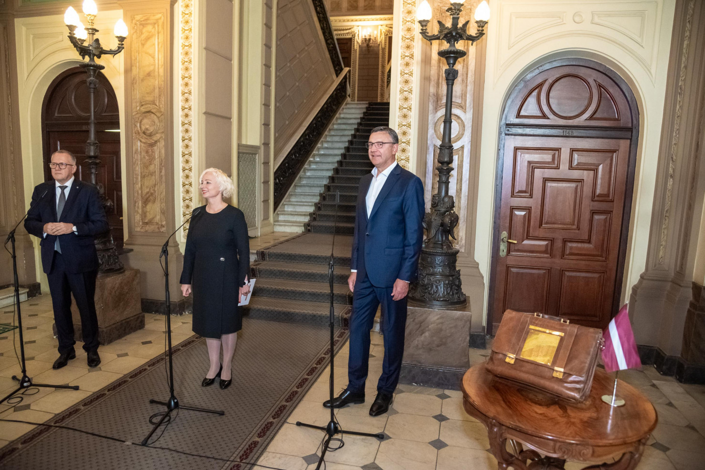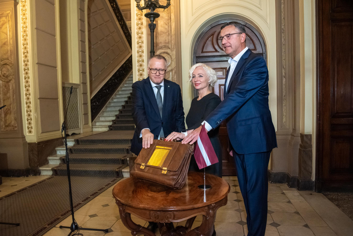 Saeimas priekšsēdētāja Daiga Mieriņa (ZZS) šodien no finanšu ministra Arvila Ašeradena (JV) parlamenta ēkā saņēma 2025.gada valsts budžeta projektu.