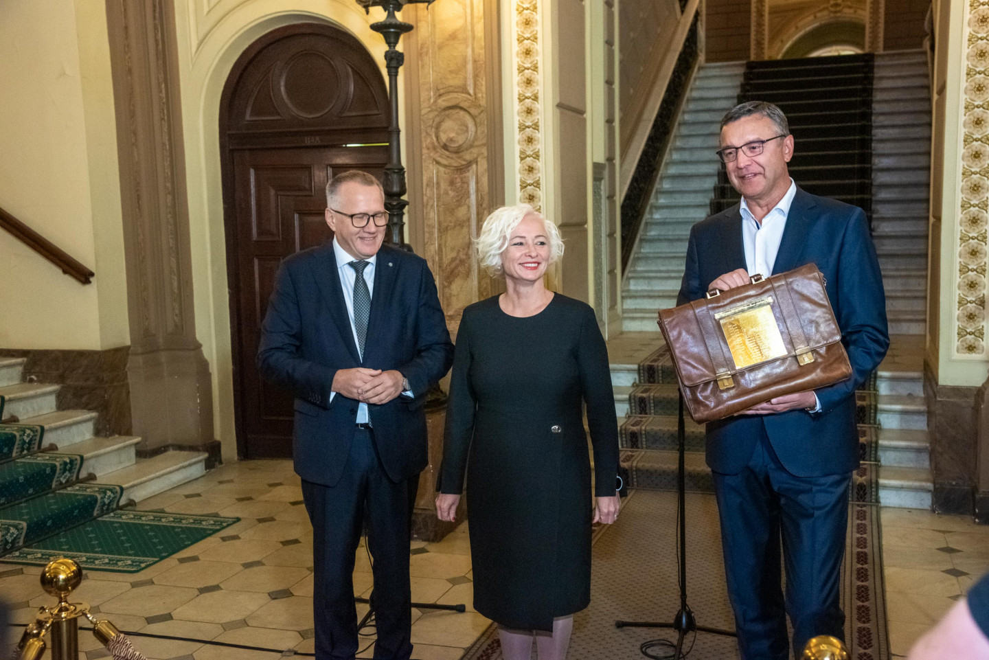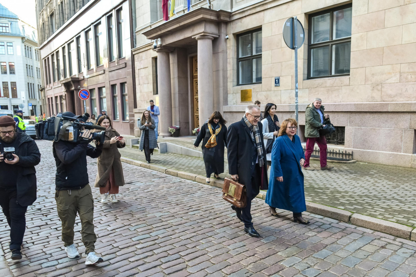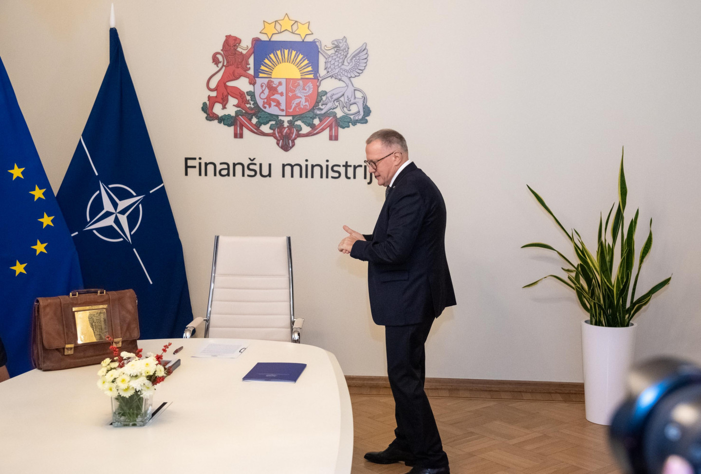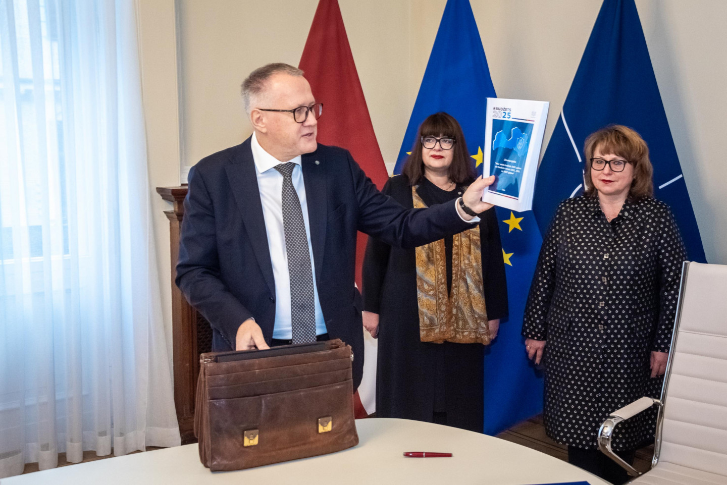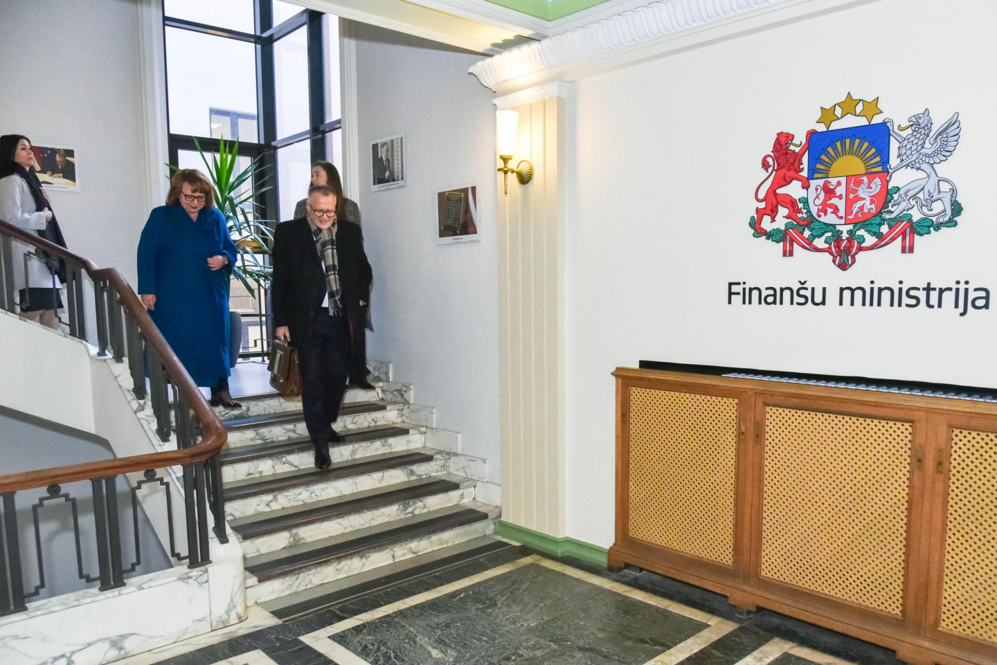 Saeimas priekšsēdētāja Daiga Mieriņa (ZZS) šodien no finanšu ministra Arvila Ašeradena (JV) parlamenta ēkā saņēma 2025.gada valsts budžeta projektu.