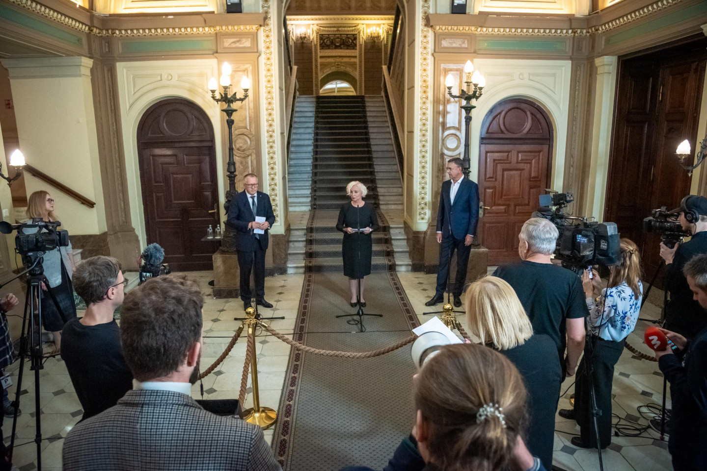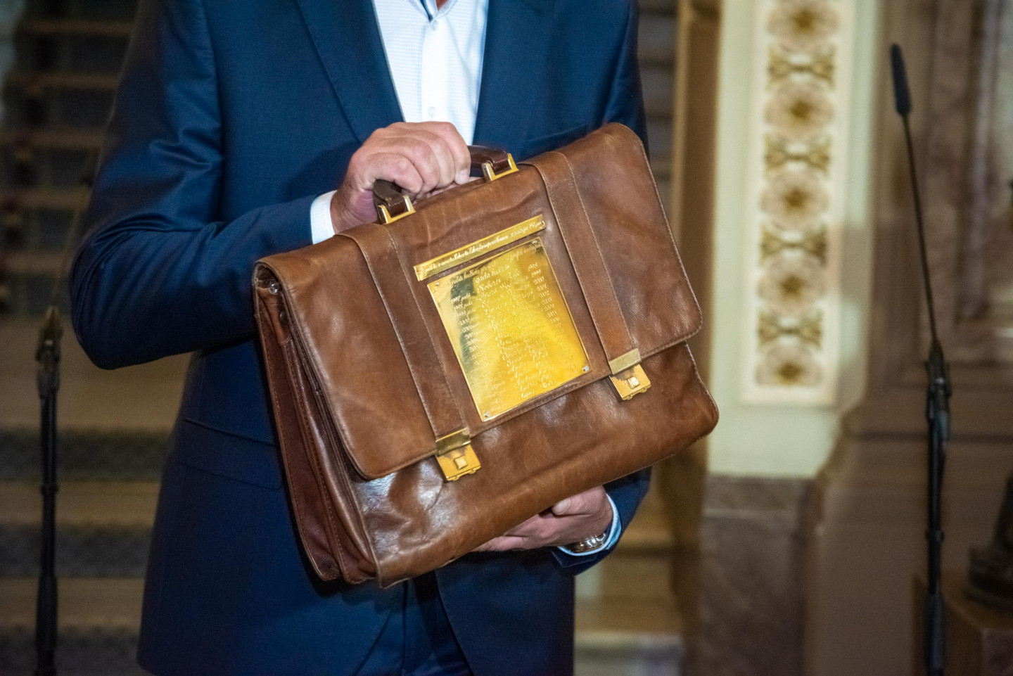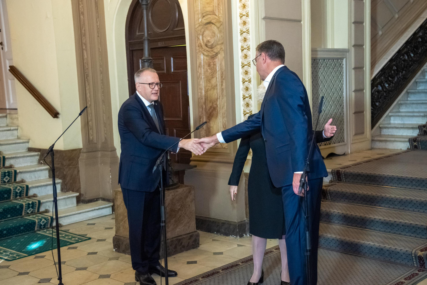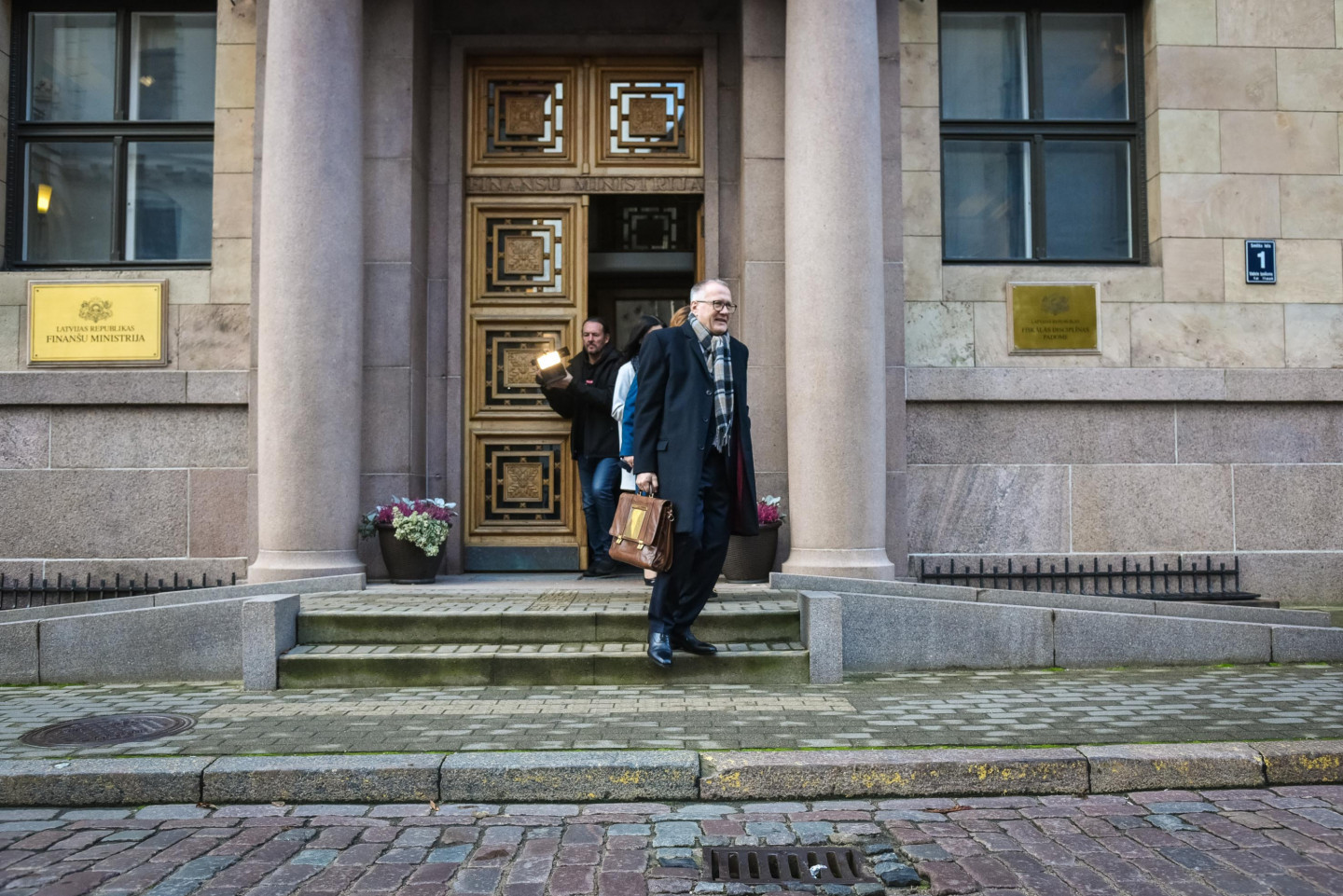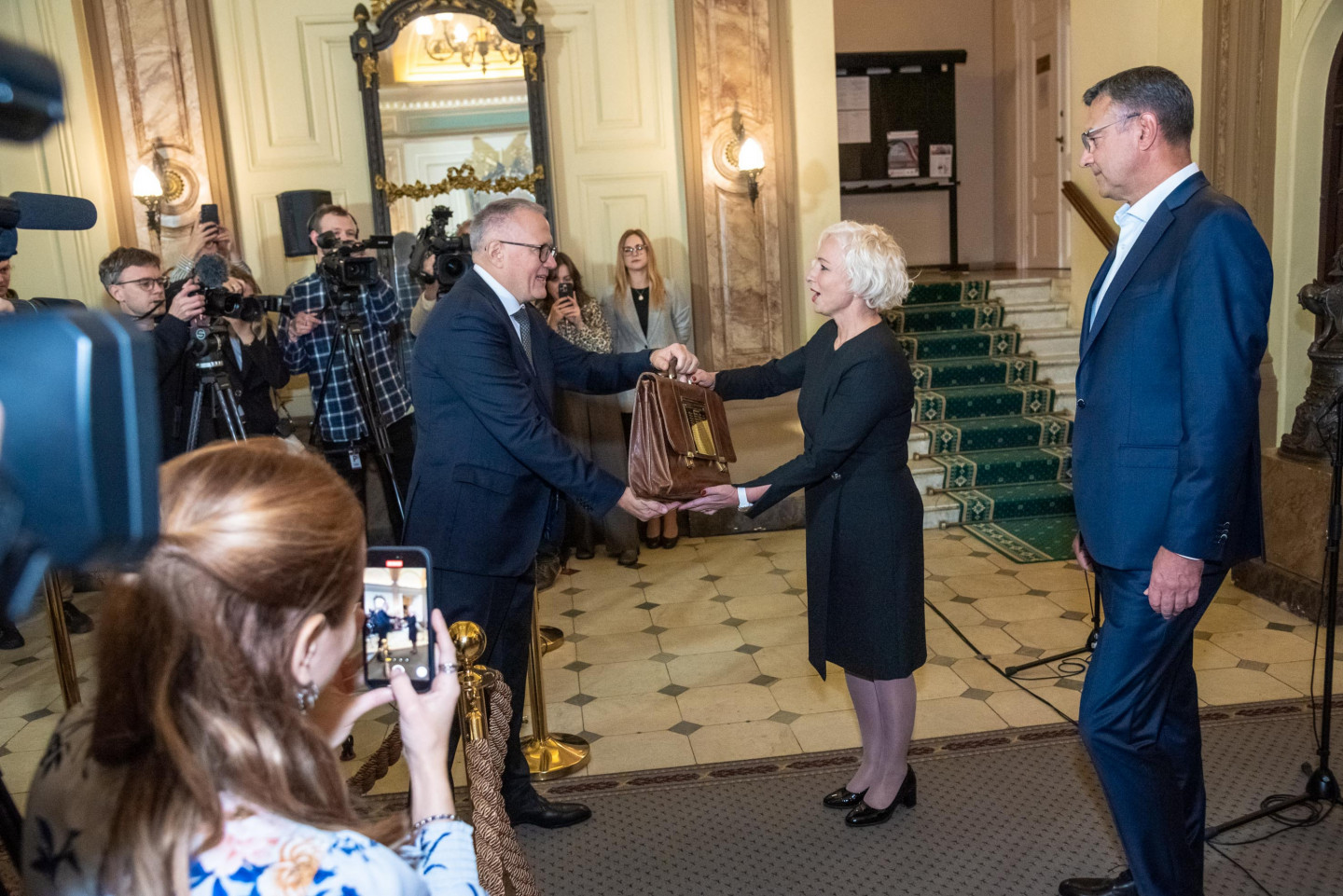 Saeimas priekšsēdētāja Daiga Mieriņa (ZZS) šodien no finanšu ministra Arvila Ašeradena (JV) parlamenta ēkā saņēma 2025.gada valsts budžeta projektu.