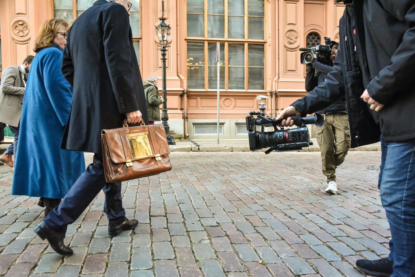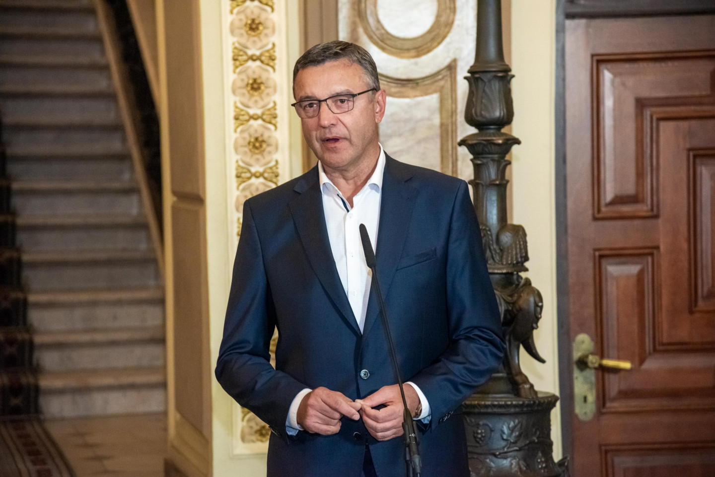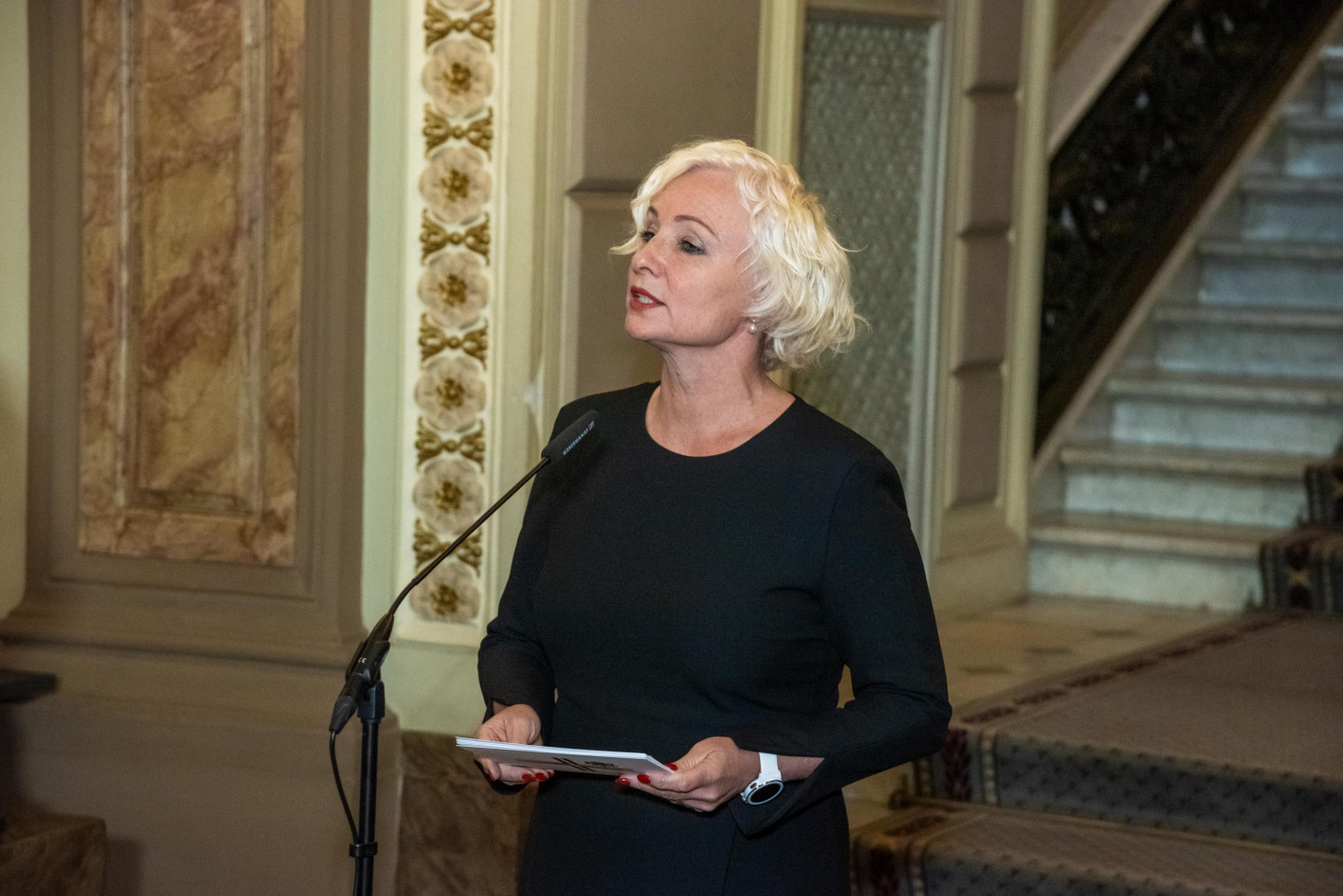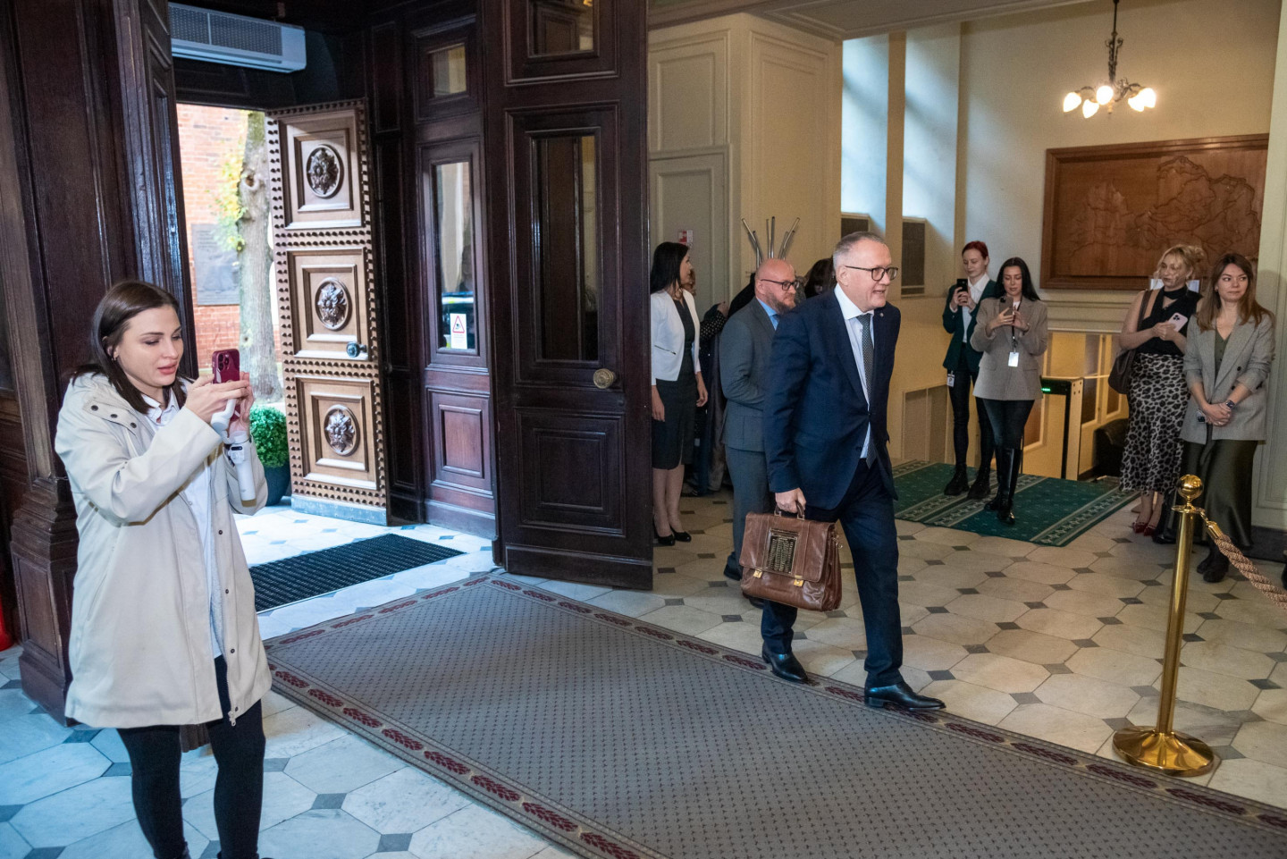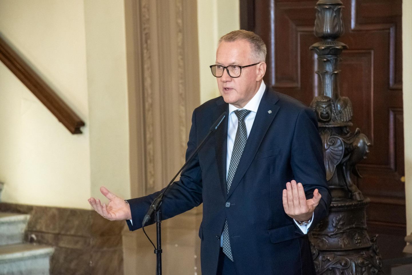 Saeimas priekšsēdētāja Daiga Mieriņa (ZZS) šodien no finanšu ministra Arvila Ašeradena (JV) parlamenta ēkā saņēma 2025.gada valsts budžeta projektu.