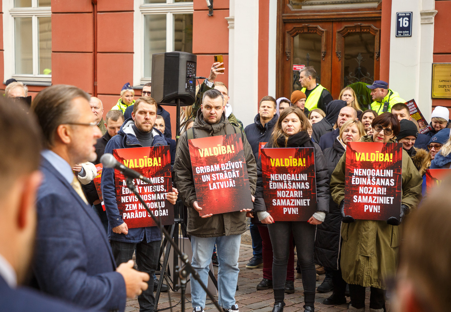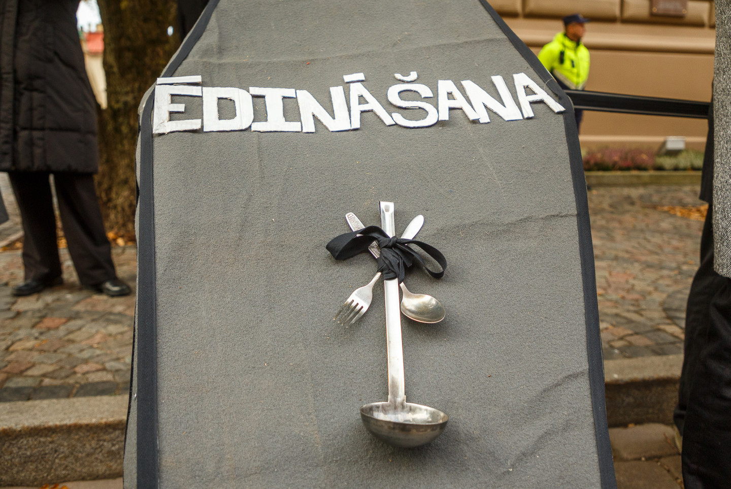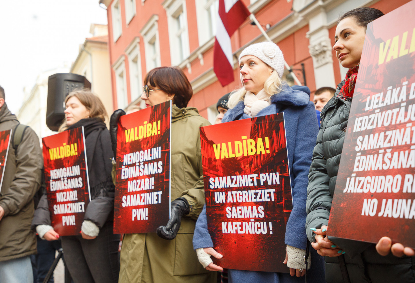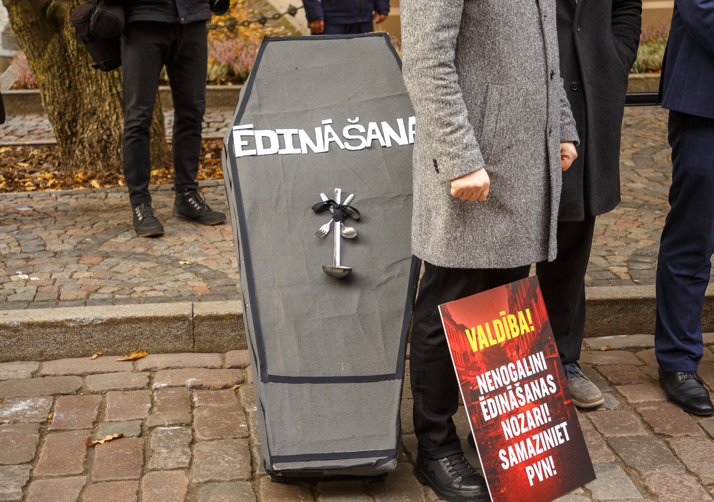 Viesmīlības nozares pārstāvju rīkots pikets pie Saeimas, lai lūgtu sabiedriskās ēdināšanas pakalpojumiem noteikt pievienotās vērtības nodokļa samazināto likmi 12% apmērā.
