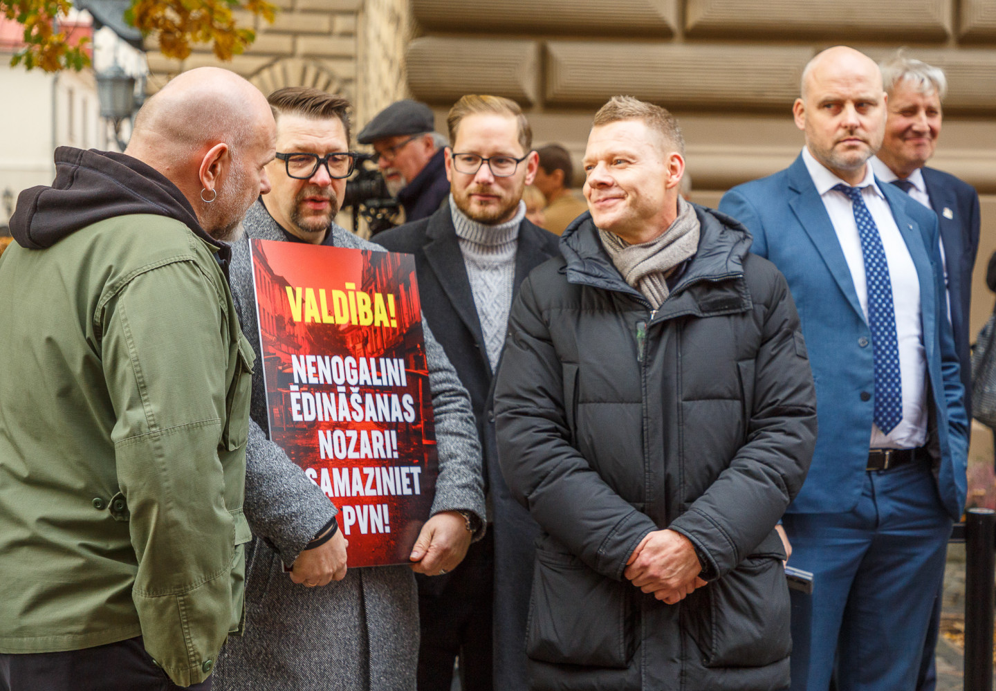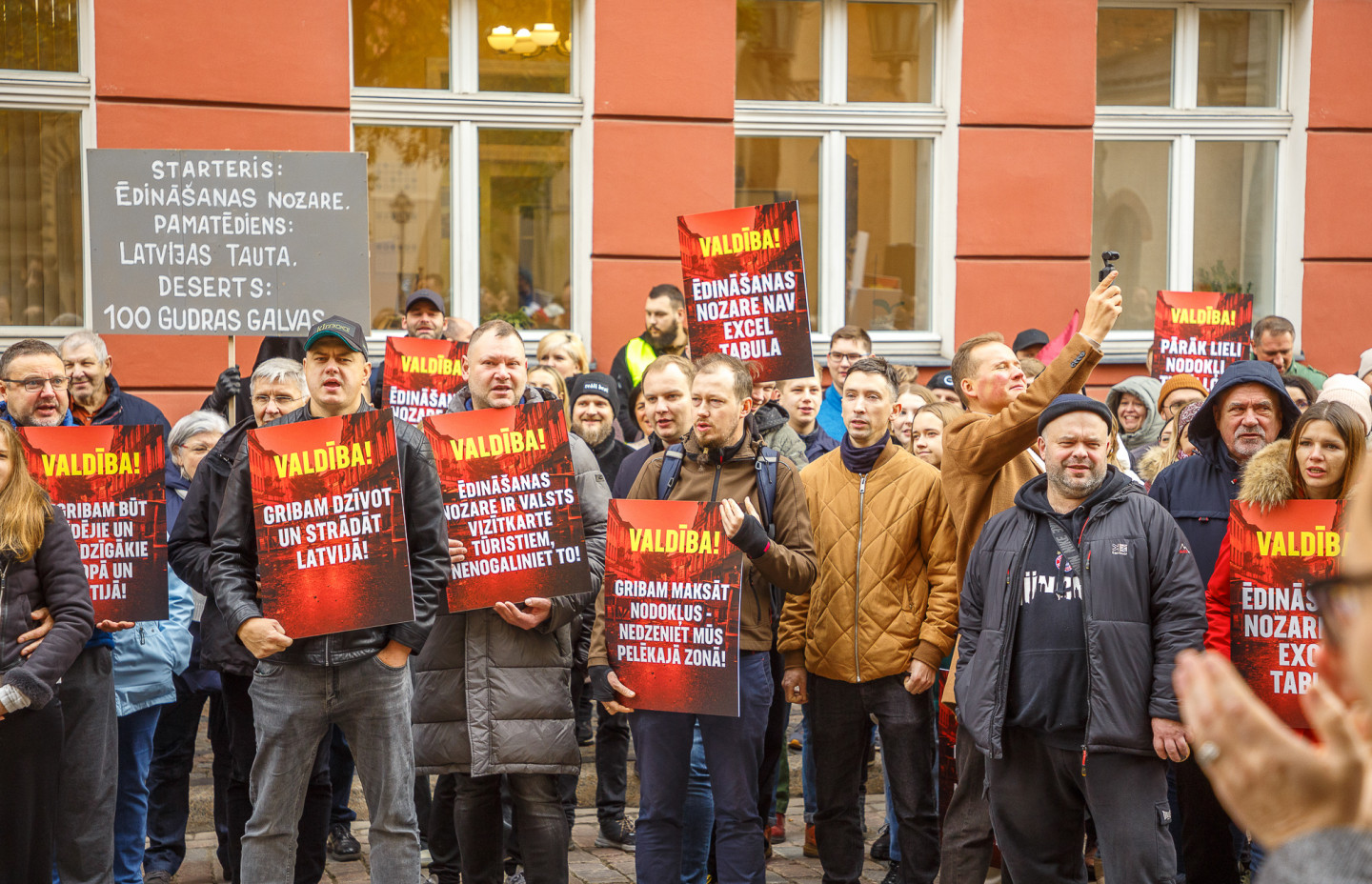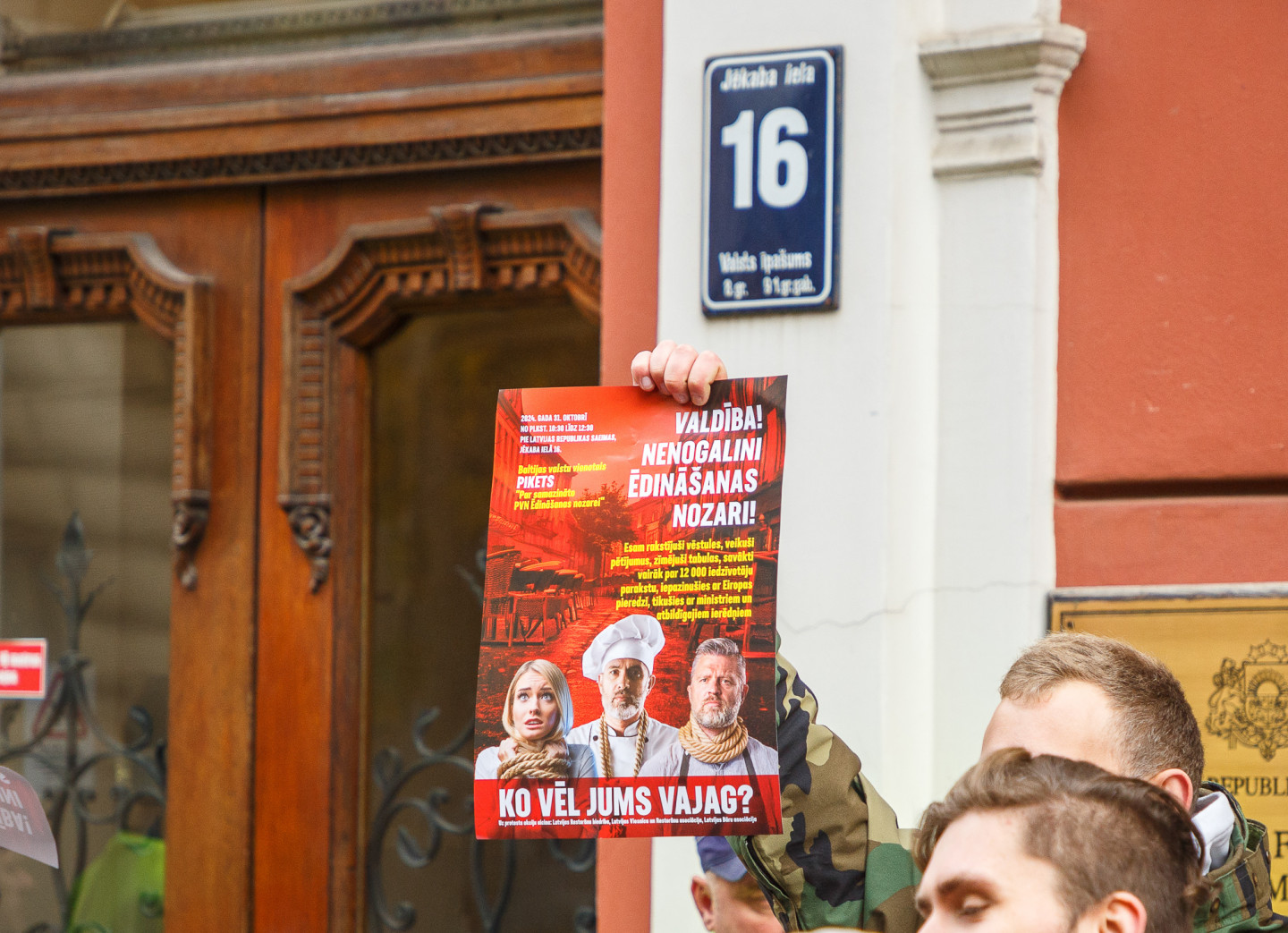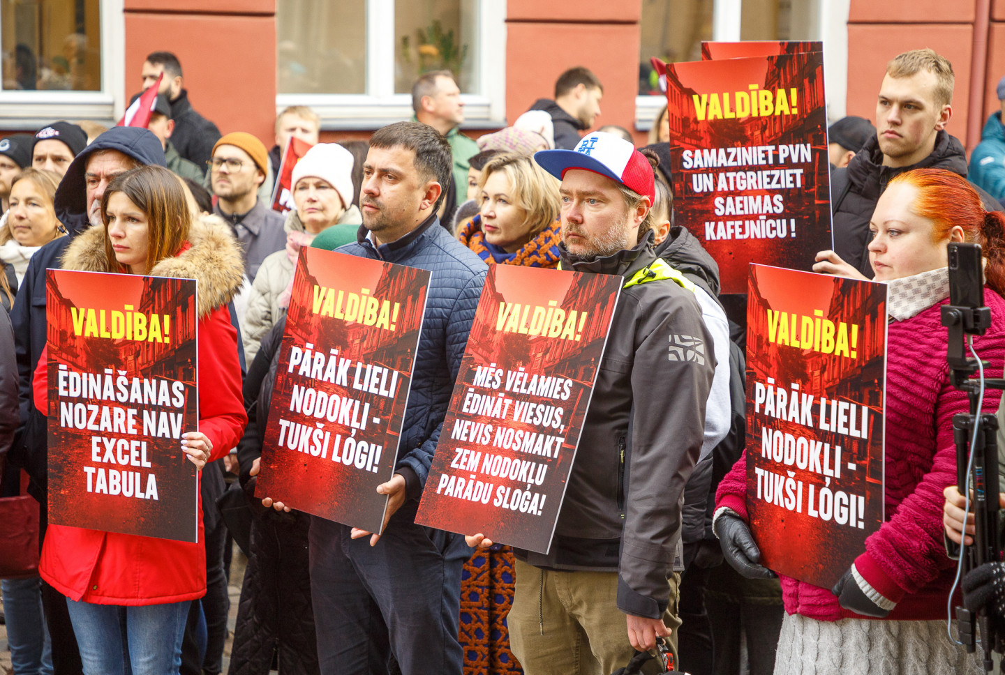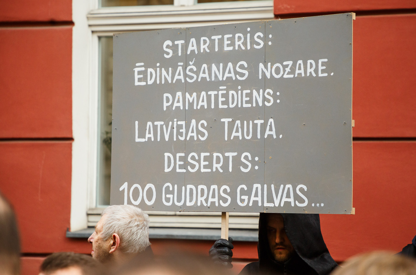 Viesmīlības nozares pārstāvju rīkots pikets pie Saeimas, lai lūgtu sabiedriskās ēdināšanas pakalpojumiem noteikt pievienotās vērtības nodokļa samazināto likmi 12% apmērā.