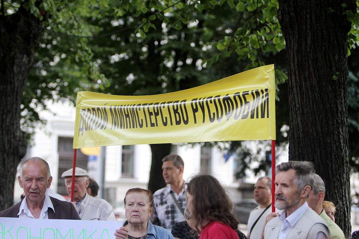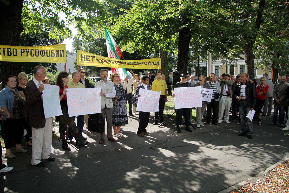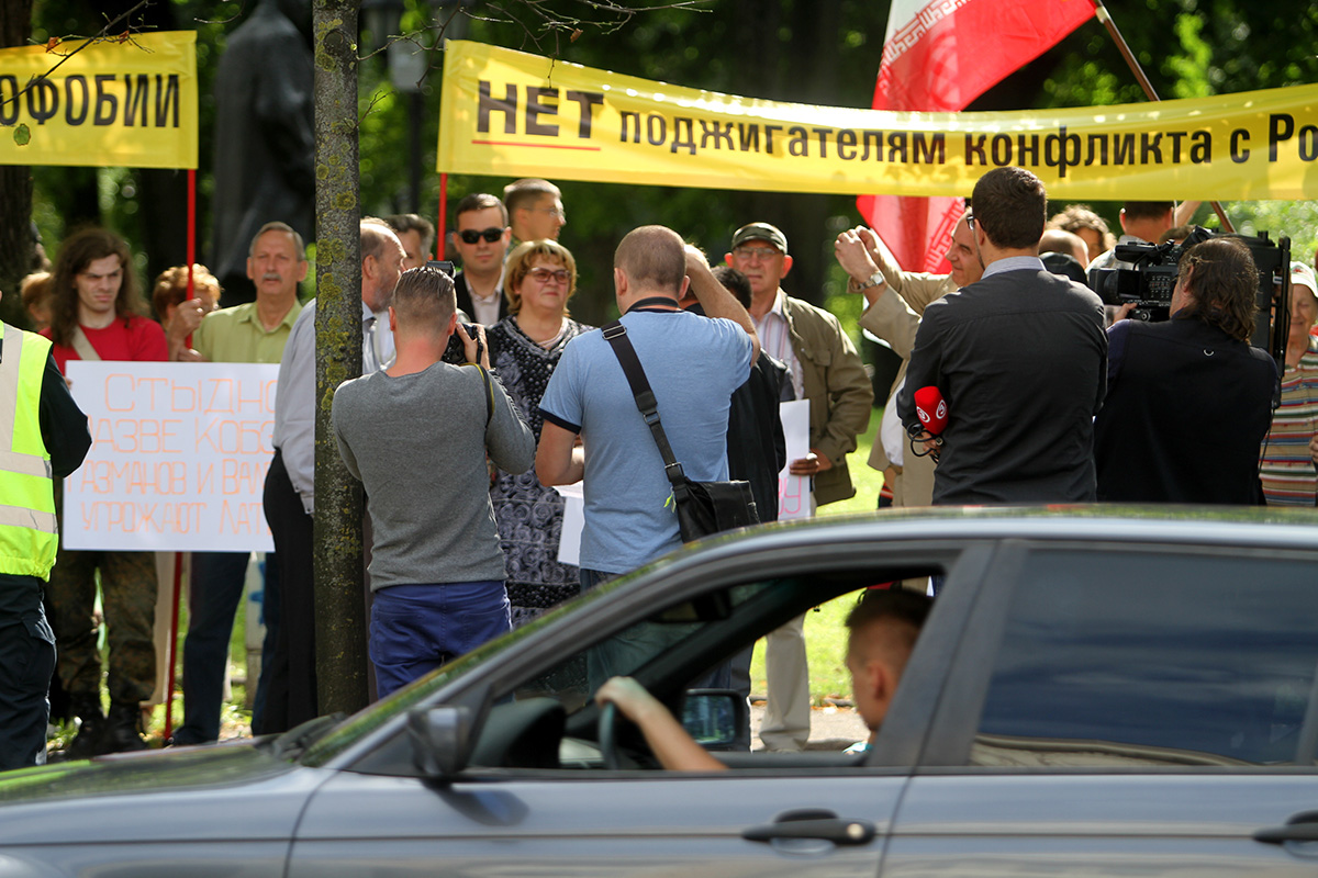 Šodien ap pusdienlaiku Latvijas Krievu savienības (LKS) pārstāvja Jakova Plinera rīkotajā protesta akcijā pie Ārlietu ministrijas (ĀM) aptuveni 50 cilvēku pieprasīja ministra Edgara Rinkēviča (V) atkāpšanos no amata.