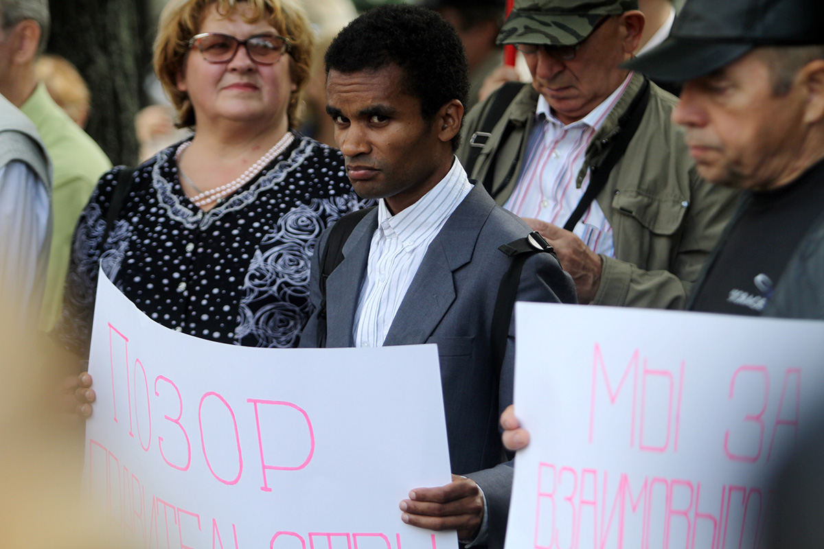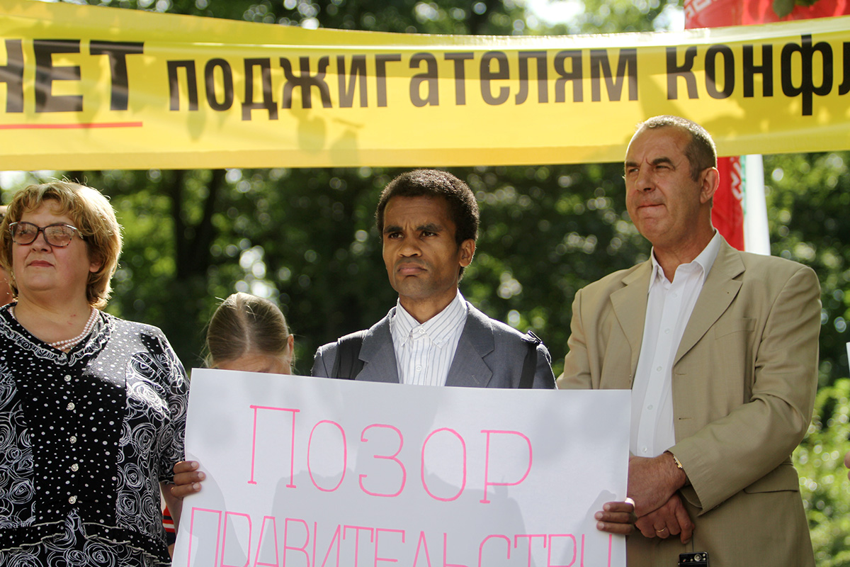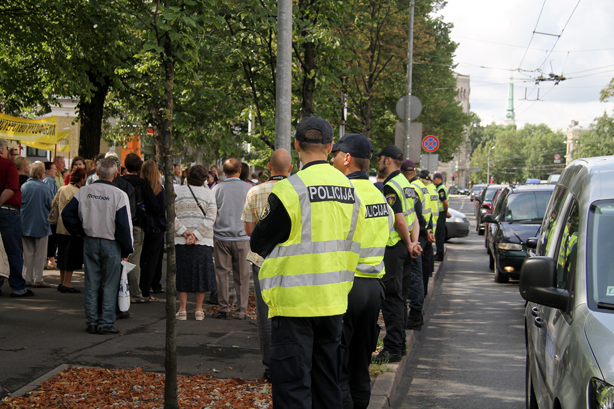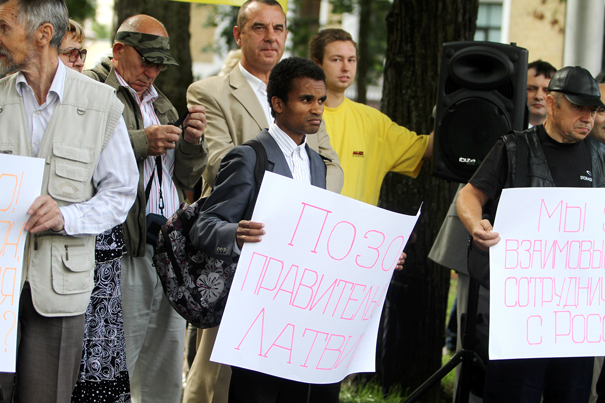 Šodien ap pusdienlaiku Latvijas Krievu savienības (LKS) pārstāvja Jakova Plinera rīkotajā protesta akcijā pie Ārlietu ministrijas (ĀM) aptuveni 50 cilvēku pieprasīja ministra Edgara Rinkēviča (V) atkāpšanos no amata.