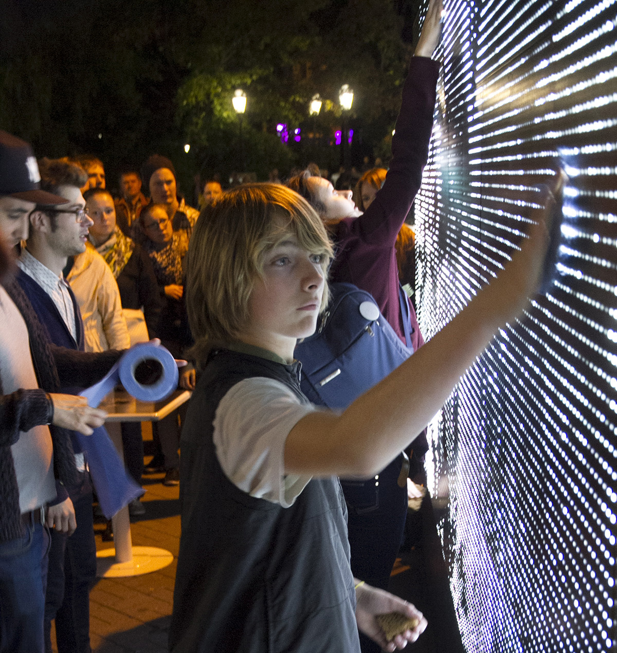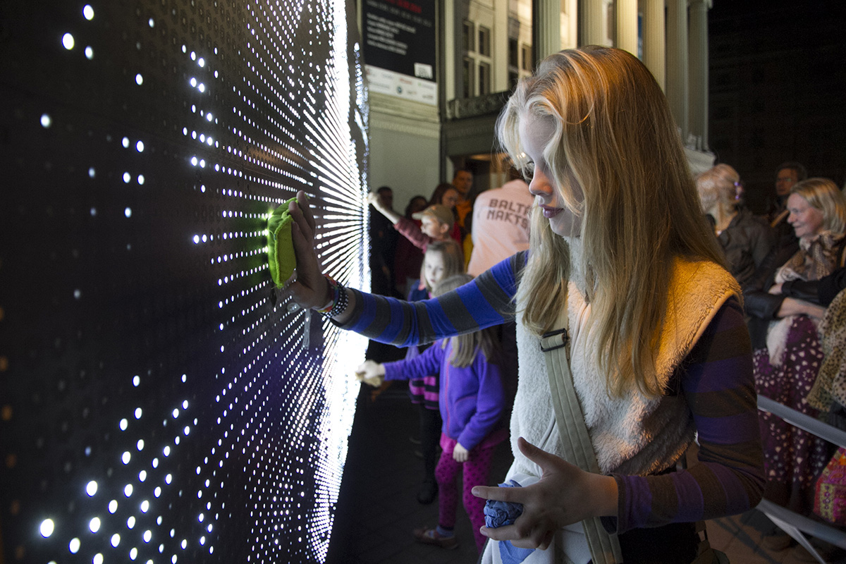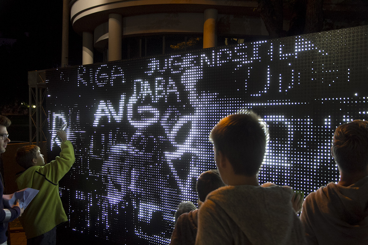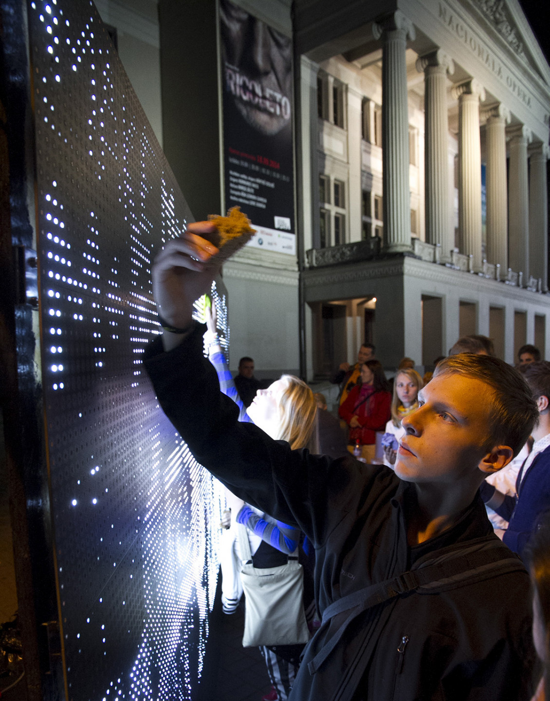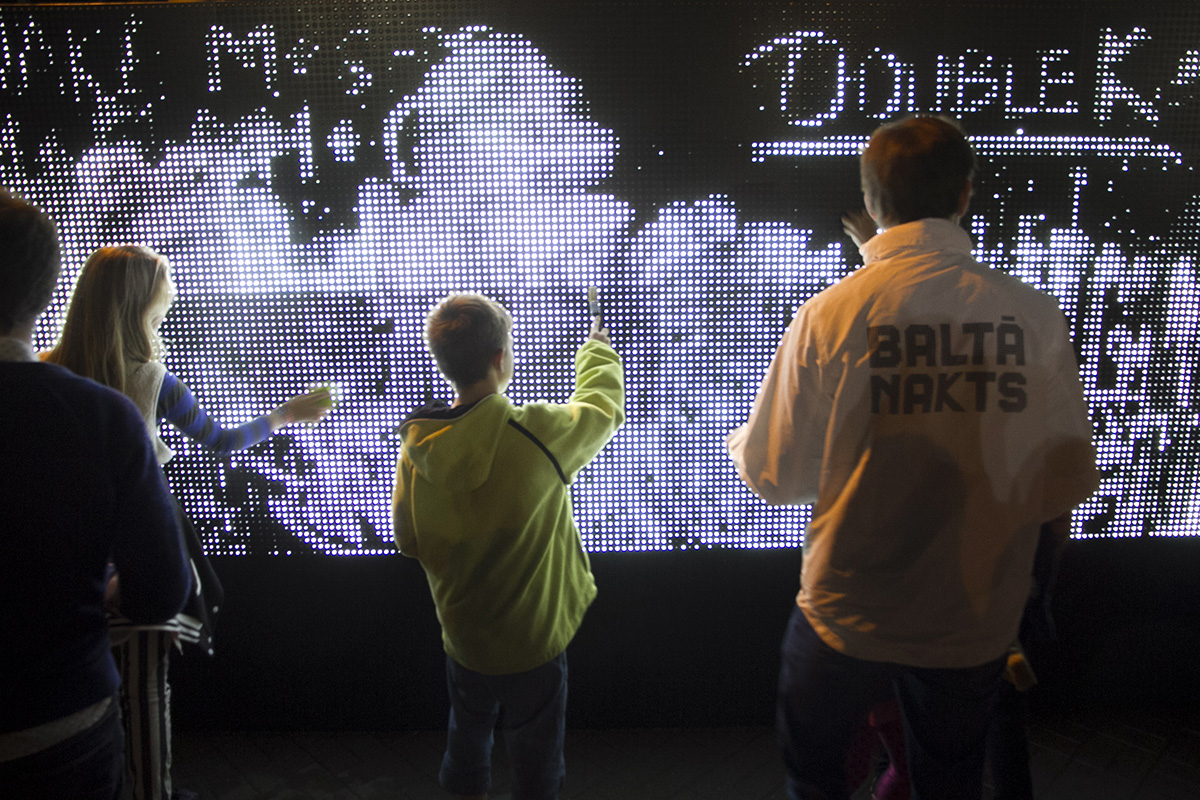 Ūdens–gaismas grafiti/ Water light grafiti "Ūdens–gaismas grafiti" ir franču mākslinieka Antonīna Fornē fizikas un mākslas instalācija, kas sevī apvieno divas pasaules pamatstihijas – gaismu un ūdeni. Un ne bez radības kroņa – cilvēka iejaukšanās! Antonīns Fornē piedāvā ikvienam rīdziniekam piedalīties suģestējošā mākslas radīšanas aktā – ar ūdeni gleznojot gaismas attēlus un zīmes. Pateicoties pārsteidzošai atraktivitātei un spējai piesaistīt plašu publikas atsaucību «Ūdens-gaismas graffiti» pabijis jau vairāku pilsētu Balto nakšu programmās, kā arī vairākos nozīmīgos un populāros dažādu mākslu festivālos Eiropā un citviet pasaulē. Instalācijas uzbūves pamatā ir LED gaismiņu «tāfele», sastāvoša no tūkstošiem spuldzīšu, uz kuras var zīmēt, izmantojot visparastāko ūdens strūklu.