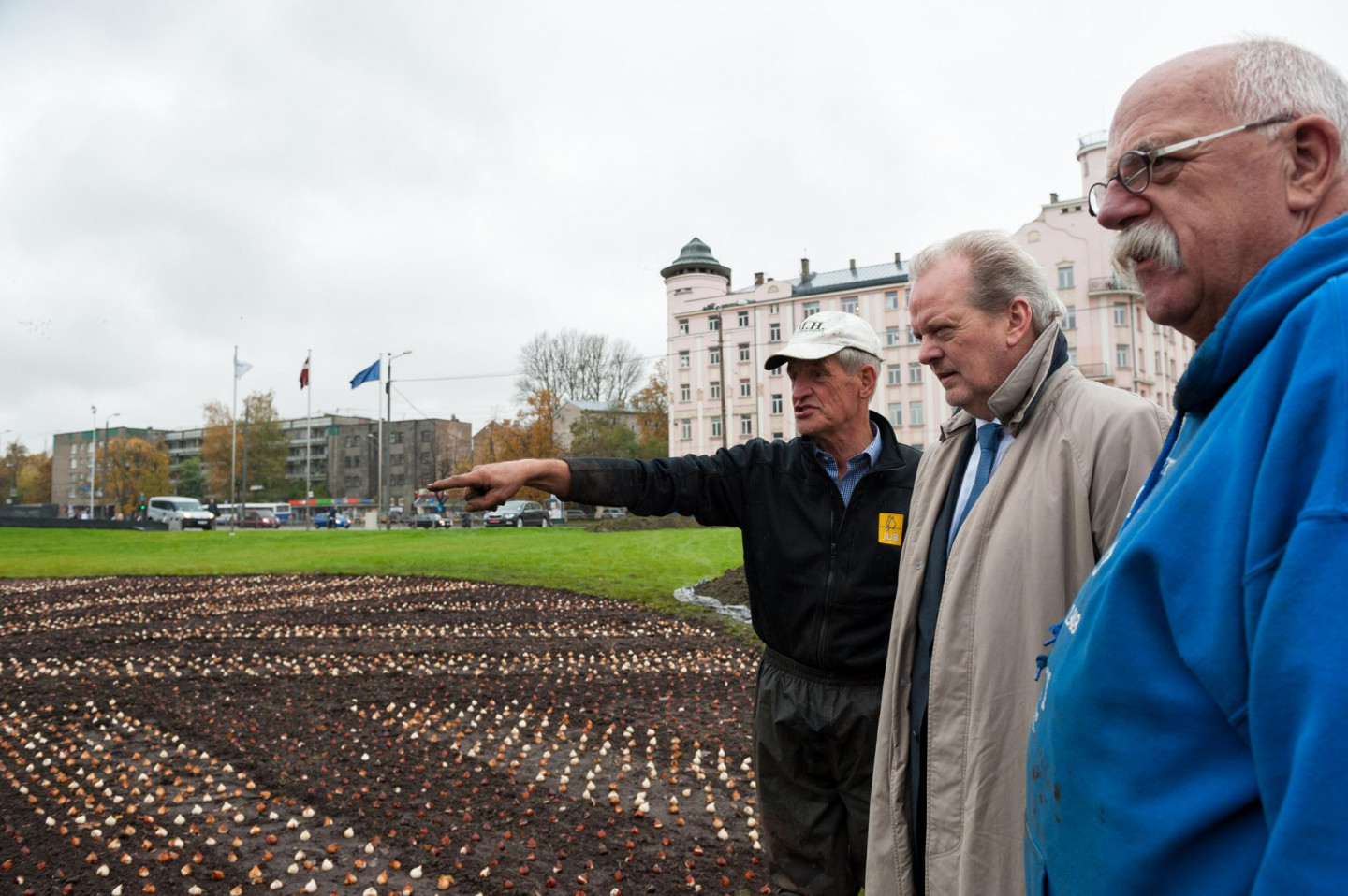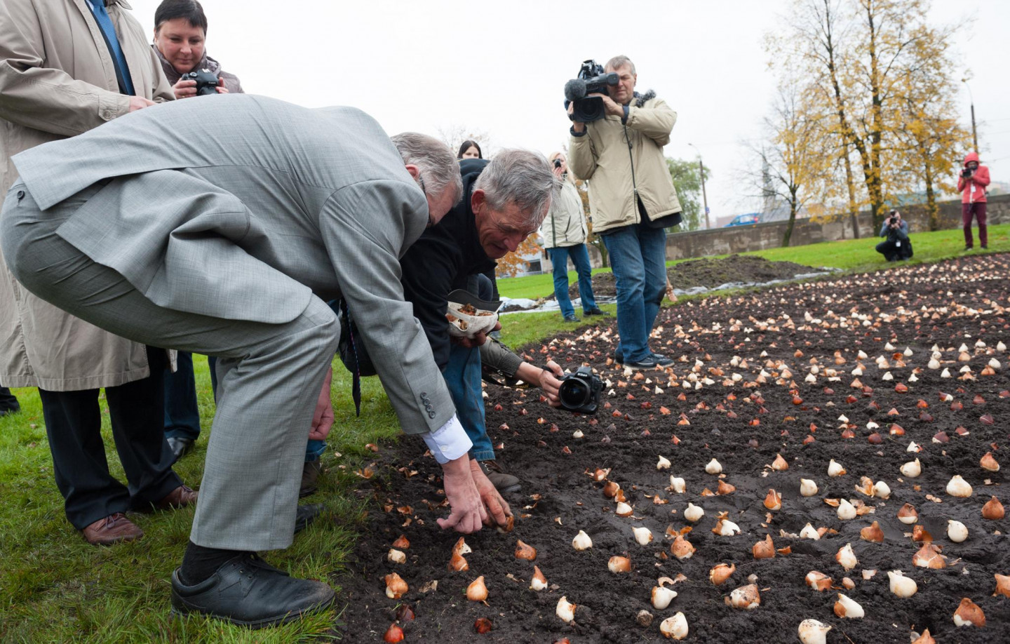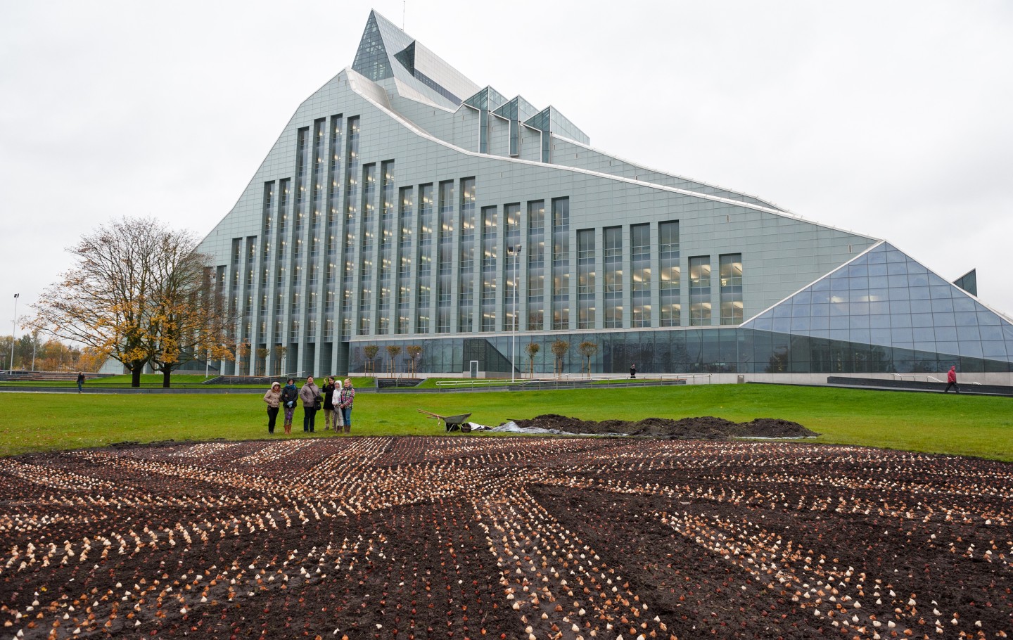 Pie Latvijas Nacionālās bibliotēkas noslēdzas Nīderlandes vēstniecības dāvātās tulpju dobes stādīšana par godu Latvijas prezidentūrai Eiropas Savienības Padomē