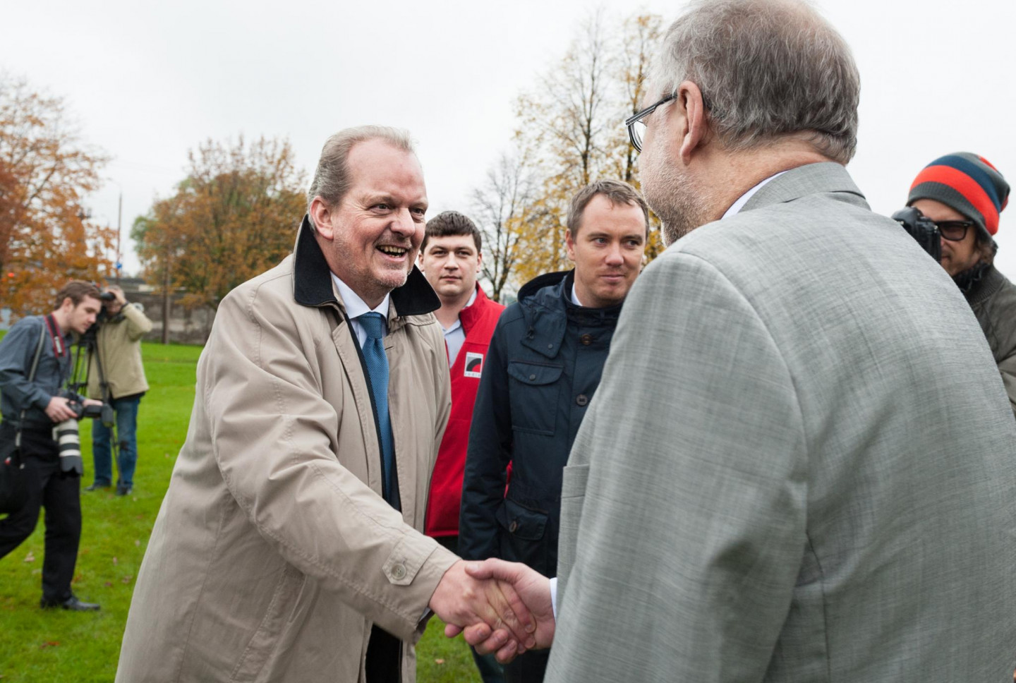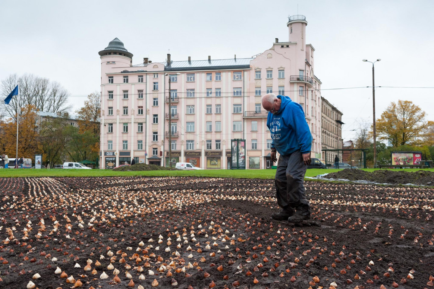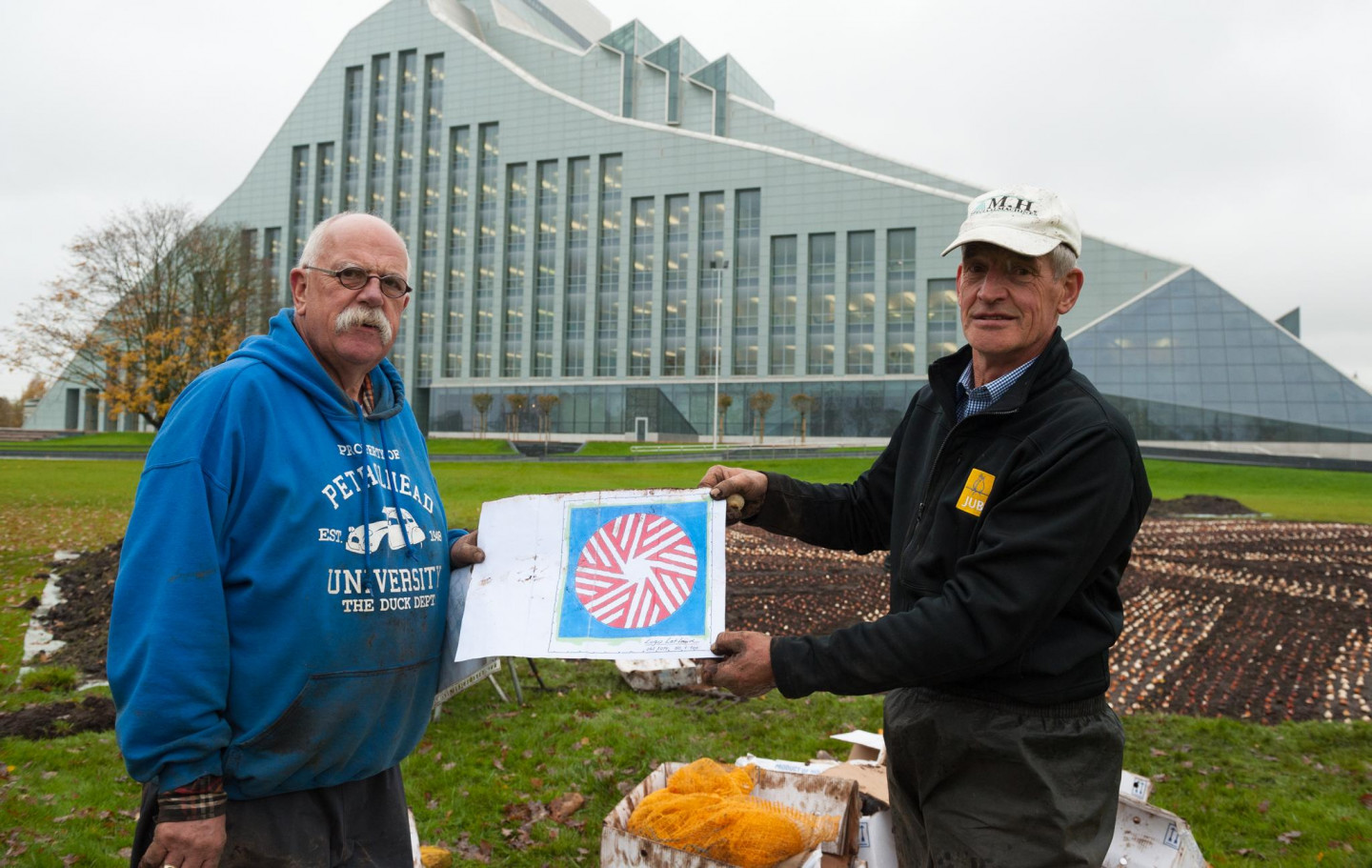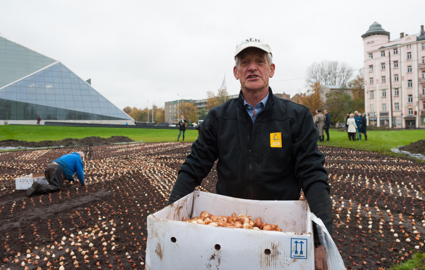 Pie Latvijas Nacionālās bibliotēkas noslēdzas Nīderlandes vēstniecības dāvātās tulpju dobes stādīšana par godu Latvijas prezidentūrai Eiropas Savienības Padomē