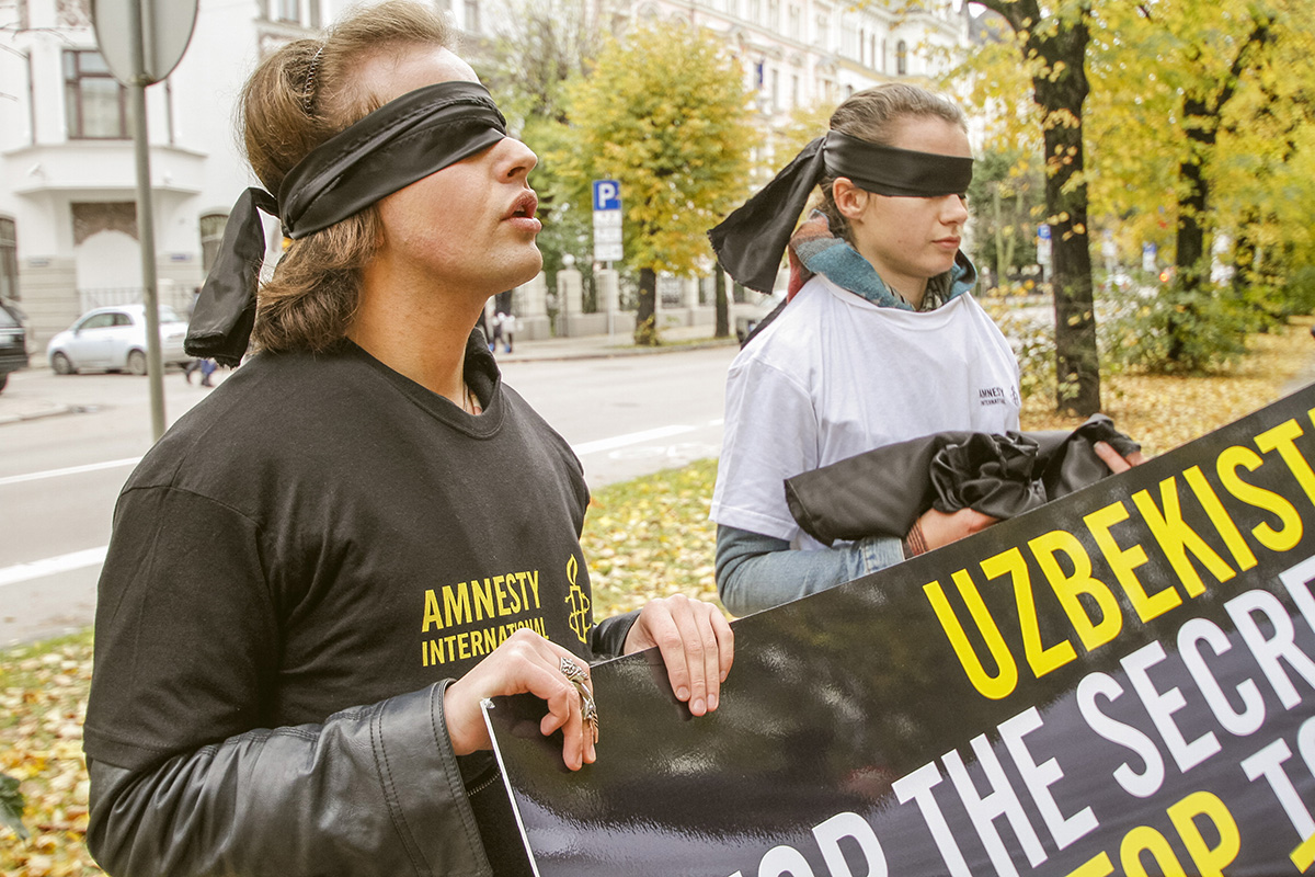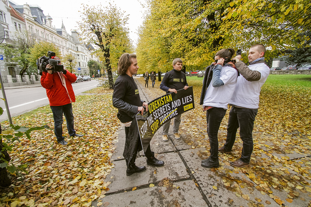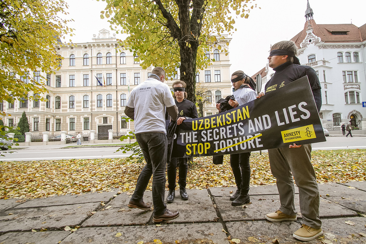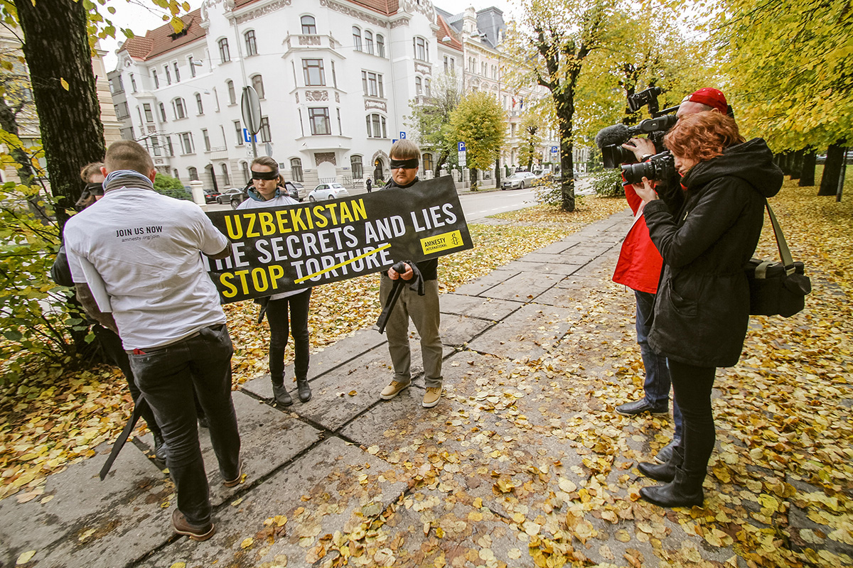 Šodien "Amnesty International" rīkotajā fotoakcijā pie Uzbekistānas vēstniecības četri cilvēki aicina pievērst uzmanību šajā valstī veiktajai spīdzināšanai. Trīs cilvēki ar aizsietām acīm un rokām aptuveni piecas minūtes turēja plakātu ar uzrakstu angļu valodā - "Stop noslēpumiem un meliem. Stop spīdzināšanai Uzbekistānā".