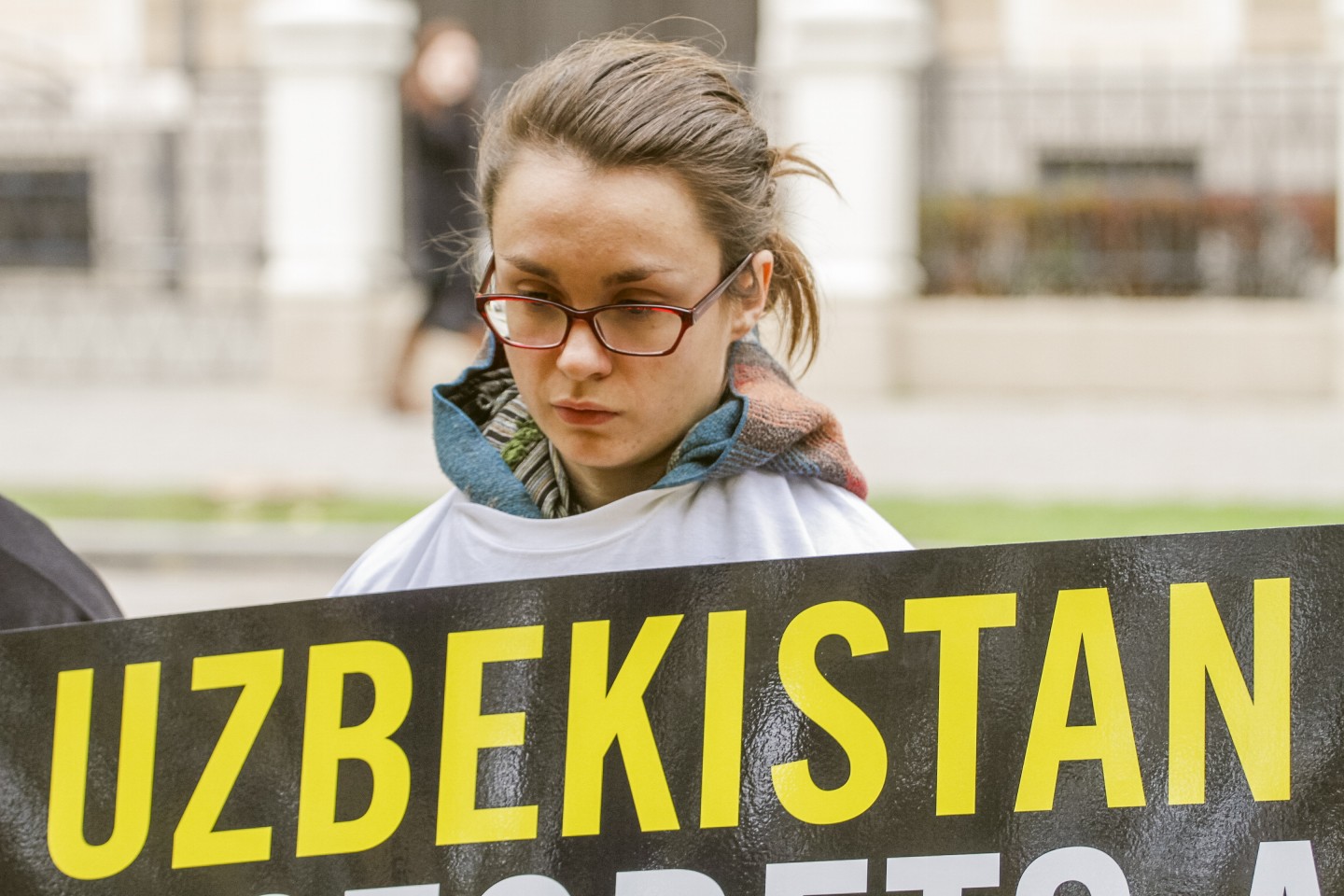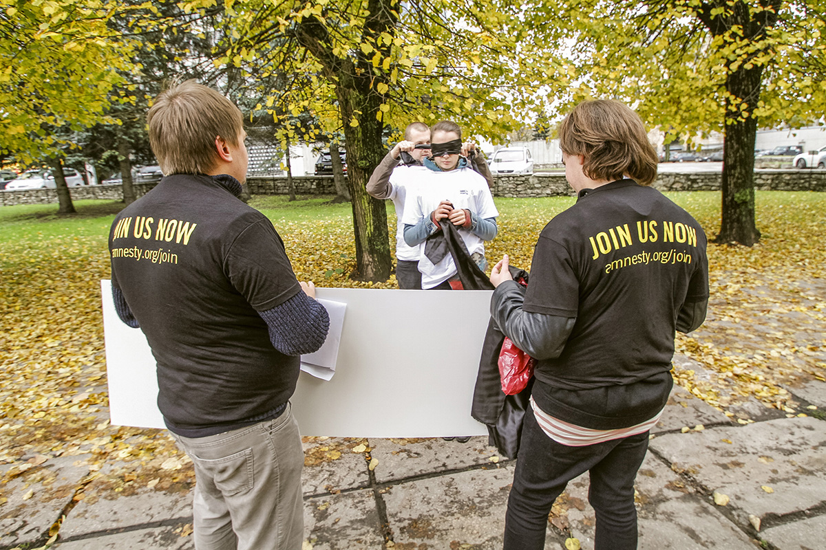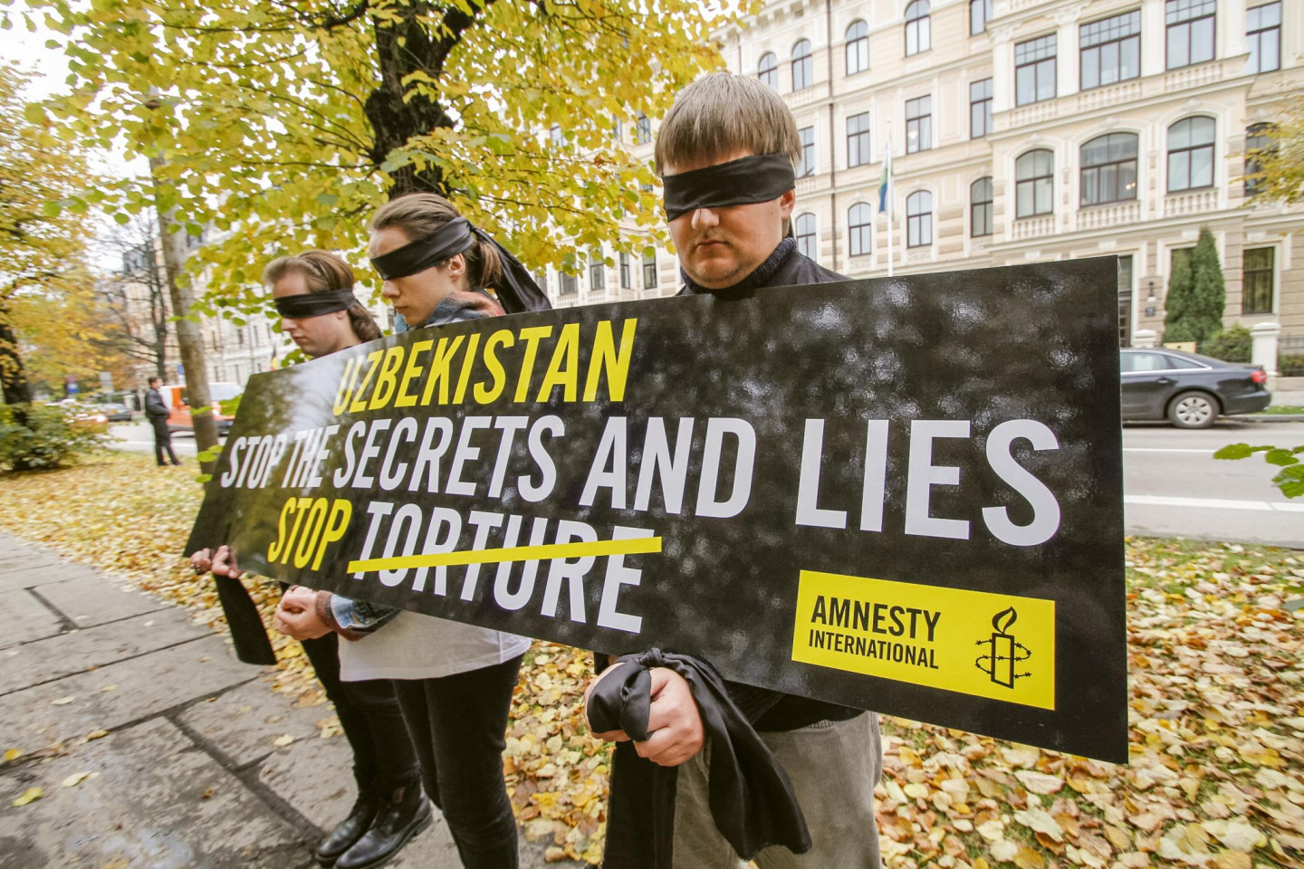 Šodien "Amnesty International" rīkotajā fotoakcijā pie Uzbekistānas vēstniecības četri cilvēki aicina pievērst uzmanību šajā valstī veiktajai spīdzināšanai. Trīs cilvēki ar aizsietām acīm un rokām aptuveni piecas minūtes turēja plakātu ar uzrakstu angļu valodā - "Stop noslēpumiem un meliem. Stop spīdzināšanai Uzbekistānā".