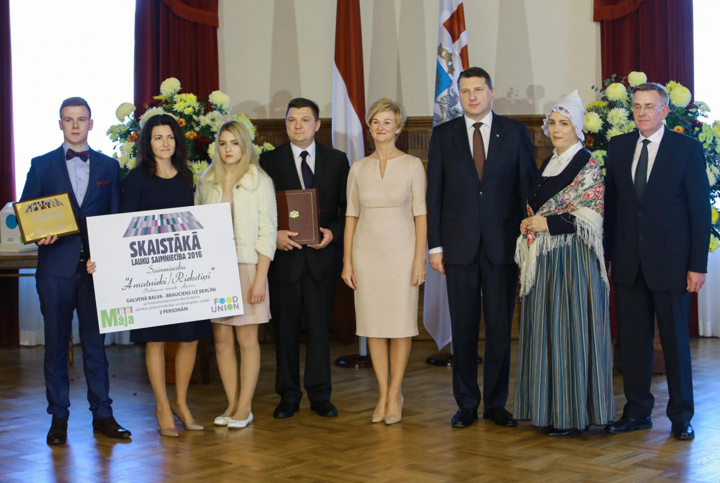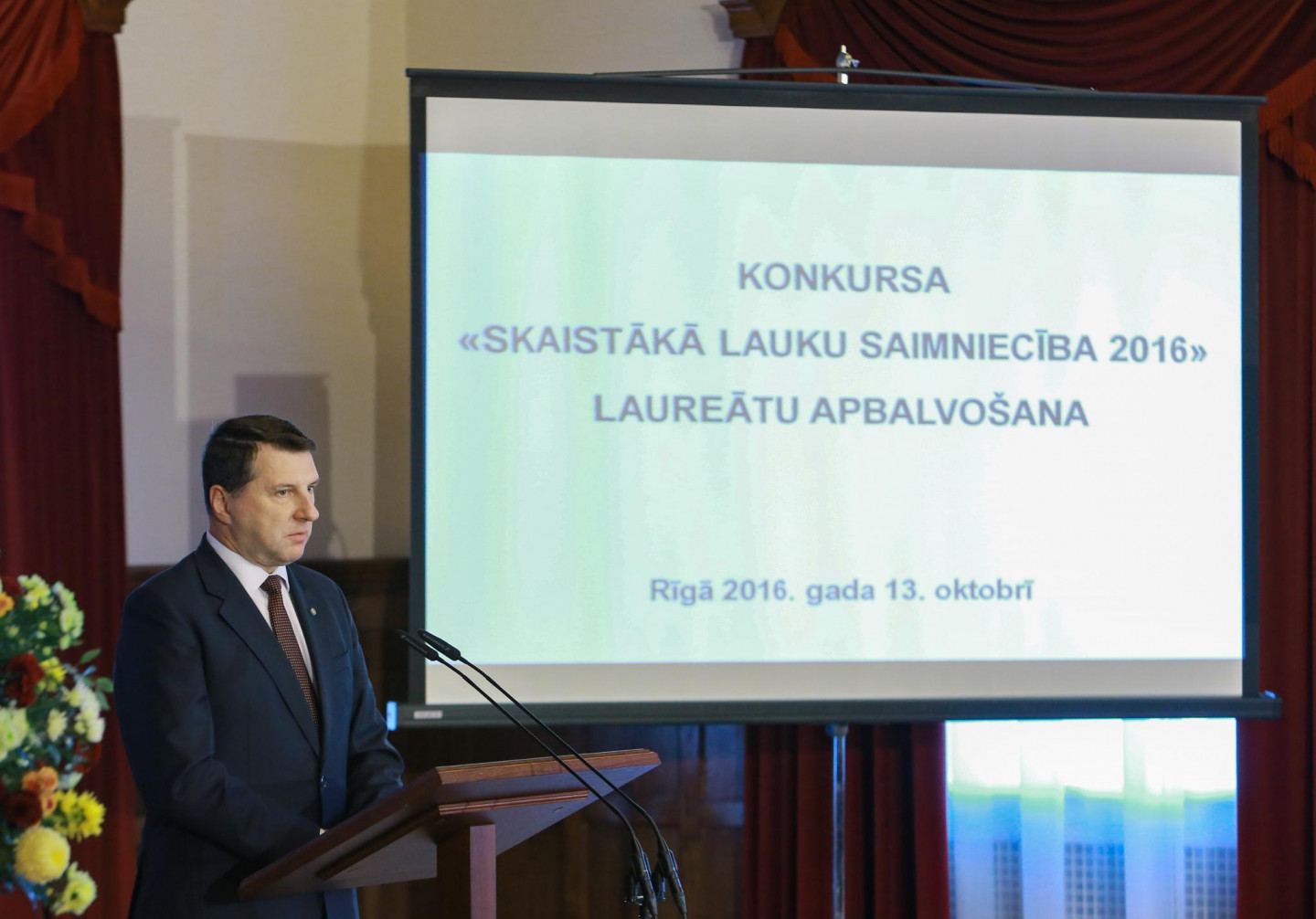 Ceturtdien, 13. oktobrī, Valsts prezidents Raimonds Vējonis pasniedzis balvas konkursa “Skaistākā lauku saimniecība” laureātiem. Šogad par “Skaistāko lauku saimniecību 2016” atzīta Guntara un Jolantas Bartkeviču z/s “Amatnieki/Riekstiņi” Baltinavas novadā. “Food Union” speciālo balvu “Ilgtspējīgākā saimniecība 2016” saņēma Sandras un Viestura Liepiņu saimniecība “Kalndunduri” Krimuldas novadā. Savukārt žurnālā “Ievas Māja” speciālbalvu “Straumēnu gara mantinieki 2016” ieguva Sandras un Imanta Kristovsku saimniecība “Zemturi” Kuldīgas novadā. Konkursā, kura patrons ir Valsts prezidents, tiek izceltas un apbalvotas skaistākās un sakoptākās zemnieku saimniecības Latvijā šajā gadā. “Konkursa "Skaistākā lauku saimniecība" laureāti ar savu darbu parāda, ka jebkurā Latvijas novadā ir iespējams izveidot skaistu saimniecību un tajā sekmīgi darboties. Novēlu, lai jūsu saimniecības plaukst un zeļ, jo tikai tad varēs uzplaukt arī Latvija!,” stāsta Latvijas Valsts prezidents Raimonds Vējonis.