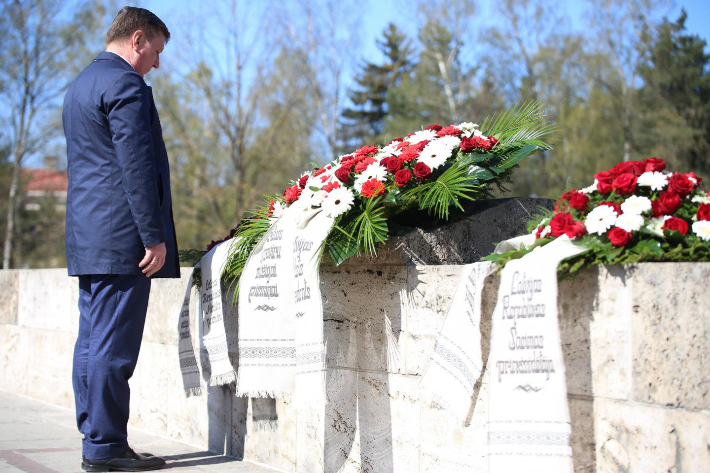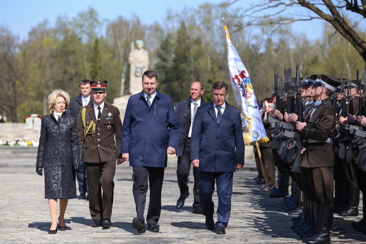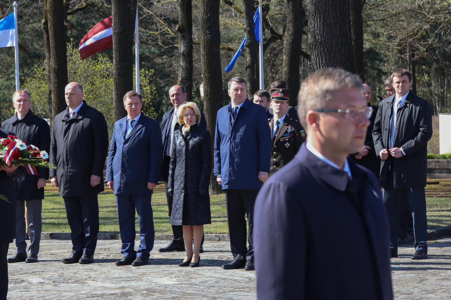 Valsts prezidents Raimonds Vējonis, Saeimas spīkere Ināra Mūrniece un Ministru prezidents Māris Kučinskis šodien piedalījās ziedu nolikšanas ceremonijā Brāļu kapos.