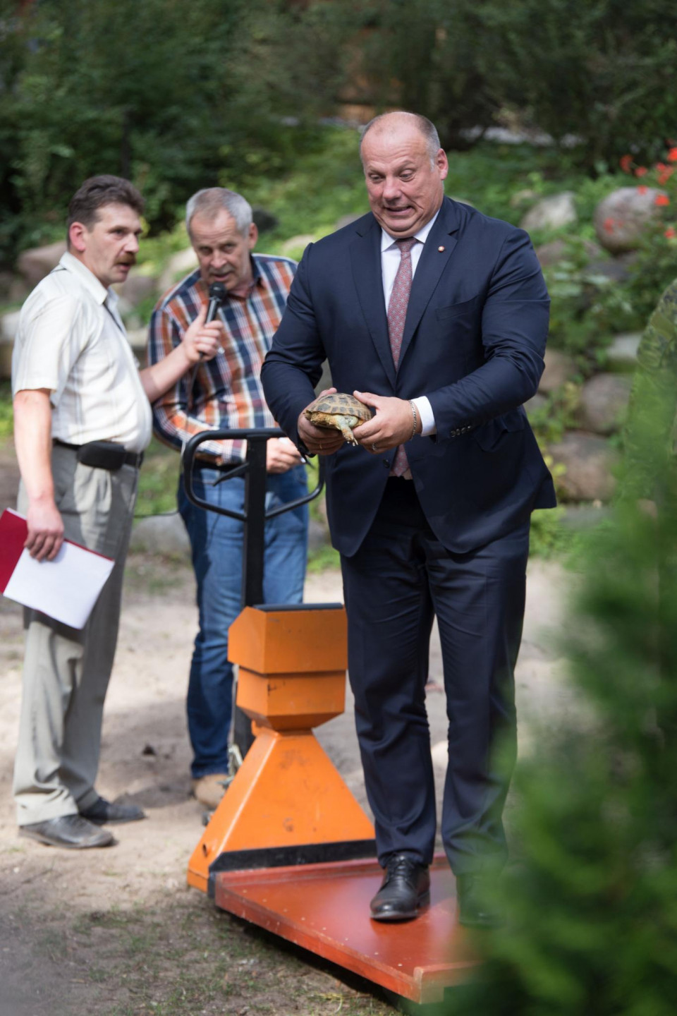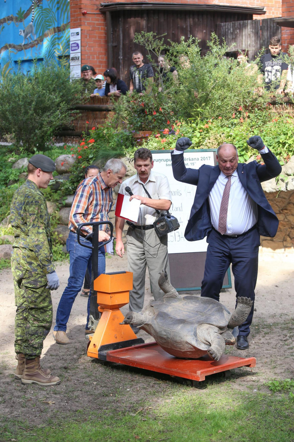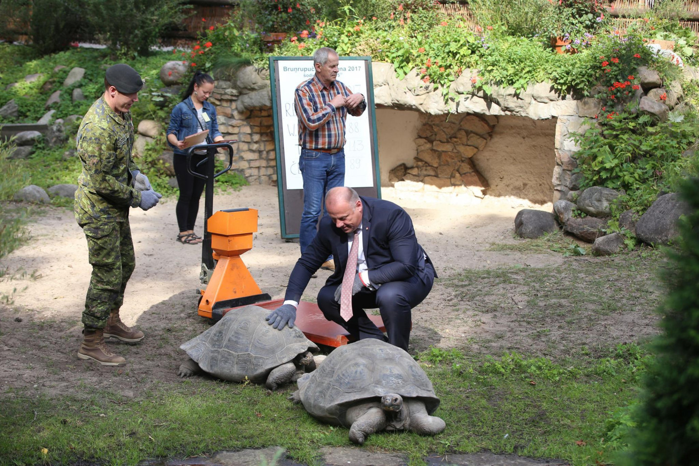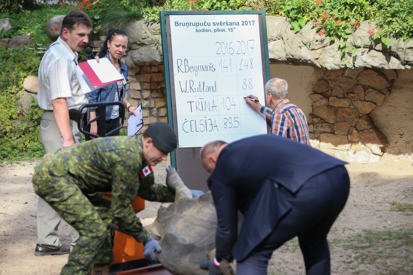 Ceturtdienas pēcpusdienā Rīgas zooloģiskajā dārzā notika tradicionālā bruņurupuču svēršana, kurā kā allaž piedalījās arī aizsardzības ministrs Raimonds Bergmanis.