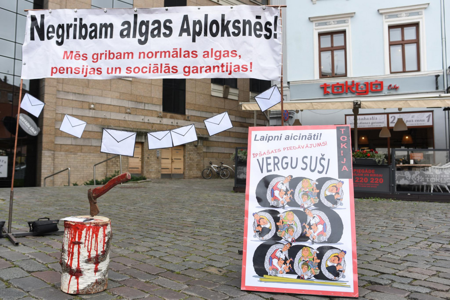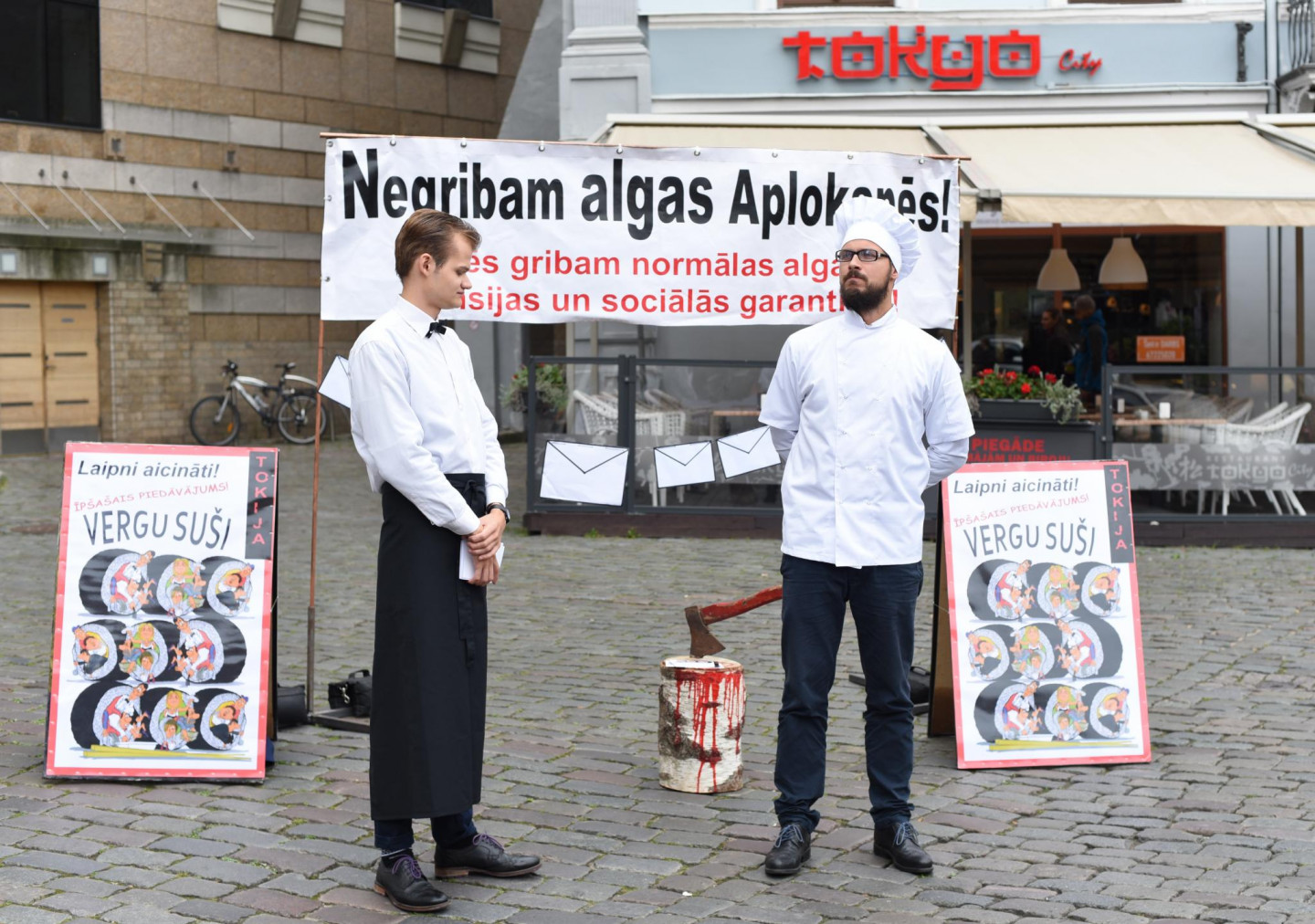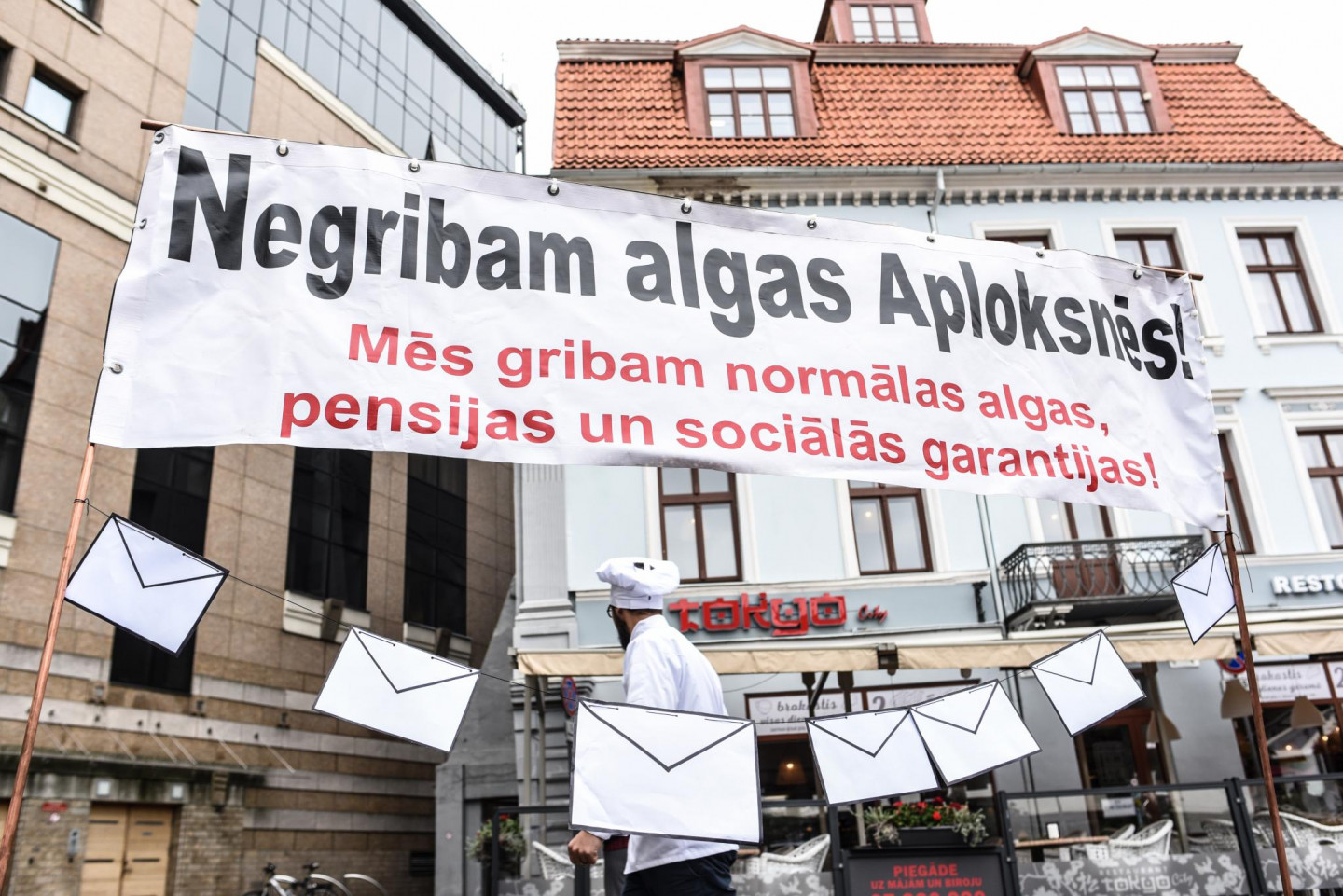 Vecrīgā pie sabiedriskās ēdināšanas uzņēmuma "Tokyo City" ceturtdien noticis pikets pret aplokšņu algām.