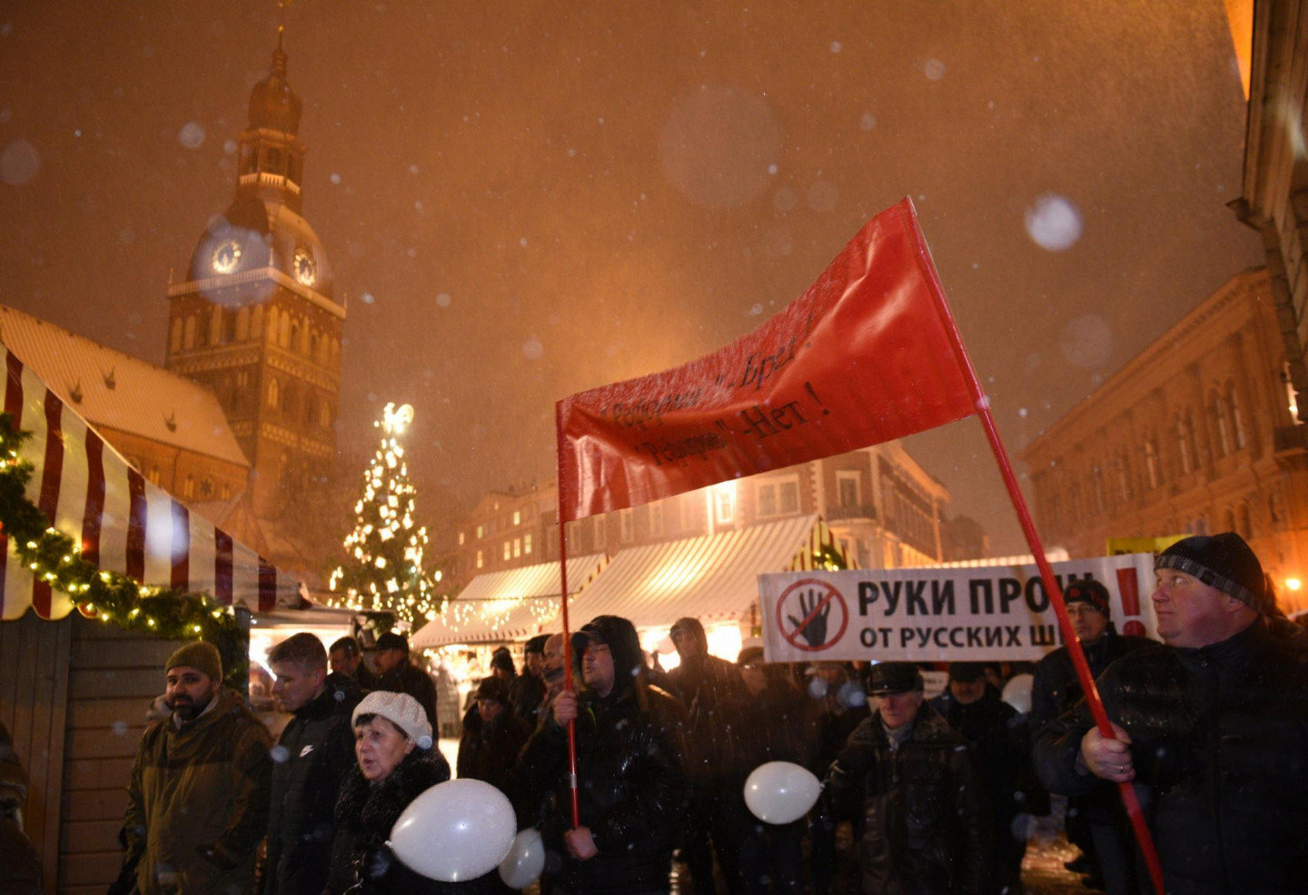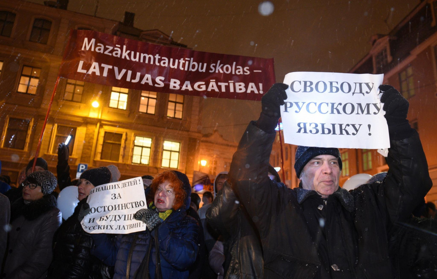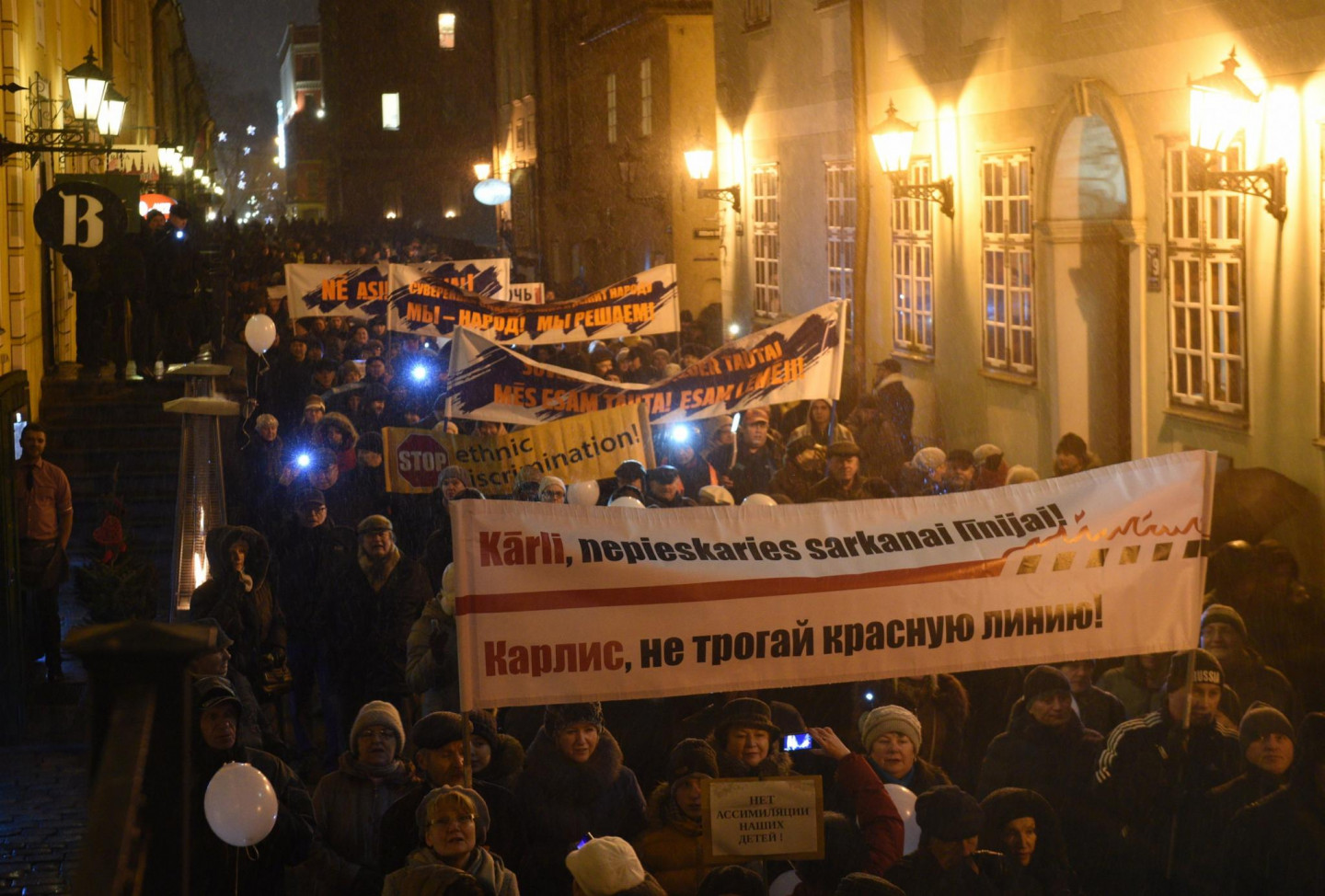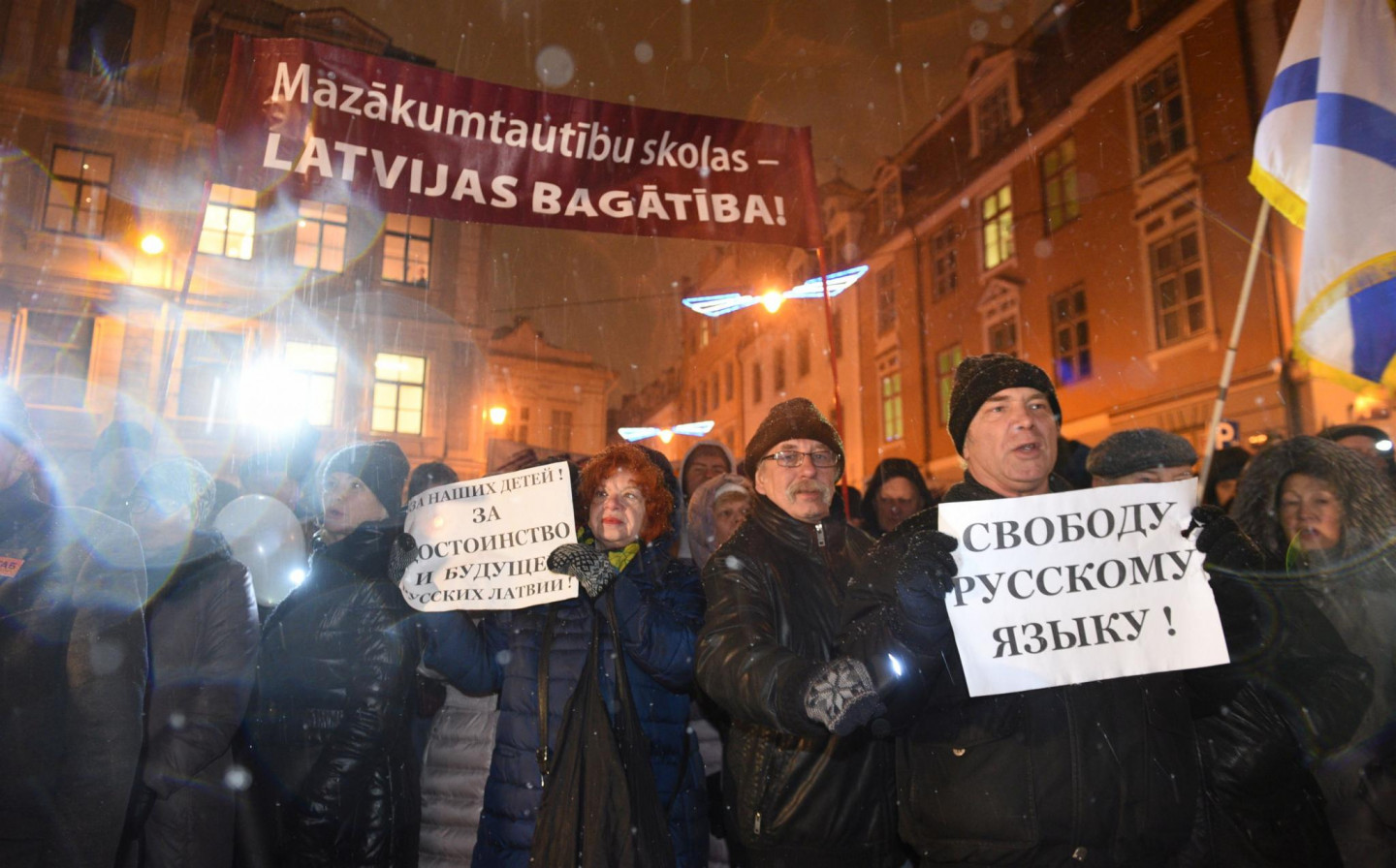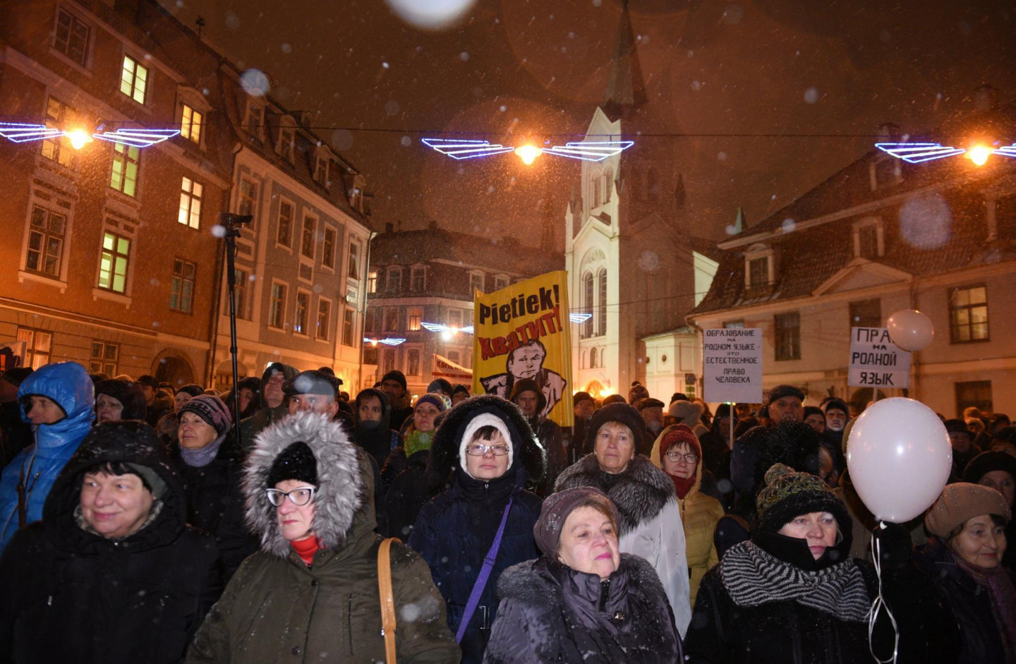 Šodien Rīgā pulcējās vairāki simti cilvēku, kuri protestēja pret to, ka skolās varētu notikt pāreja uz mācībām latviešu valodā.