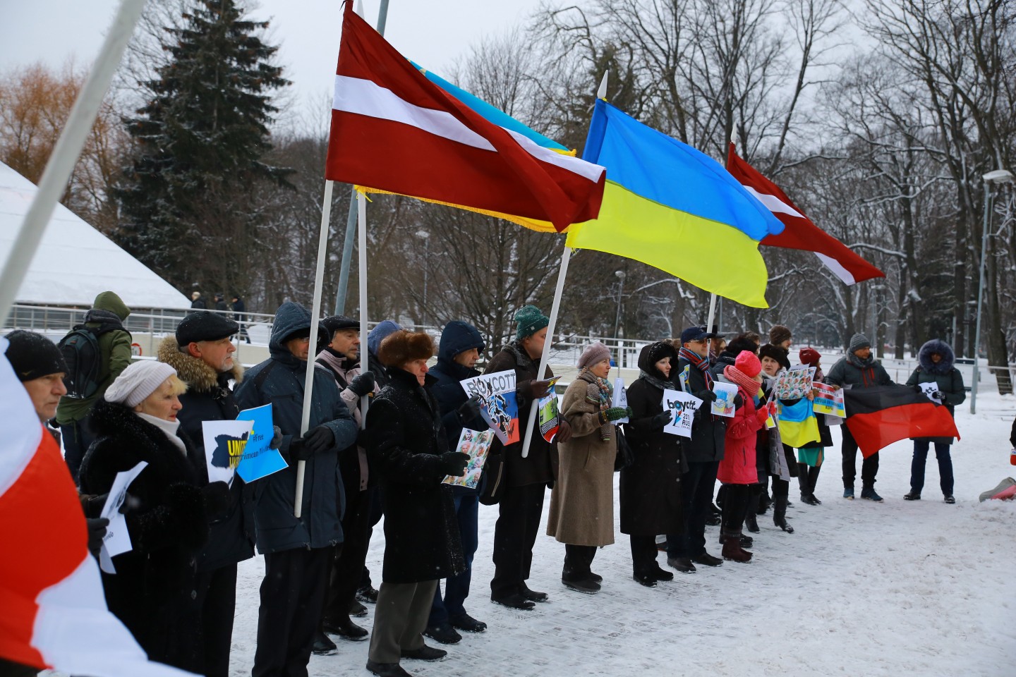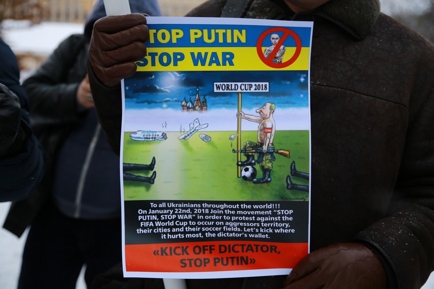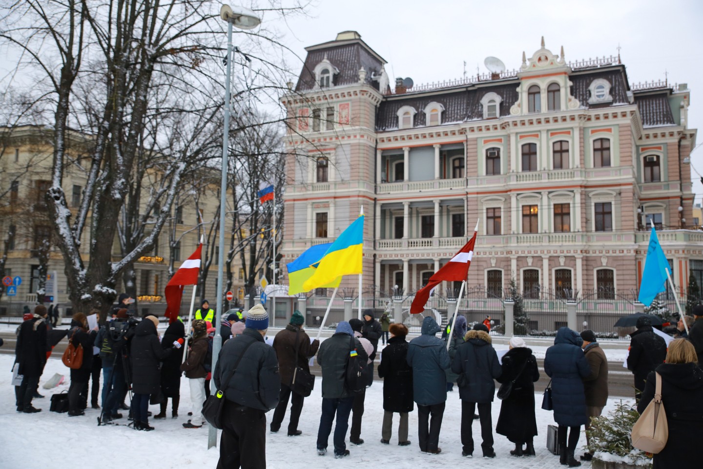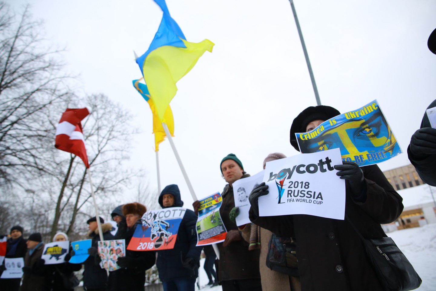 Pie Krievijas vēstniecības Latvijā šovakar aptuveni 20 cilvēki piedalījās protesta akcijā "pret Krievijas agresiju Ukrainā" ar nosaukumu "Stop Putin's War in Ukraine", novēroja aģentūra LETA. Protesta akcijas dalībnieki rokās turēja plakātus, kuros attēlotas gūstā nokļuvušo Ukrainas karavīru acis. Tāpat akcijas dalībnieki aicināja starptautisko sabiedrību boikotēt Krievijā šovasar paredzēto Pasaules kausu futbolā. Plakātos arī aicināts apturēt Krievijas prezidentu Vladimiru Putinu un karu, kā arī atbrīvot Krimas musulmaņus. Akcijas dalībnieki nolasīja manifestu, kurā aicināts starptautisko sabiedrību boikotēt jau pieminēto futbola čempionātu ņemot vērā Krievijas organizēto agresiju Ukrainā.