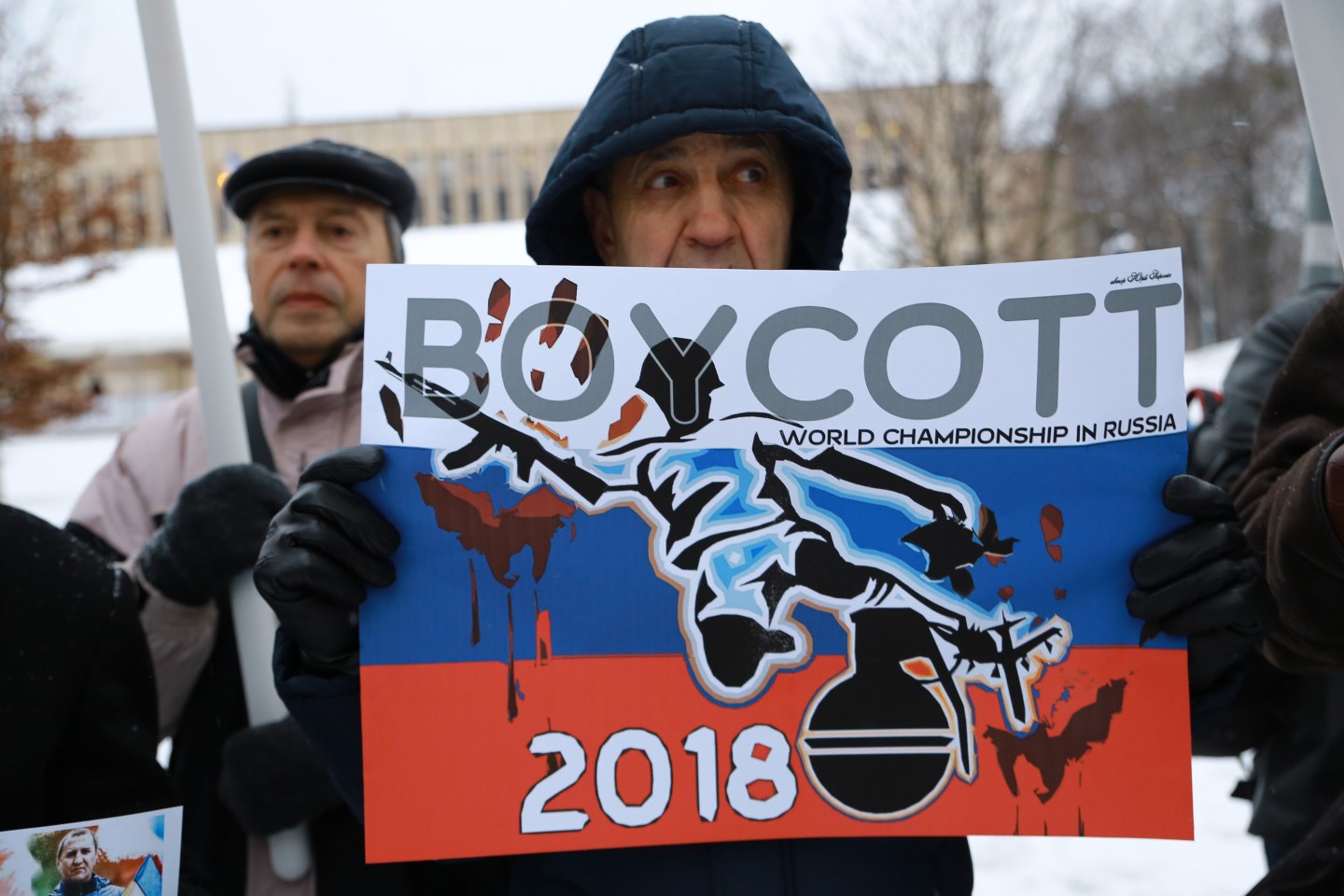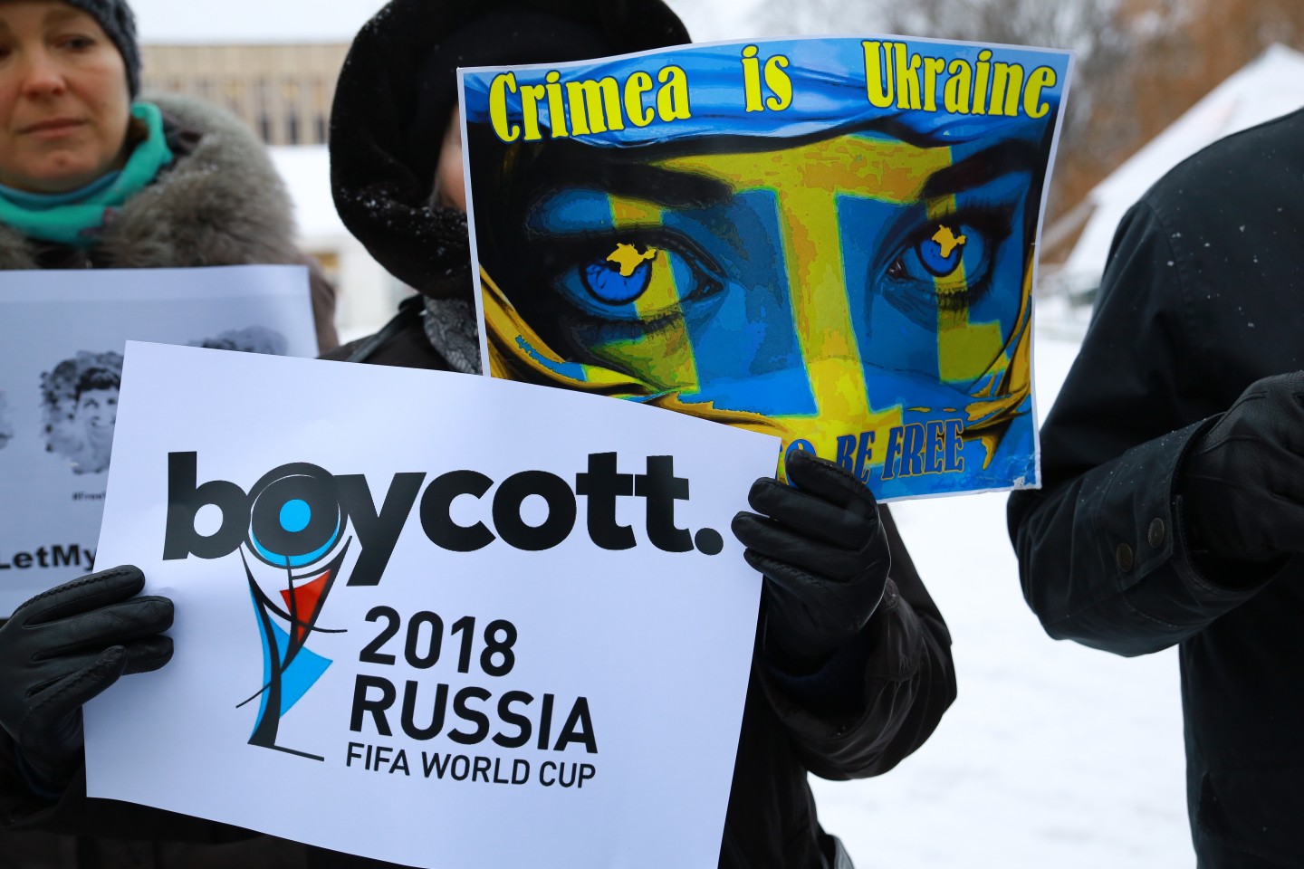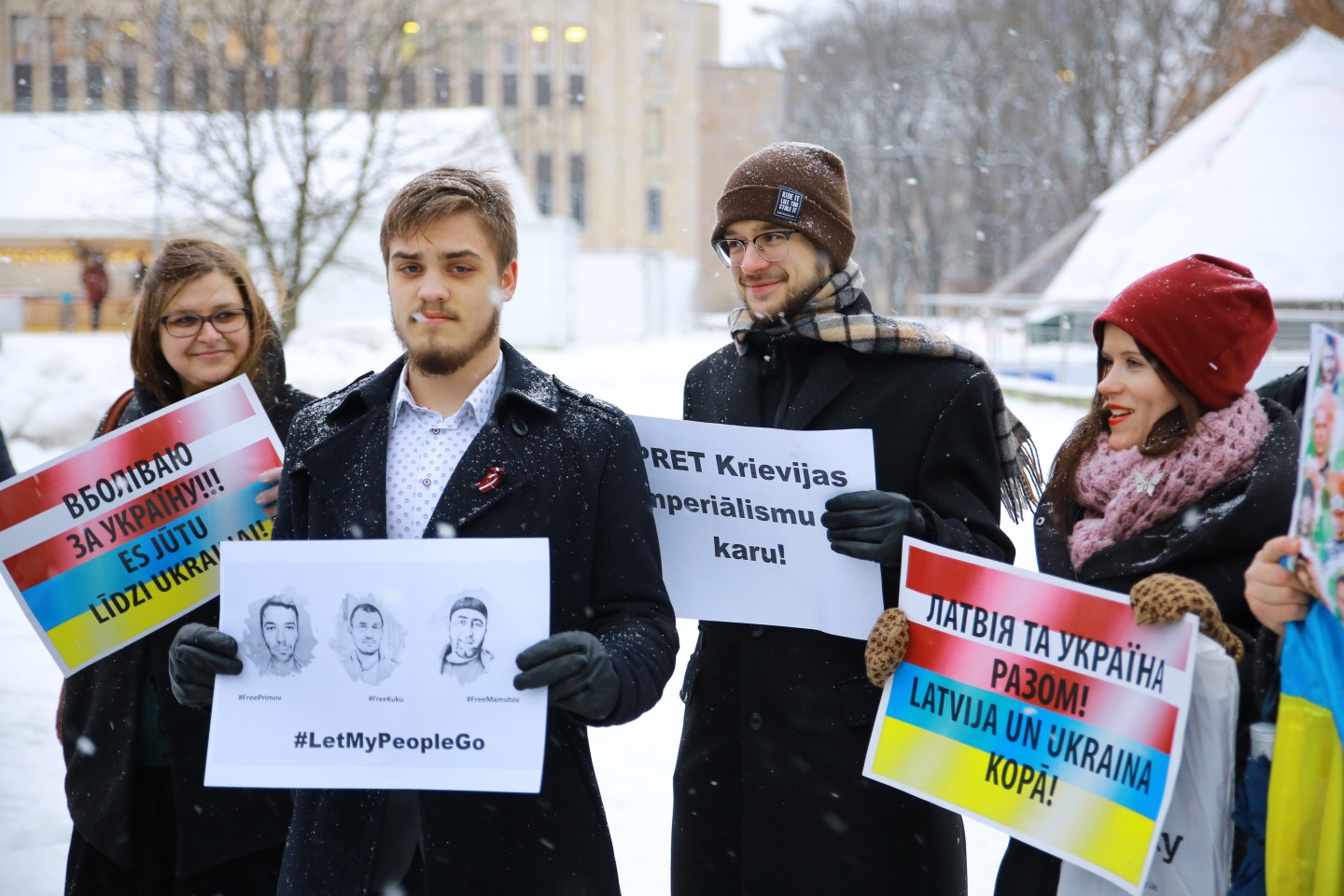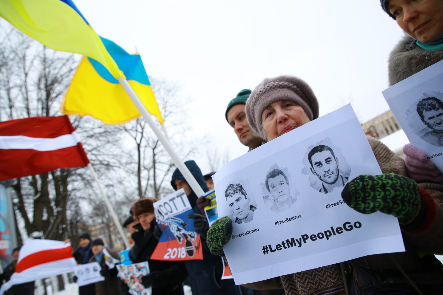 Pie Krievijas vēstniecības Latvijā šovakar aptuveni 20 cilvēki piedalījās protesta akcijā "pret Krievijas agresiju Ukrainā" ar nosaukumu "Stop Putin's War in Ukraine", novēroja aģentūra LETA. Protesta akcijas dalībnieki rokās turēja plakātus, kuros attēlotas gūstā nokļuvušo Ukrainas karavīru acis. Tāpat akcijas dalībnieki aicināja starptautisko sabiedrību boikotēt Krievijā šovasar paredzēto Pasaules kausu futbolā. Plakātos arī aicināts apturēt Krievijas prezidentu Vladimiru Putinu un karu, kā arī atbrīvot Krimas musulmaņus. Akcijas dalībnieki nolasīja manifestu, kurā aicināts starptautisko sabiedrību boikotēt jau pieminēto futbola čempionātu ņemot vērā Krievijas organizēto agresiju Ukrainā.