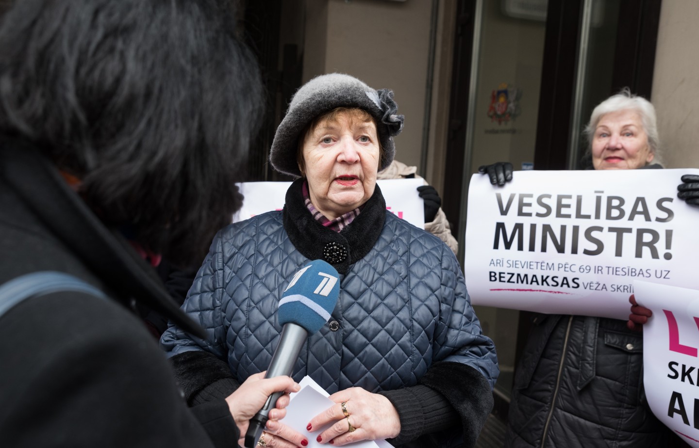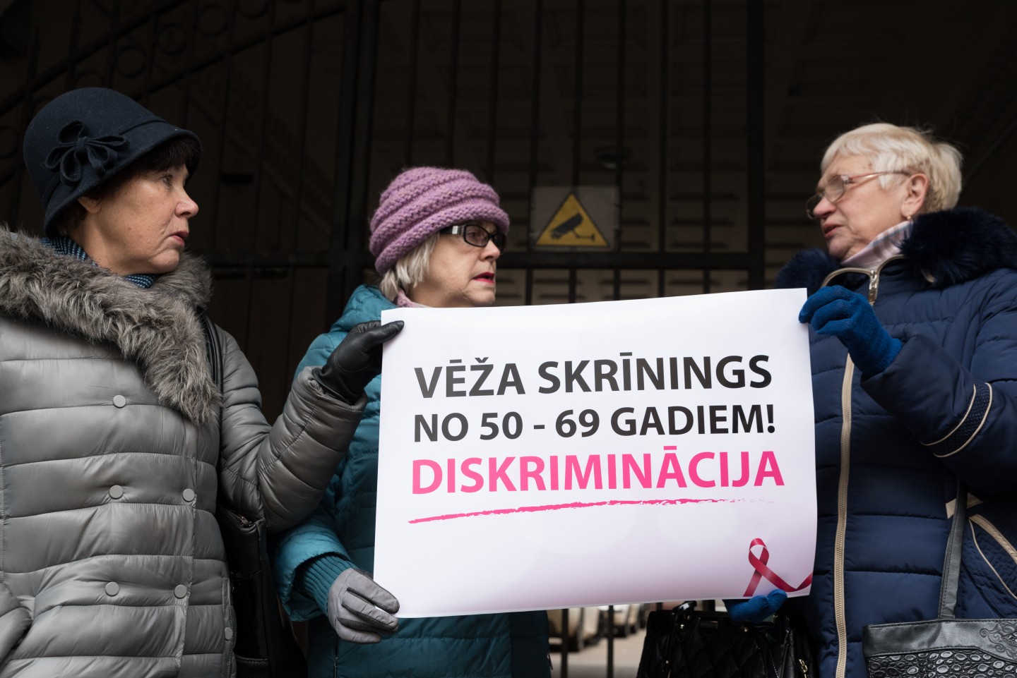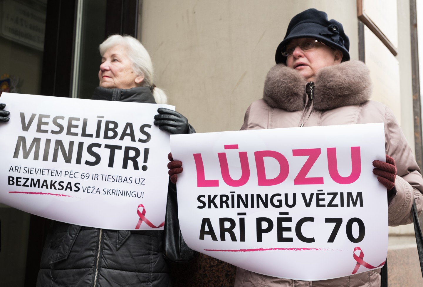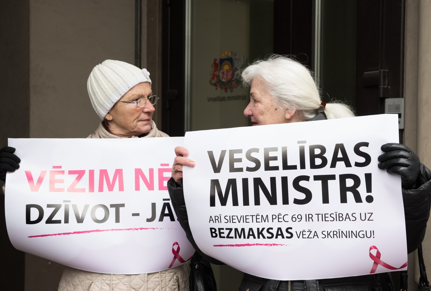Pie Veselības ministrijas Rīgā vairākas aktīvas seniores rīkoja zibakciju par vienlīdzīgu un taisnīgu valsts attieksmi pret senioriem, atceļot vecuma ierobežojumus bezmaksas vēža skrīniga saņemšanai.