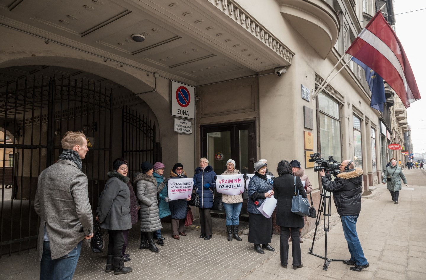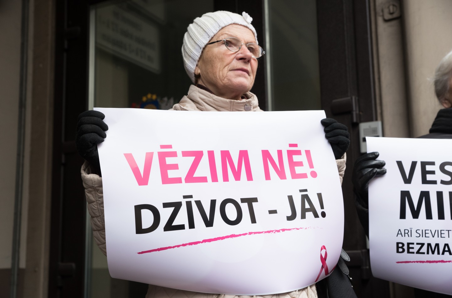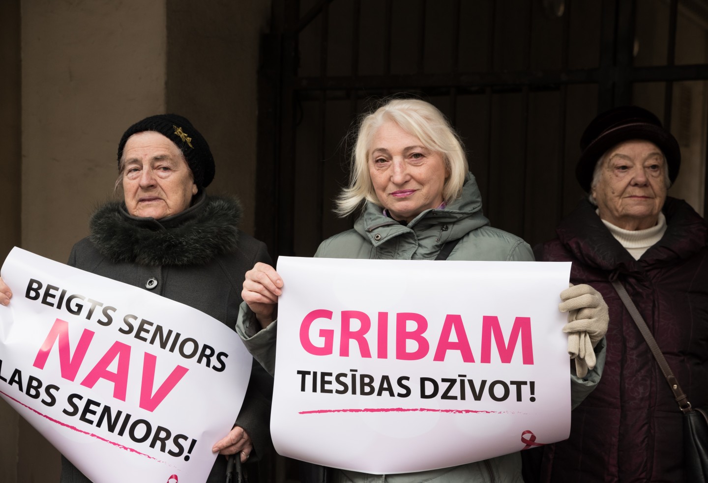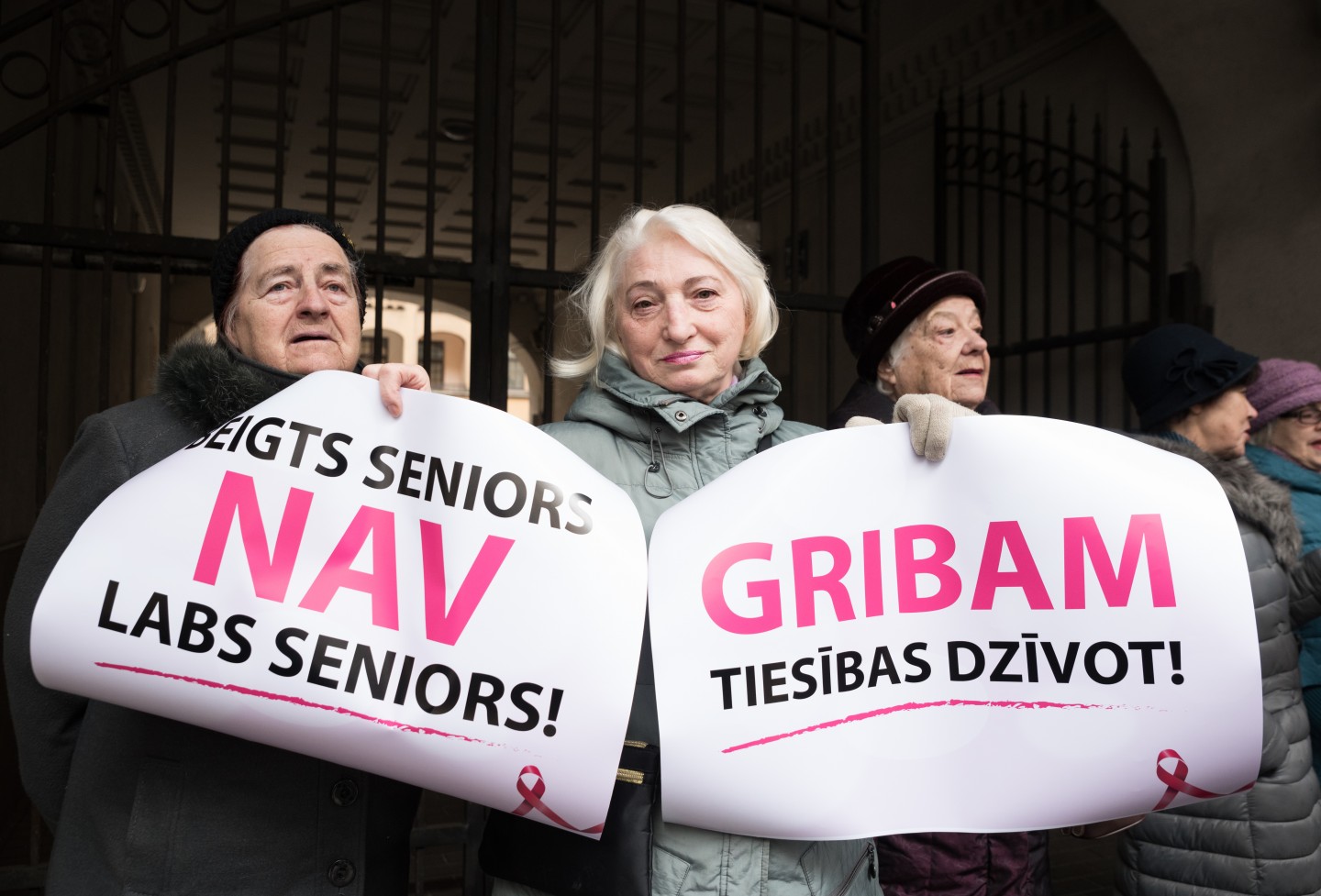 Pie Veselības ministrijas Rīgā vairākas aktīvas seniores rīkoja zibakciju par vienlīdzīgu un taisnīgu valsts attieksmi pret senioriem, atceļot vecuma ierobežojumus bezmaksas vēža skrīniga saņemšanai.