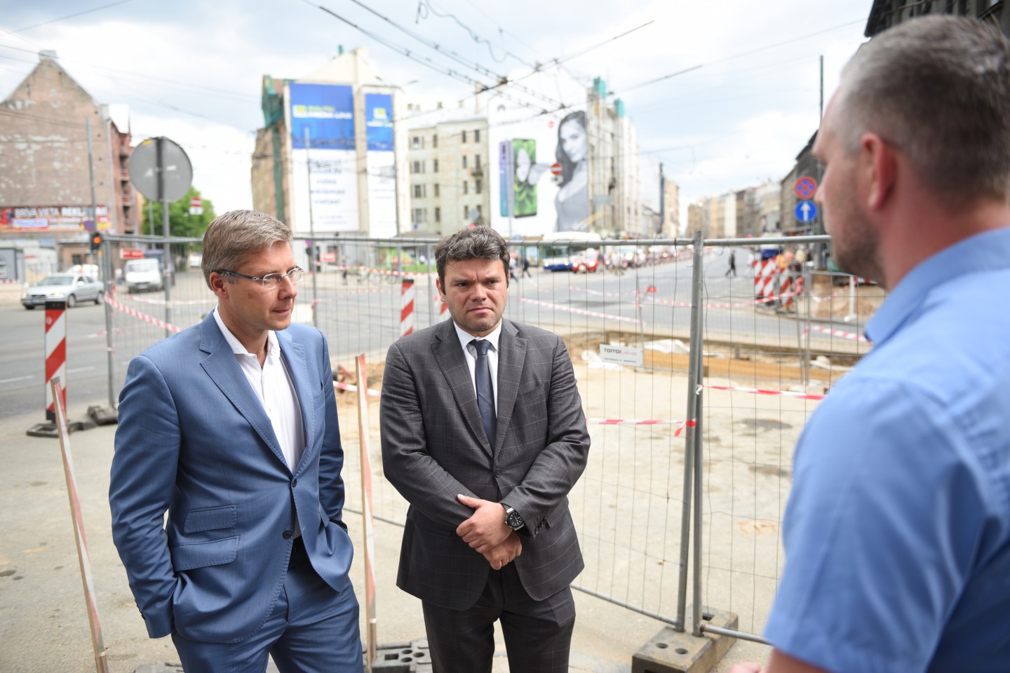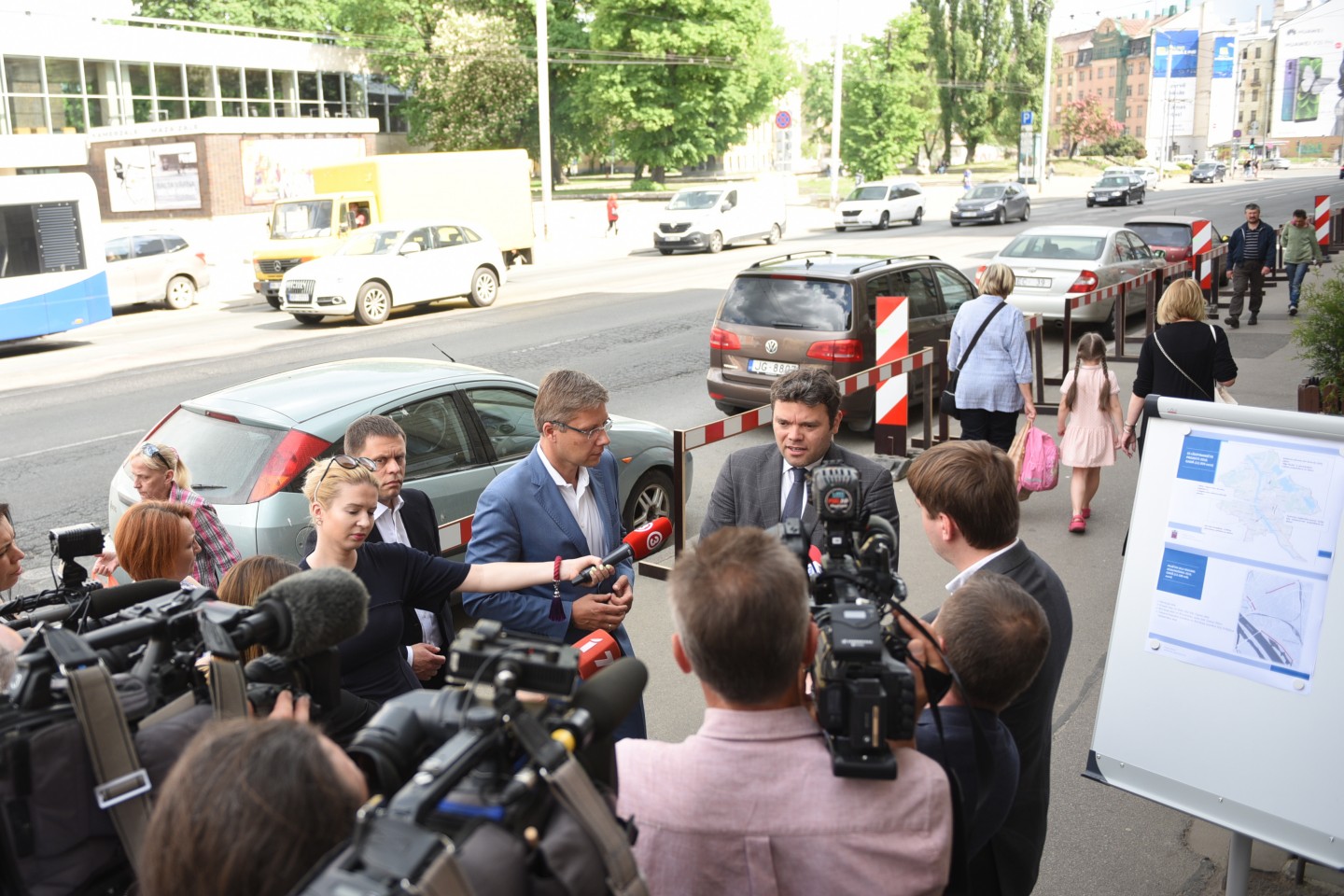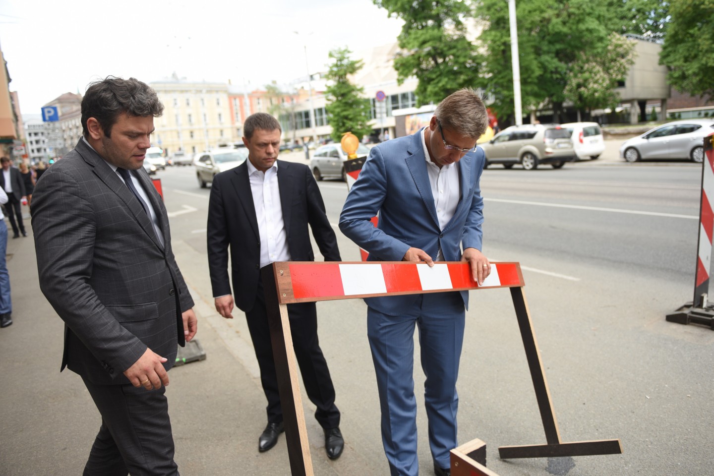 Rīgas domes priekšsēdētājs Nils Ušakovs un Satiksmes departamenta direktora p.i. Emīls Jakrins ceturtdien apmeklēja būvdarbu vietu Brīvības ielā, kur šonedēļ sākas brauktuves remontdarbi.