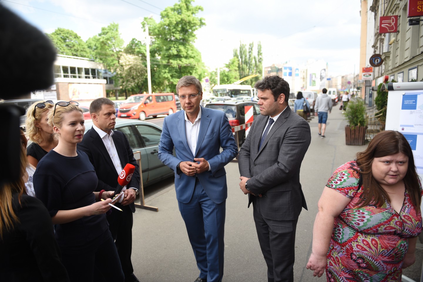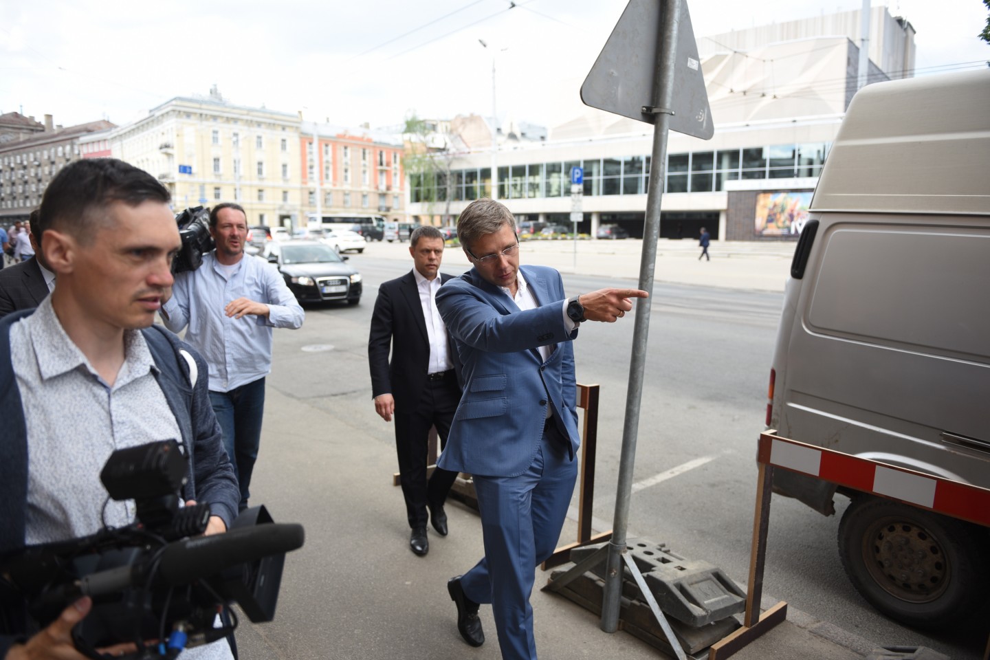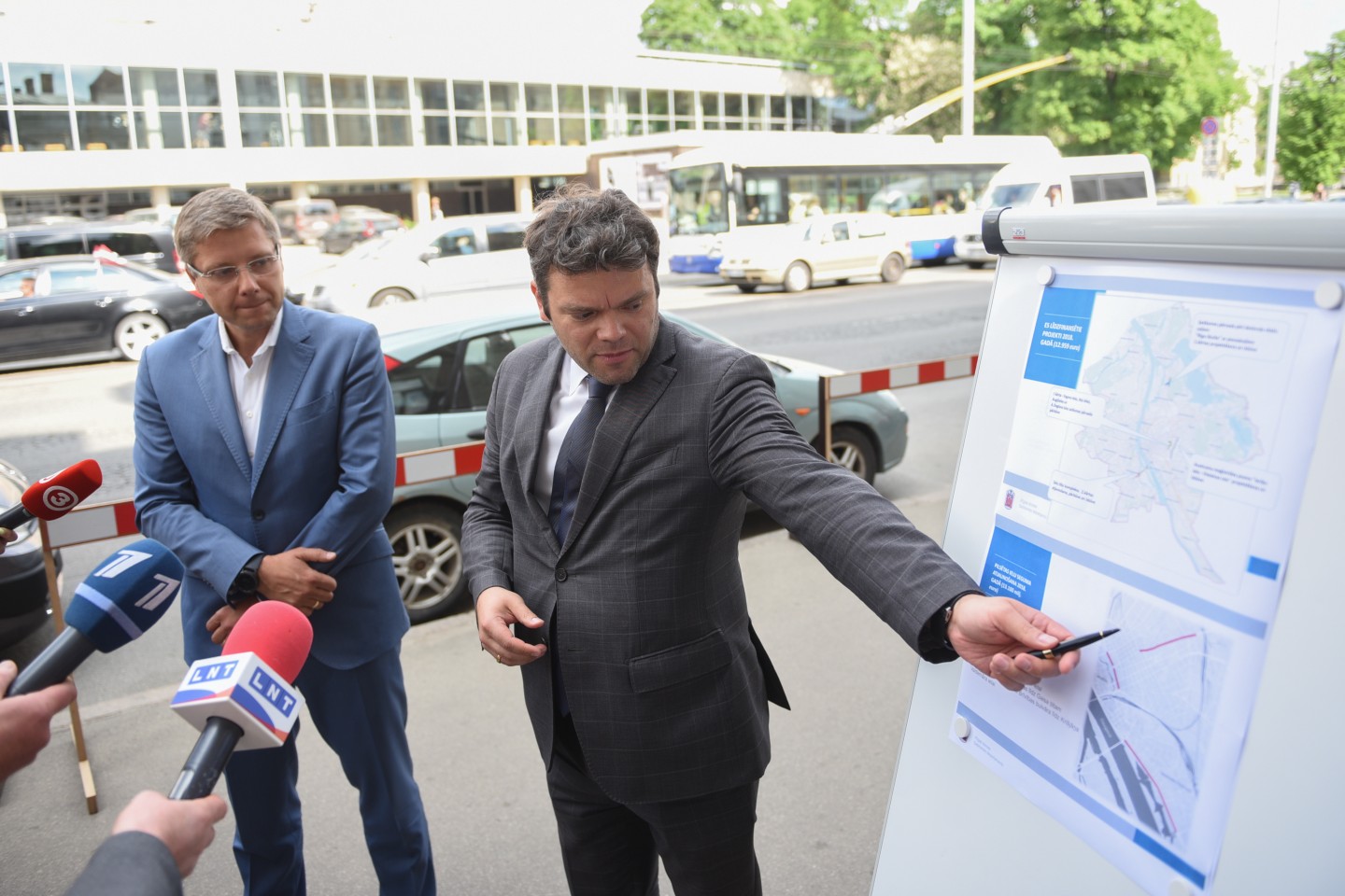 Rīgas domes priekšsēdētājs Nils Ušakovs un Satiksmes departamenta direktora p.i. Emīls Jakrins ceturtdien apmeklēja būvdarbu vietu Brīvības ielā, kur šonedēļ sākas brauktuves remontdarbi.