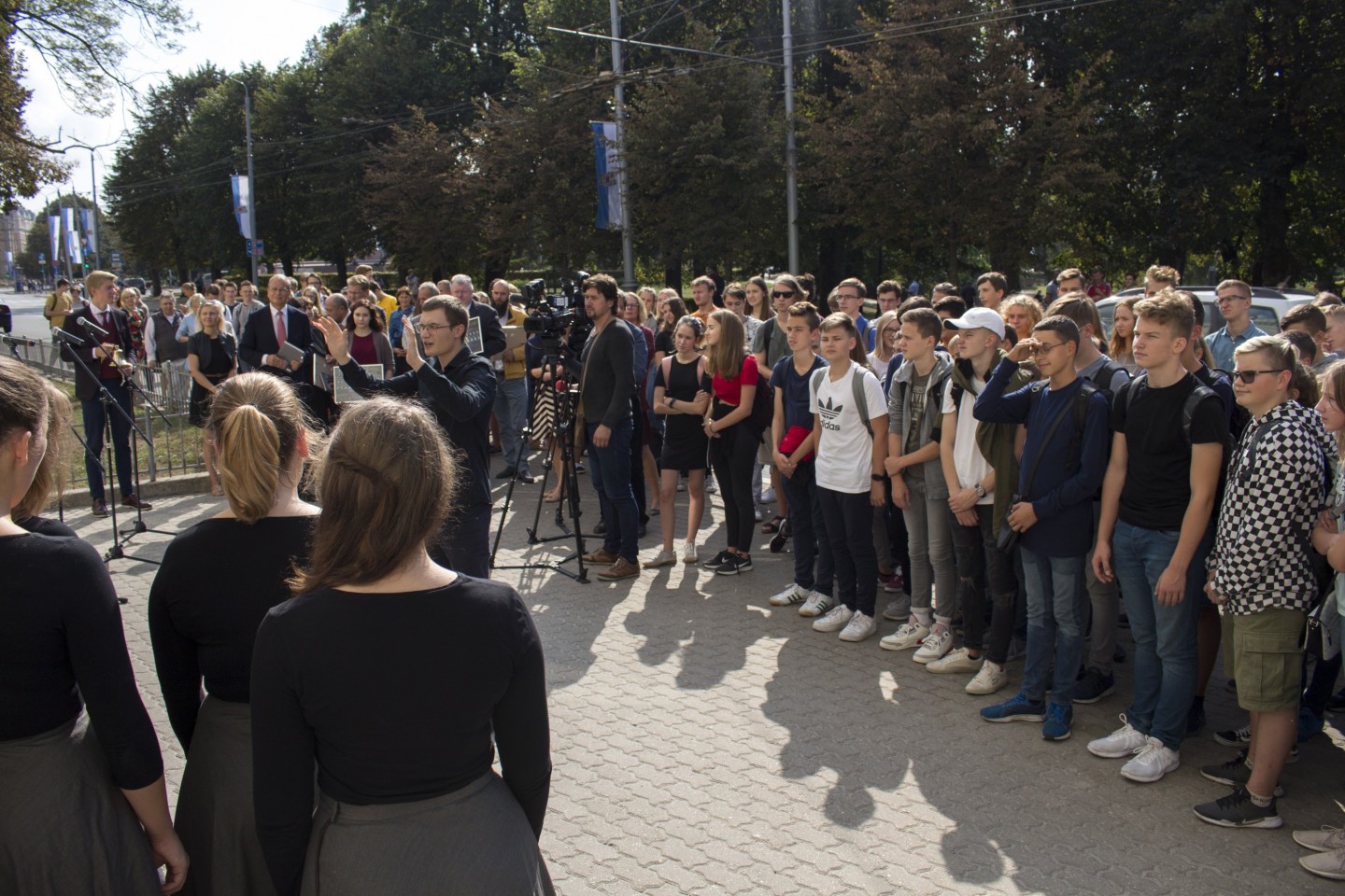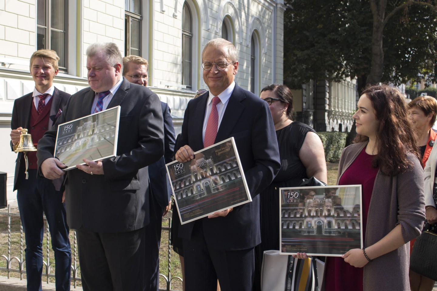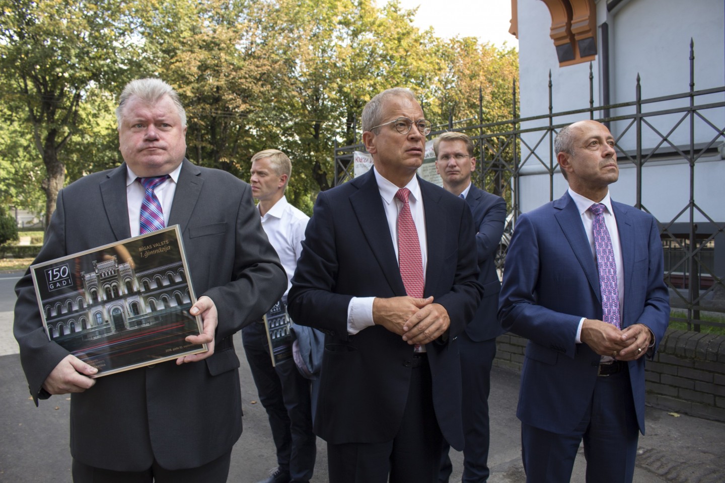 Svinīgi atklāta atjaunotā Rīgas Valsts 1. ģimnāzijas ēkas vēsturiskā fasāde.