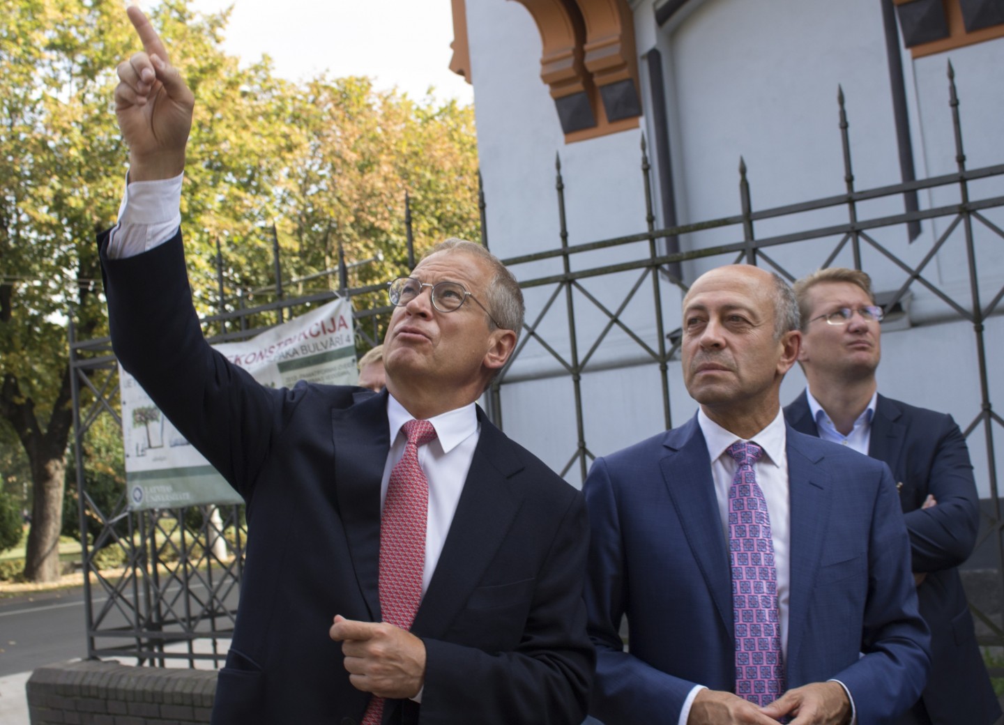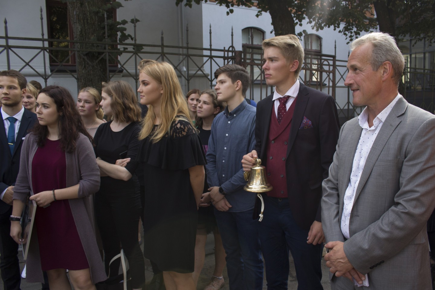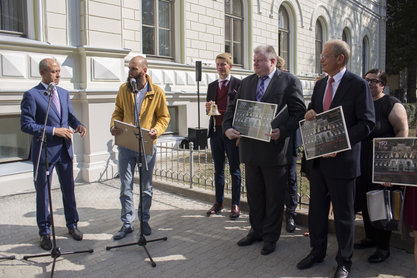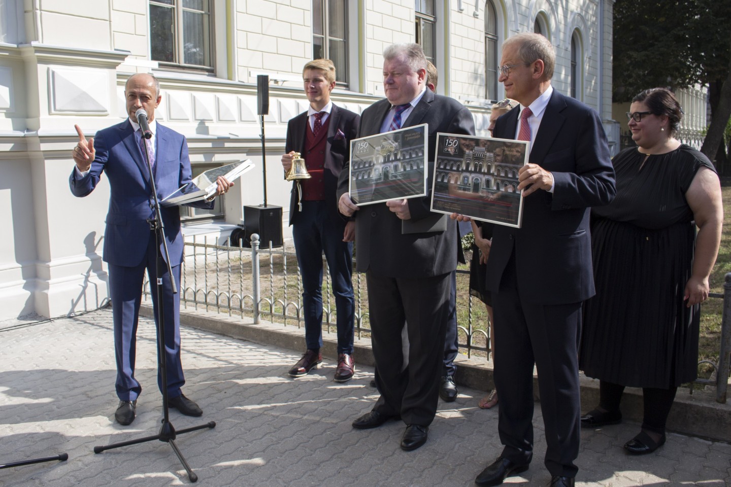 Svinīgi atklāta atjaunotā Rīgas Valsts 1. ģimnāzijas ēkas vēsturiskā fasāde.